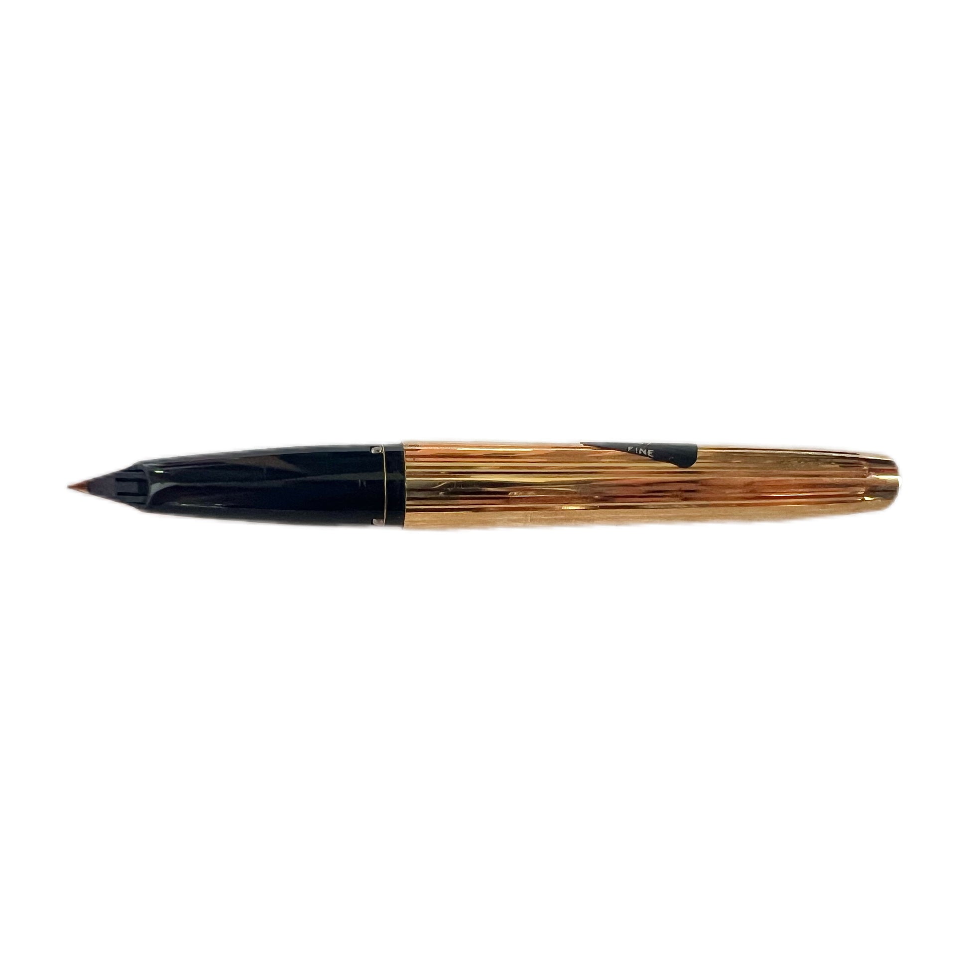 Here we have an elegant vintage 1970s Sheaffer Imperial fountain pen, model number 797. Beautifully made with a 23k electroplated gold cap and body with a fluted design. The nib is a fine 14k v-inlay nib, indicating the superb quality of the high-end Imperial line. Engraved with the Canadian Imperial Bank of Commerce logo to body.