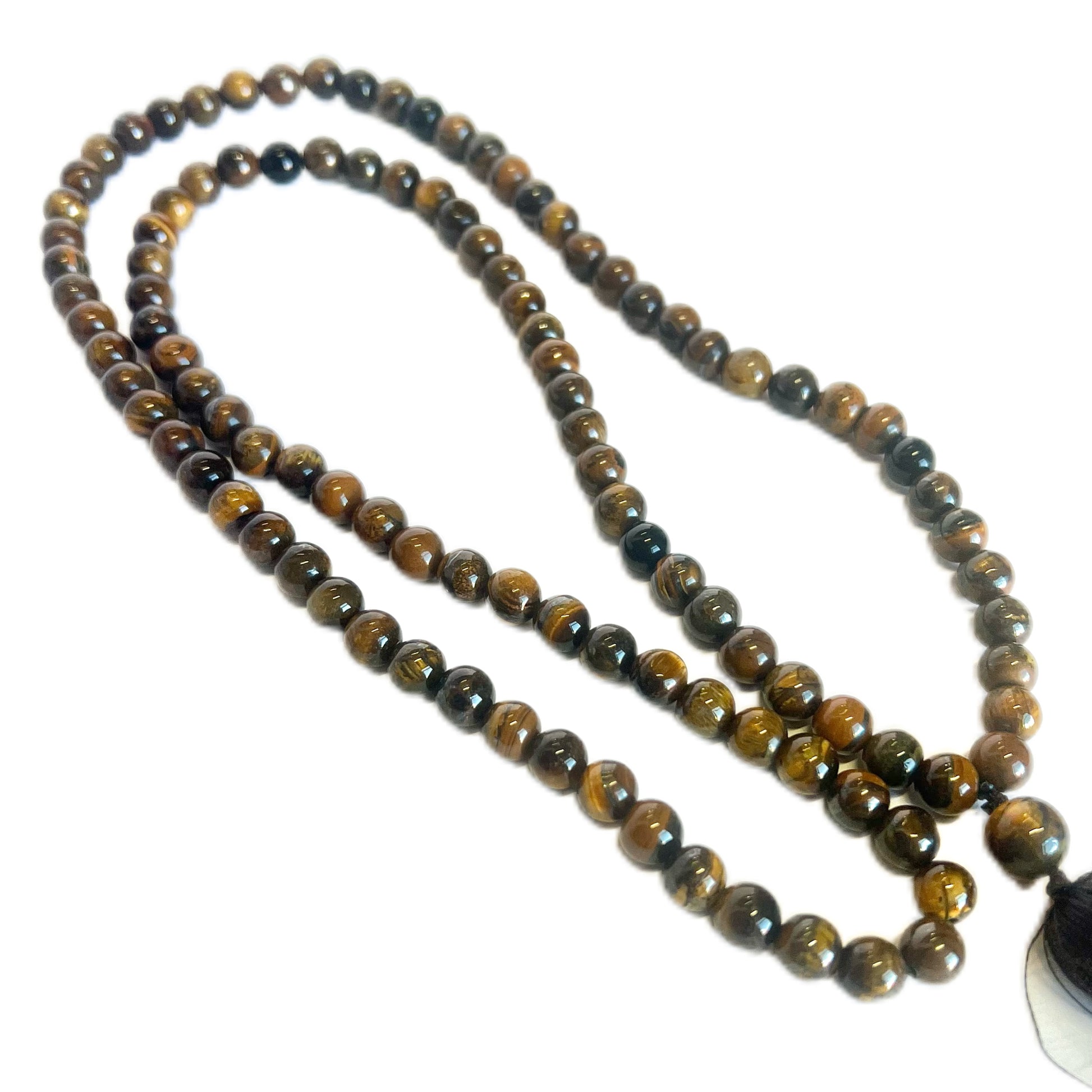 Beautiful vintage jasper and tiger’s eye mala necklace with silk tassel. Nicely tumbled and displaying the lustrousness that tiger’s eye is known for. Tiger’s eye has been prized for centuries as a talisman against evil.
