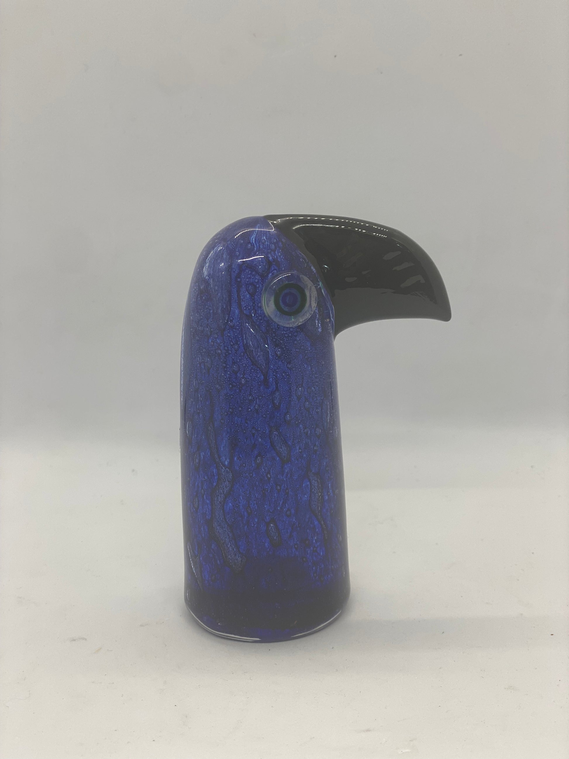 Precioso vidrio artístico italiano de cobalto estilo Murano. Una encantadora cabeza de loro figurativa, posiblemente un Macao, con hermosas texturas y matices.