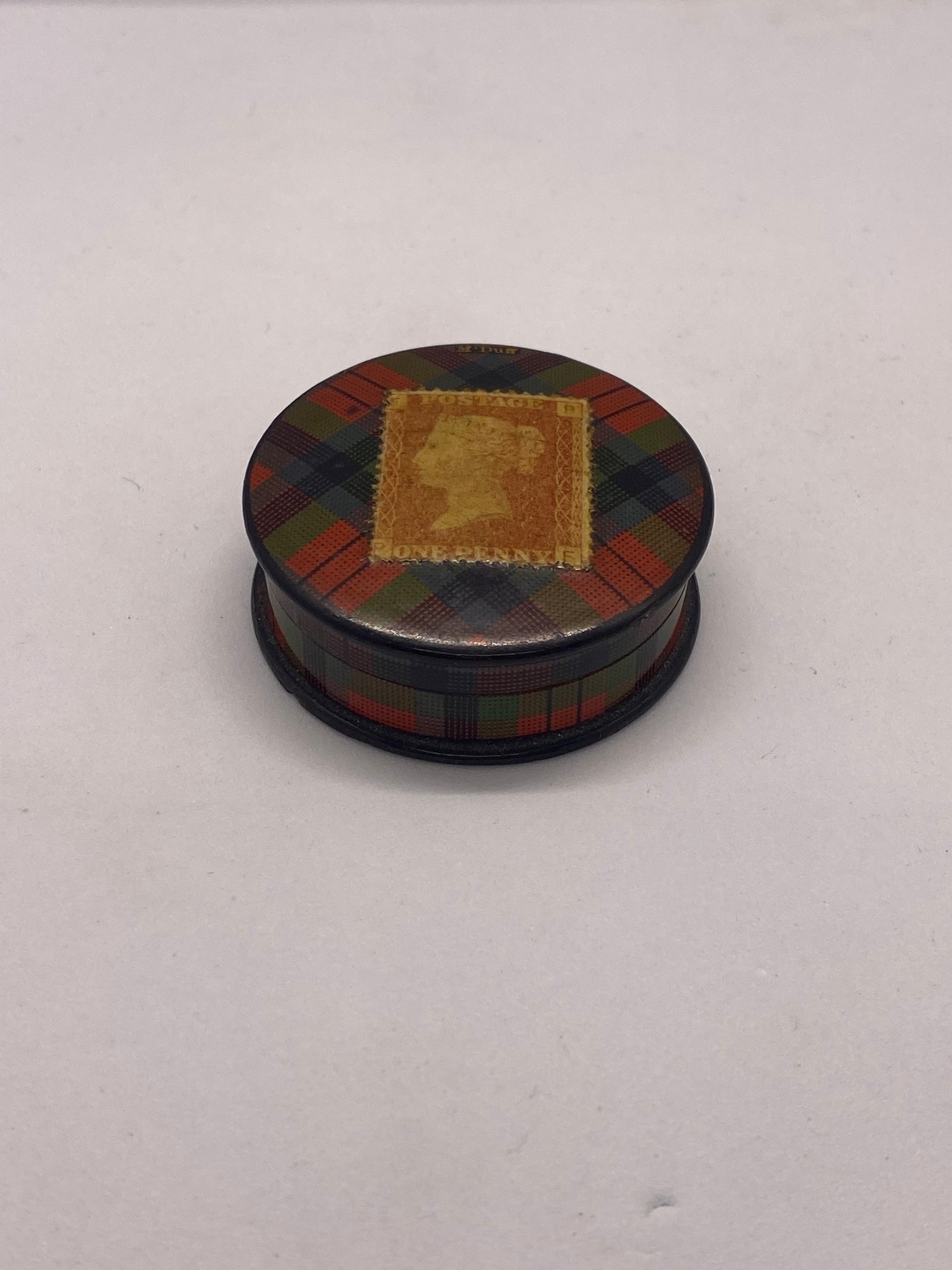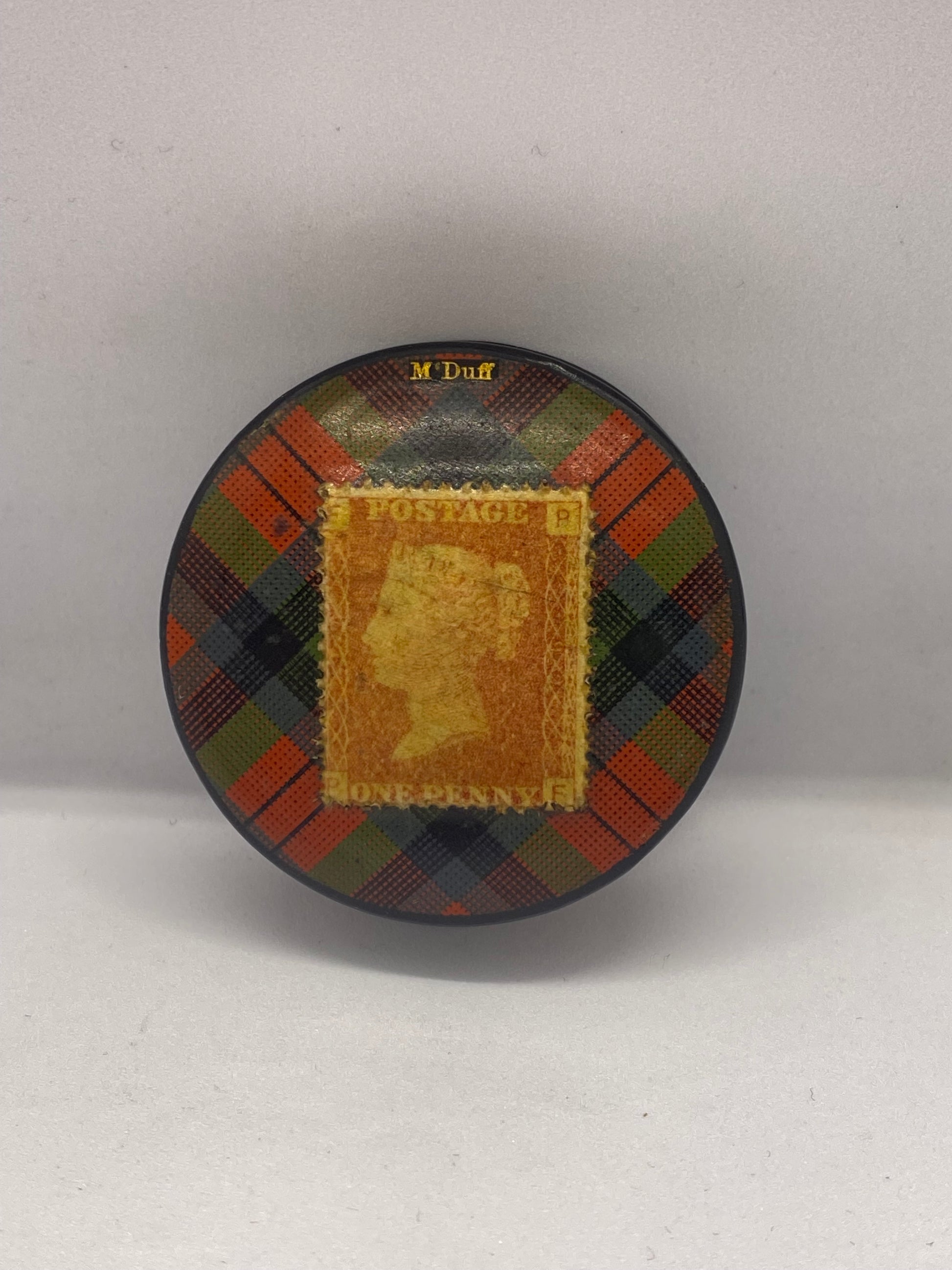 A Caja de sellos de loza escocesa de mediados a finales del siglo XIX, decorada con un peculiar sello victoriano de Penny Red. El sello de Penny Red sucedió al sello de Penny Black en 1841 y estuvo en circulación hasta 1879, lo que sitúa la caja en este período. Perfecto para pequeños adornos o recuerdos. La marquetería está en buen estado. Esta combinación de tartán y decoupage es muy atractiva, y encontramos otro ejemplar por 180 £ (sin incluir gastos de envío ni IVA).