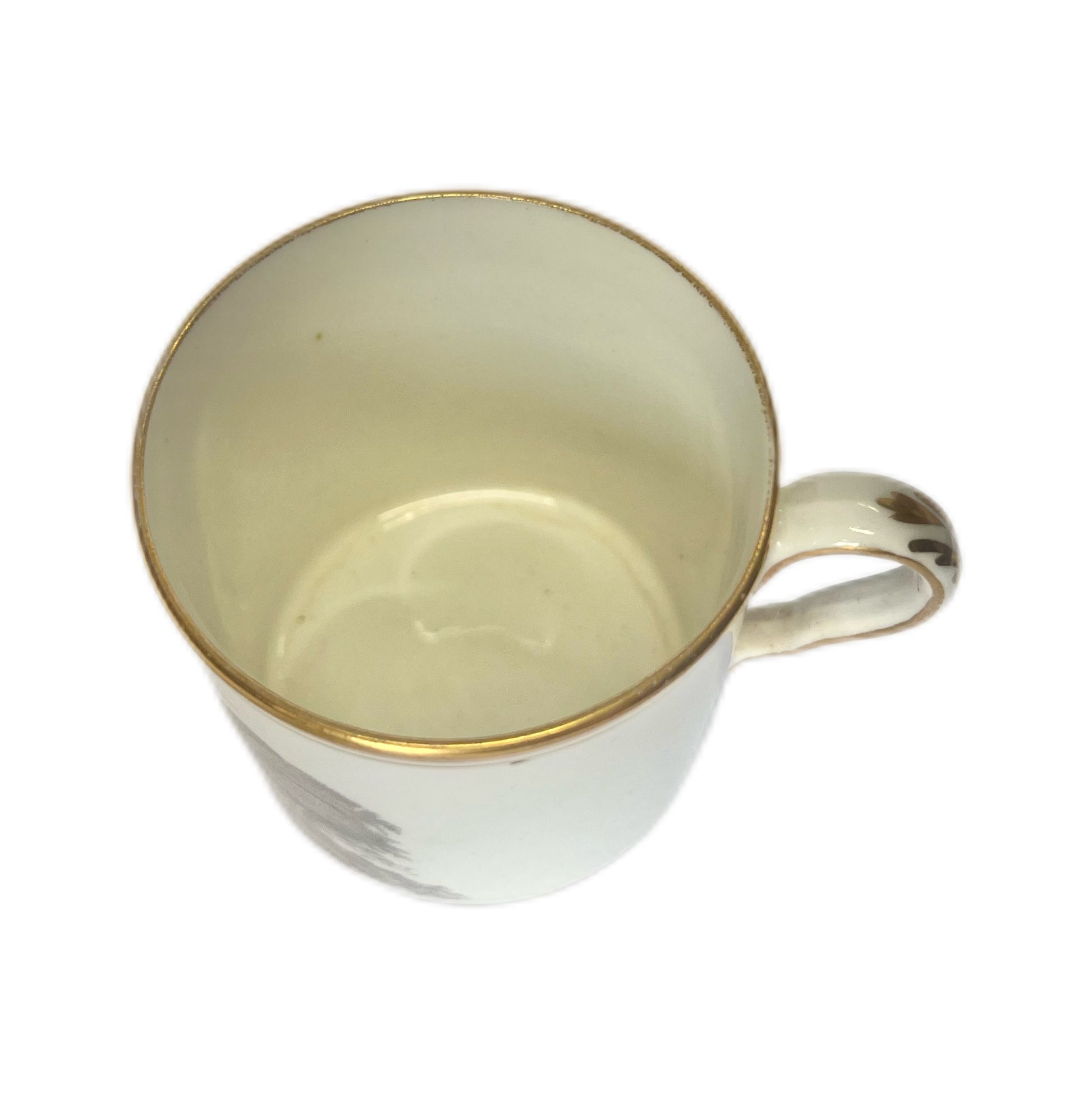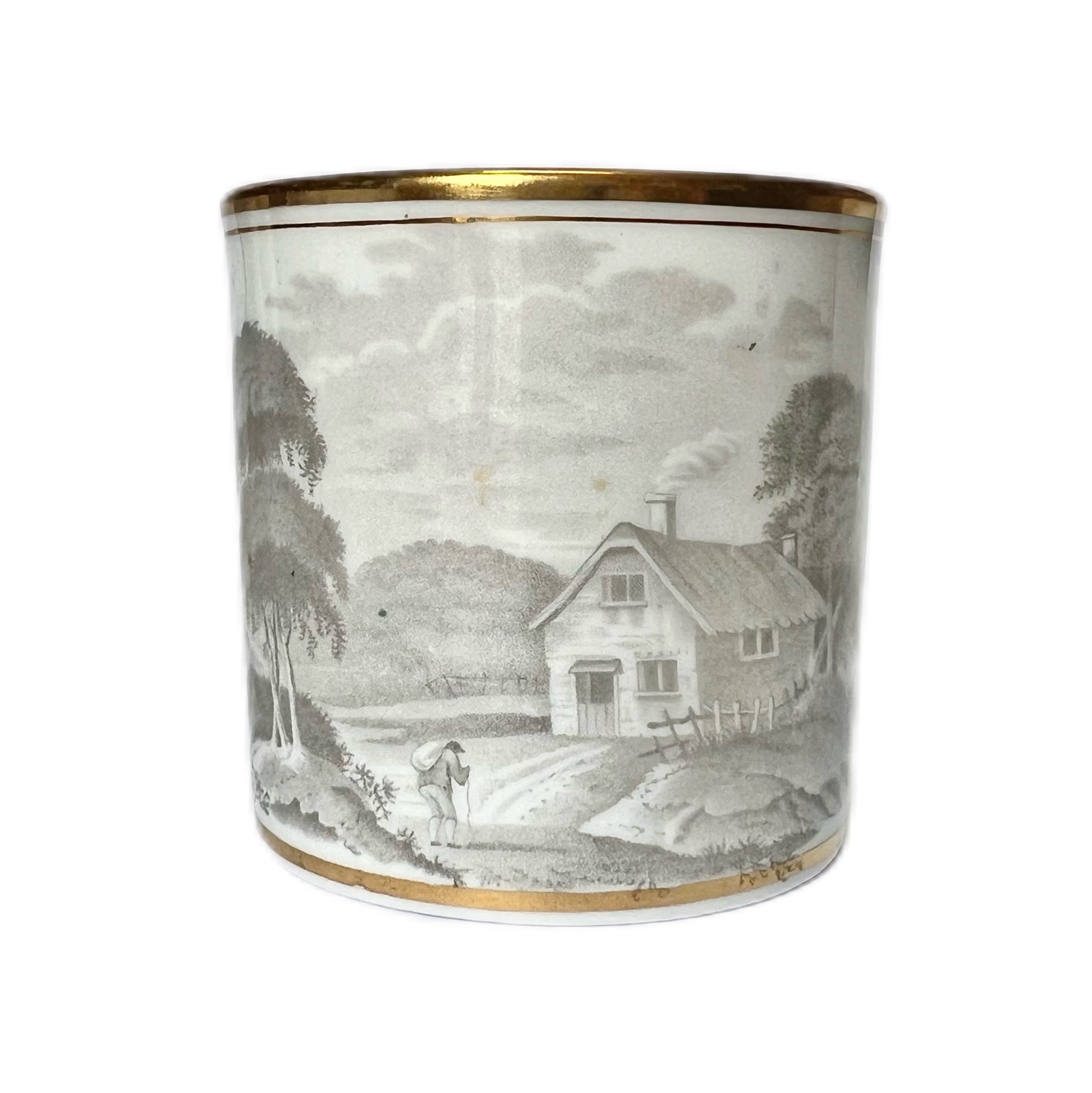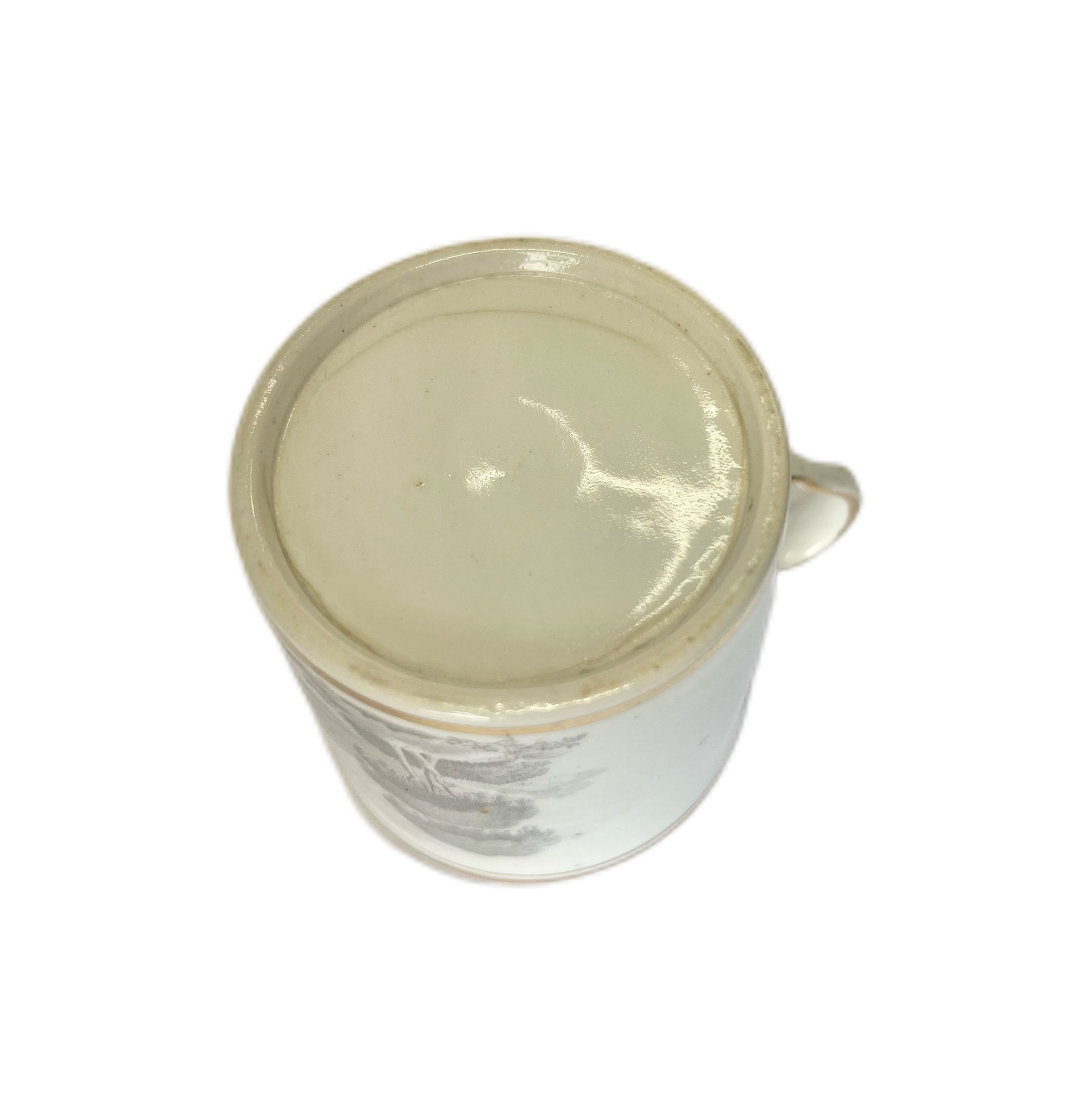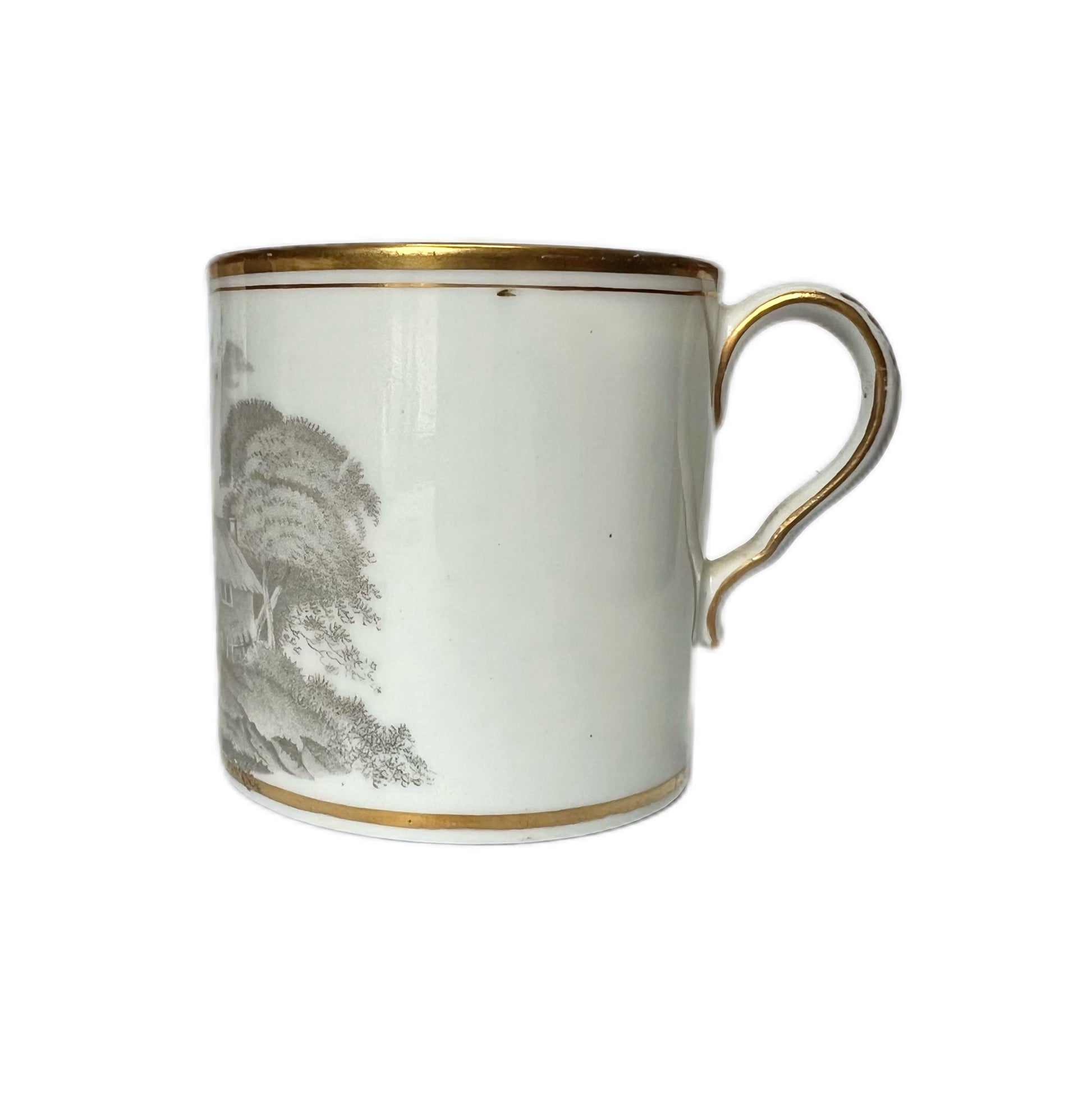 Beautifully executed transfer ware scene of the English countryside to body of coffee can, richly gilded border trim to top and bottom of coffee can as well as handle.