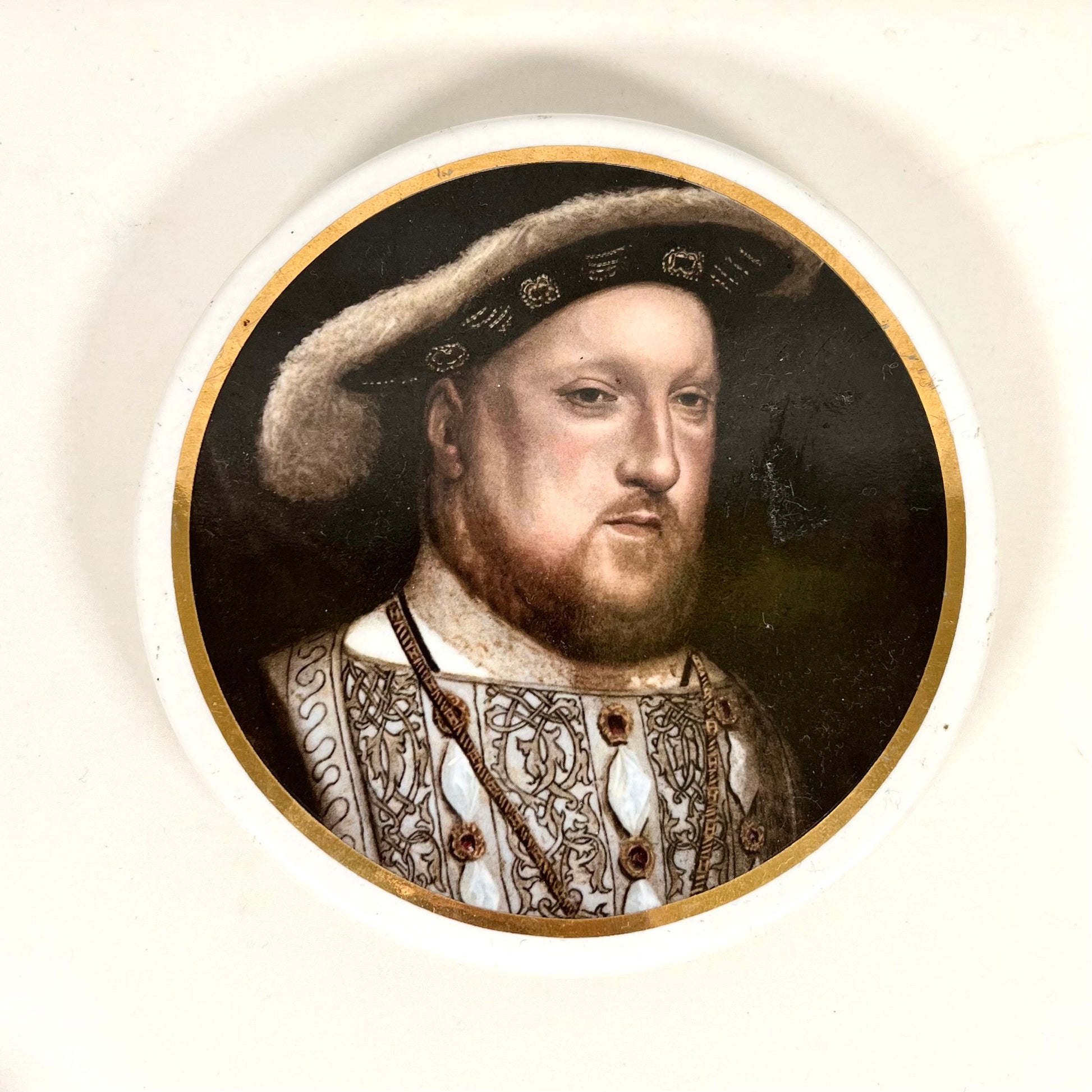 Esta tapa de olla Prattware del siglo XX, con una transferencia fotográfica del retrato de Enrique VIII, posiblemente fue realizada por una fábrica de Staffordshire alrededor de la década de 1960. Sin embargo, Coalport produjo reproducciones de Prattware hasta 1979. Por lo tanto, la fecha exacta de producción es un misterio, pero a pesar de su carácter relativamente moderno, el retrato en sí es de una calidad excepcional. Está basado en un retrato al óleo del siglo XVII que se exhibe en la National Portrait Gallery de Londres; en un estilo inspirado en Hans Holbein el Joven, basado en una obra de 1536, representa al monarca Tudor tal como lo conocemos hoy.