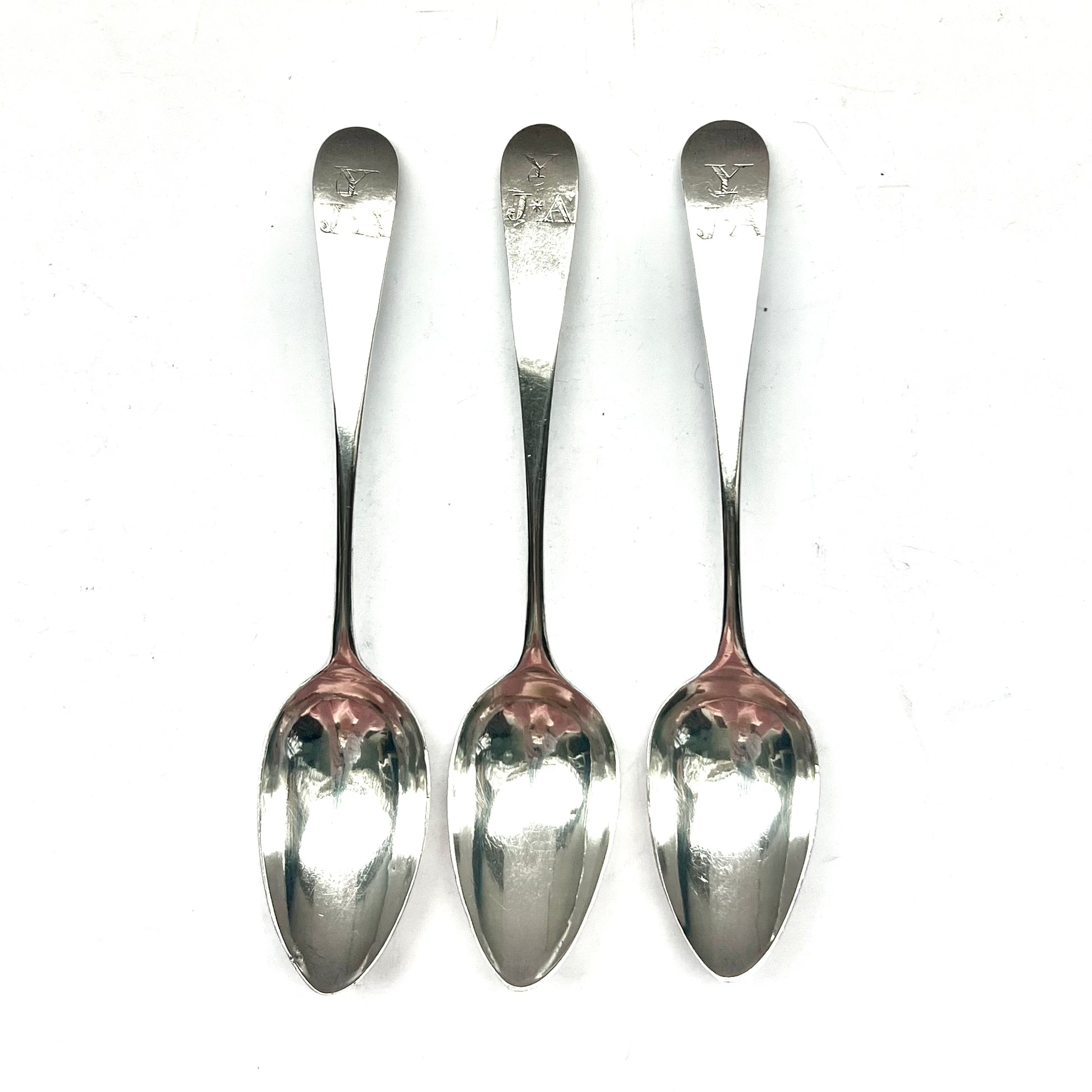 Tres cucharas de plata provinciales inglesas de Jorge III con marcas de Richard Ferris, Exeter, circa 1789 a 1810