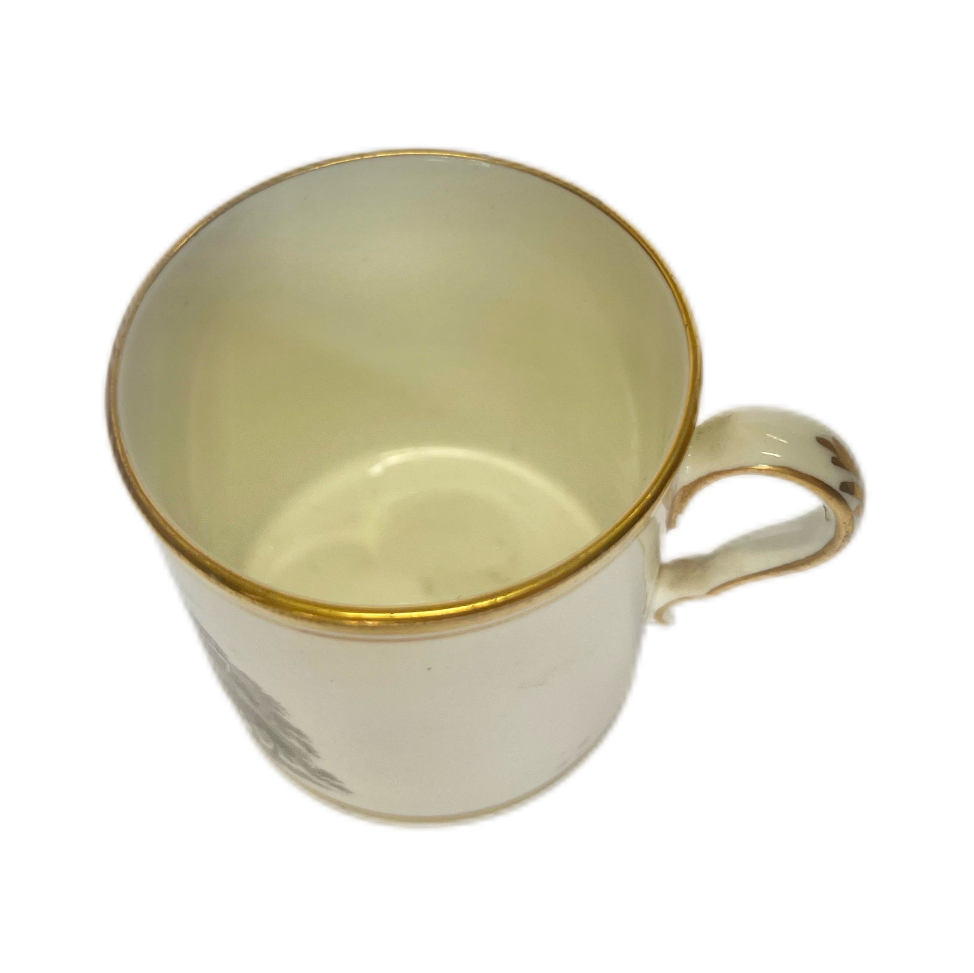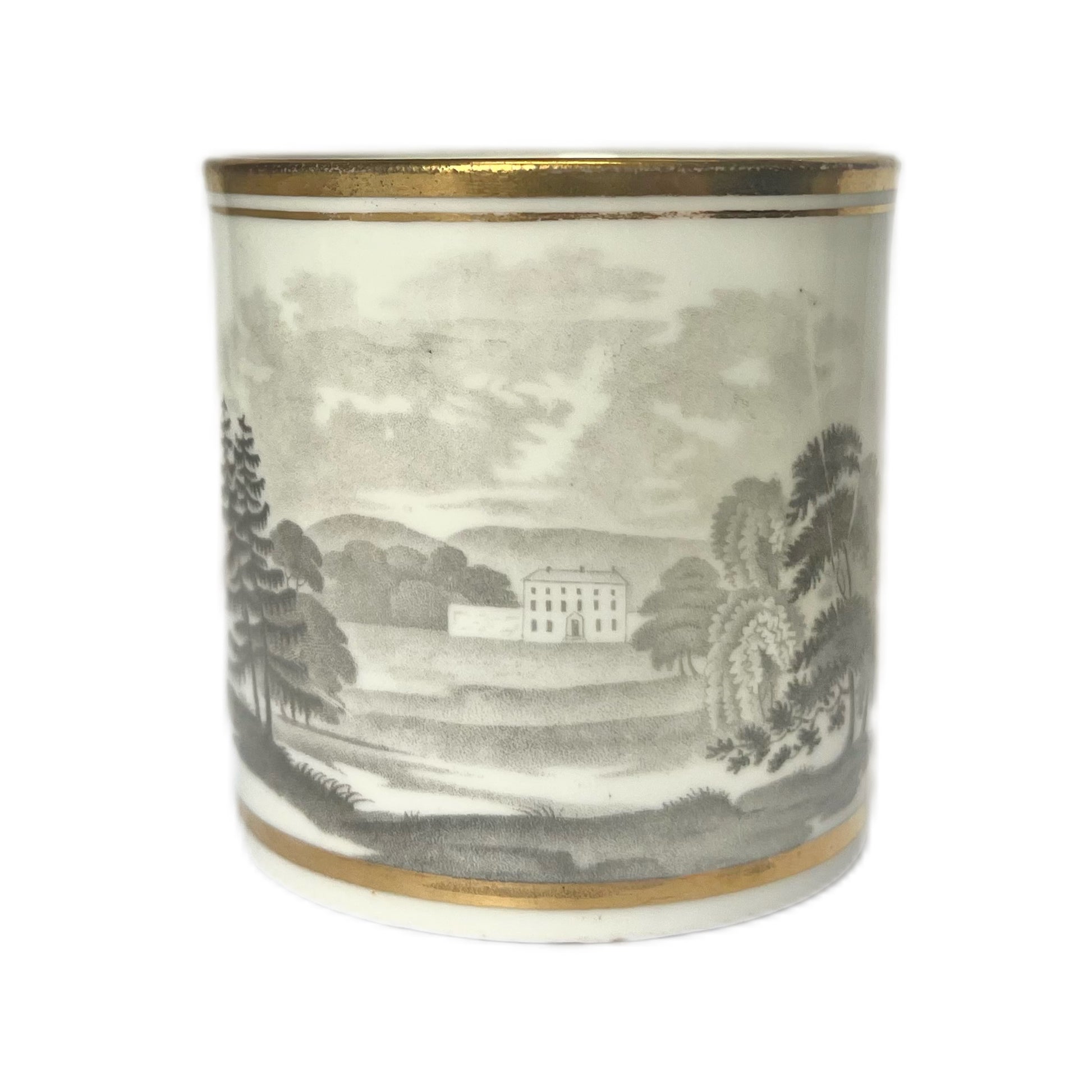 Beautifully executed transfer ware scene of the English countryside to body of coffee can, richly gilded border trim to top and bottom of coffee can as well as handle.