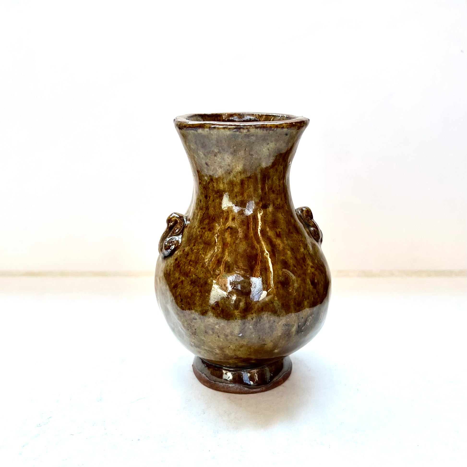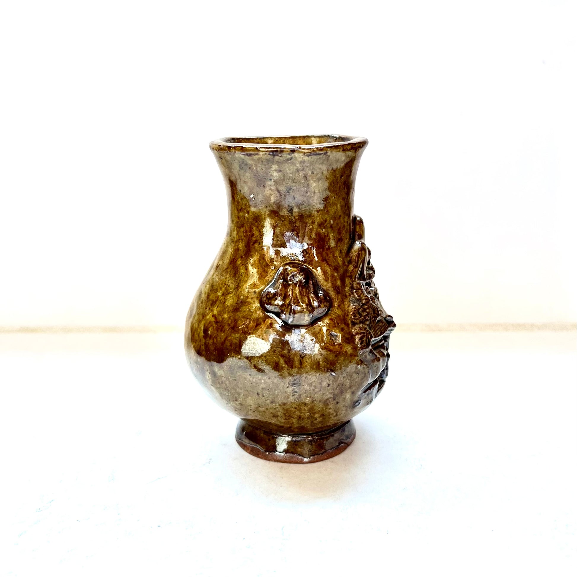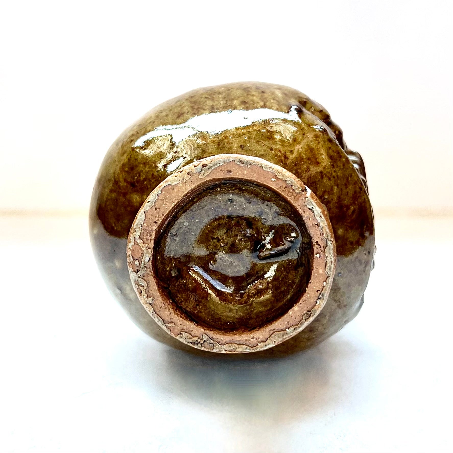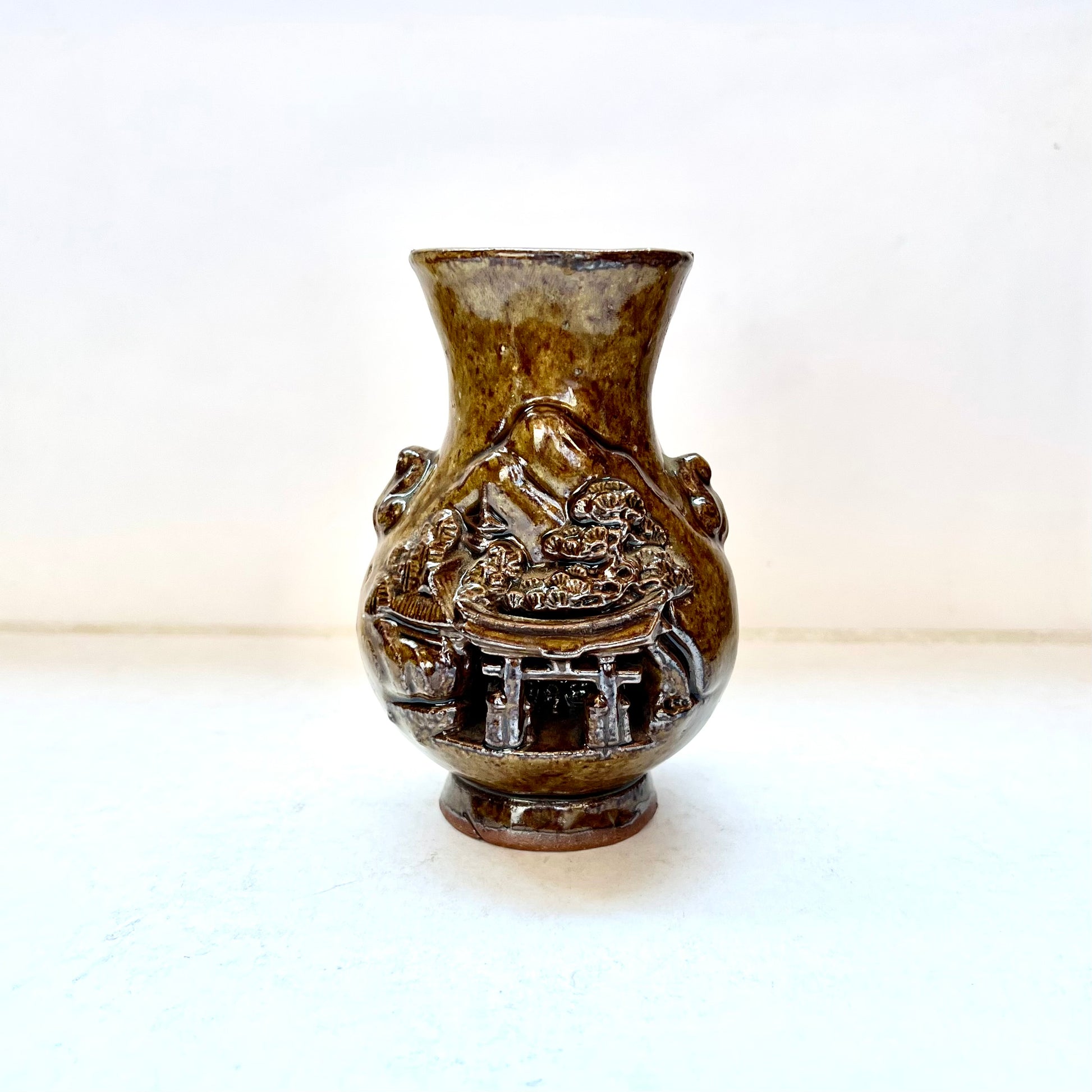 Bellamente tallado con detalles tridimensionales, se puede observar a través de la puerta Torii la entrada al santuario y las escaleras que conducen al templo. Una hermosa pieza, el horno Itsuku era conocido por mezclar arena del entorno del santuario con la arcilla, ya que se creía que traía buena suerte. El jarrón es de color marrón oliva, esmaltado con un acabado brillante. El horno ya no produce estas piezas, y creemos que esta se produjo alrededor de las décadas de 1930 y 1940.