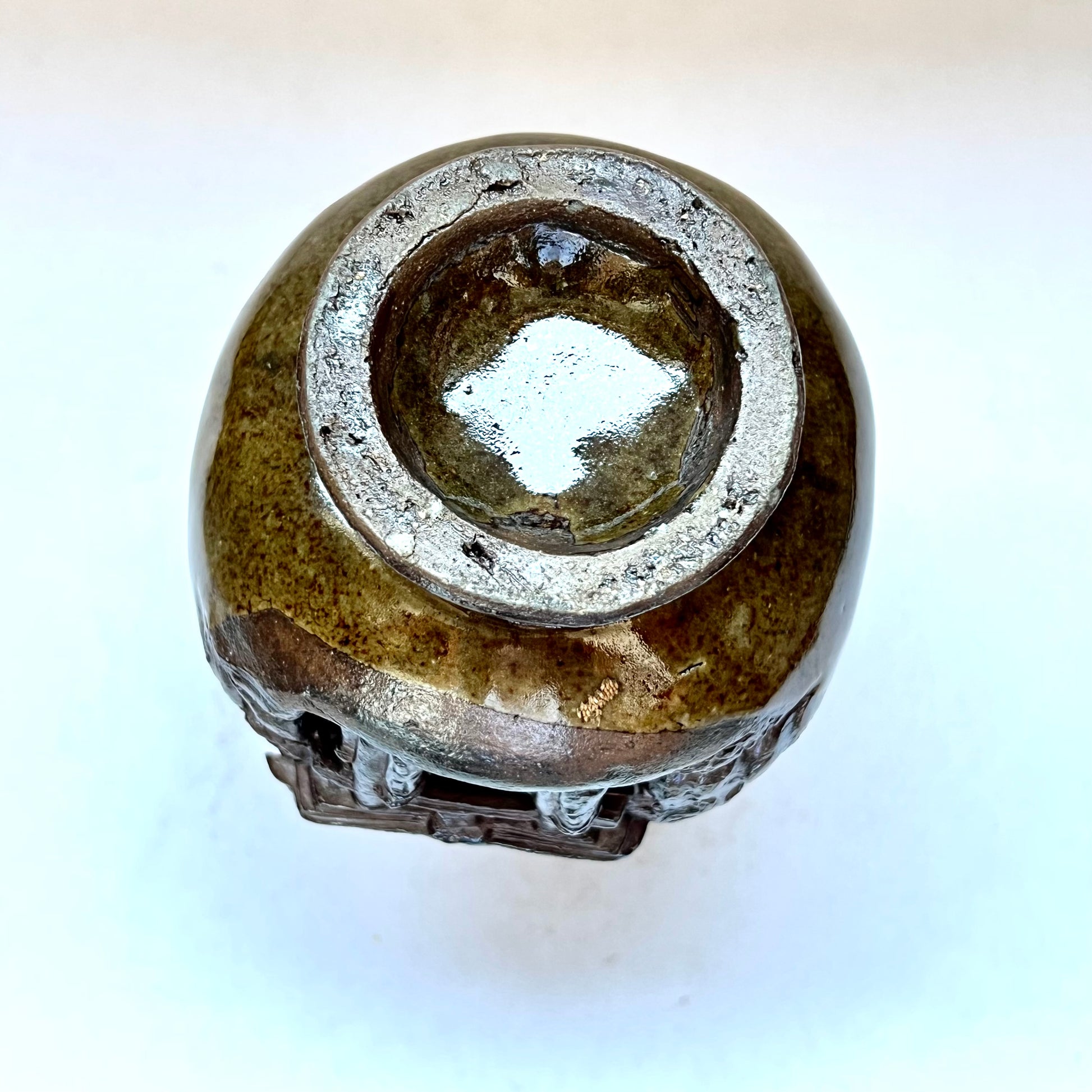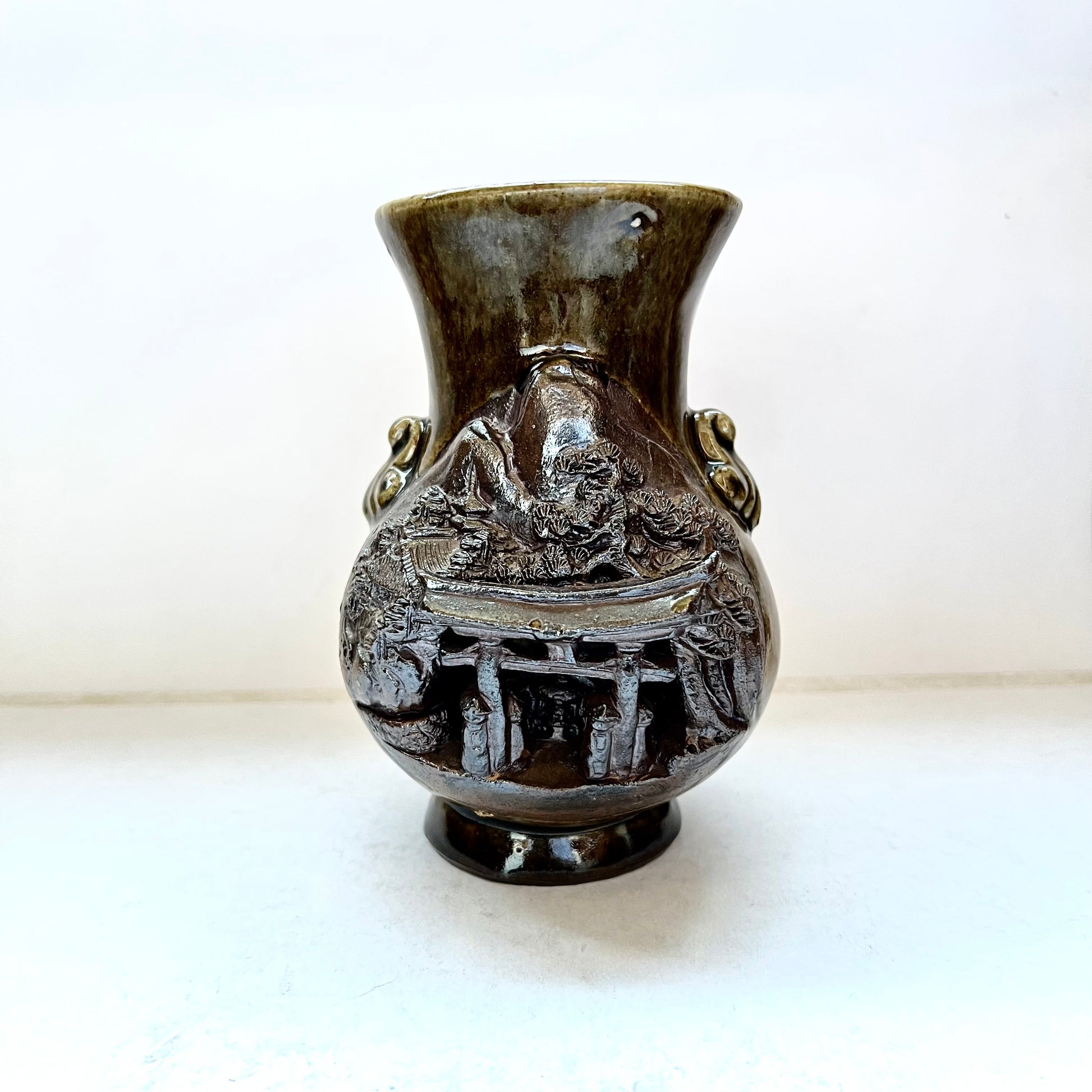 Bellamente tallado con detalles tridimensionales, se puede observar a través del torii la entrada del santuario y las escaleras que conducen al templo. Una hermosa pieza, el horno Itsuku era conocido por mezclar arena del entorno del santuario con la arcilla, ya que se creía que traía buena suerte. El detalle del templo tiene un acabado mate o esmaltado a la sal, y el cuerpo del jarrón es de un marrón oliva brillante. El horno ya no produce estas piezas, y creemos que esta se produjo alrededor de las décadas de 1930 y 1940.
