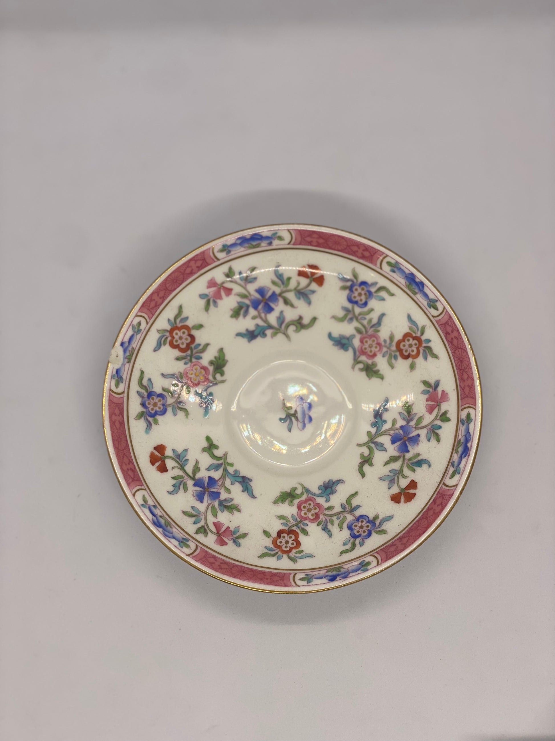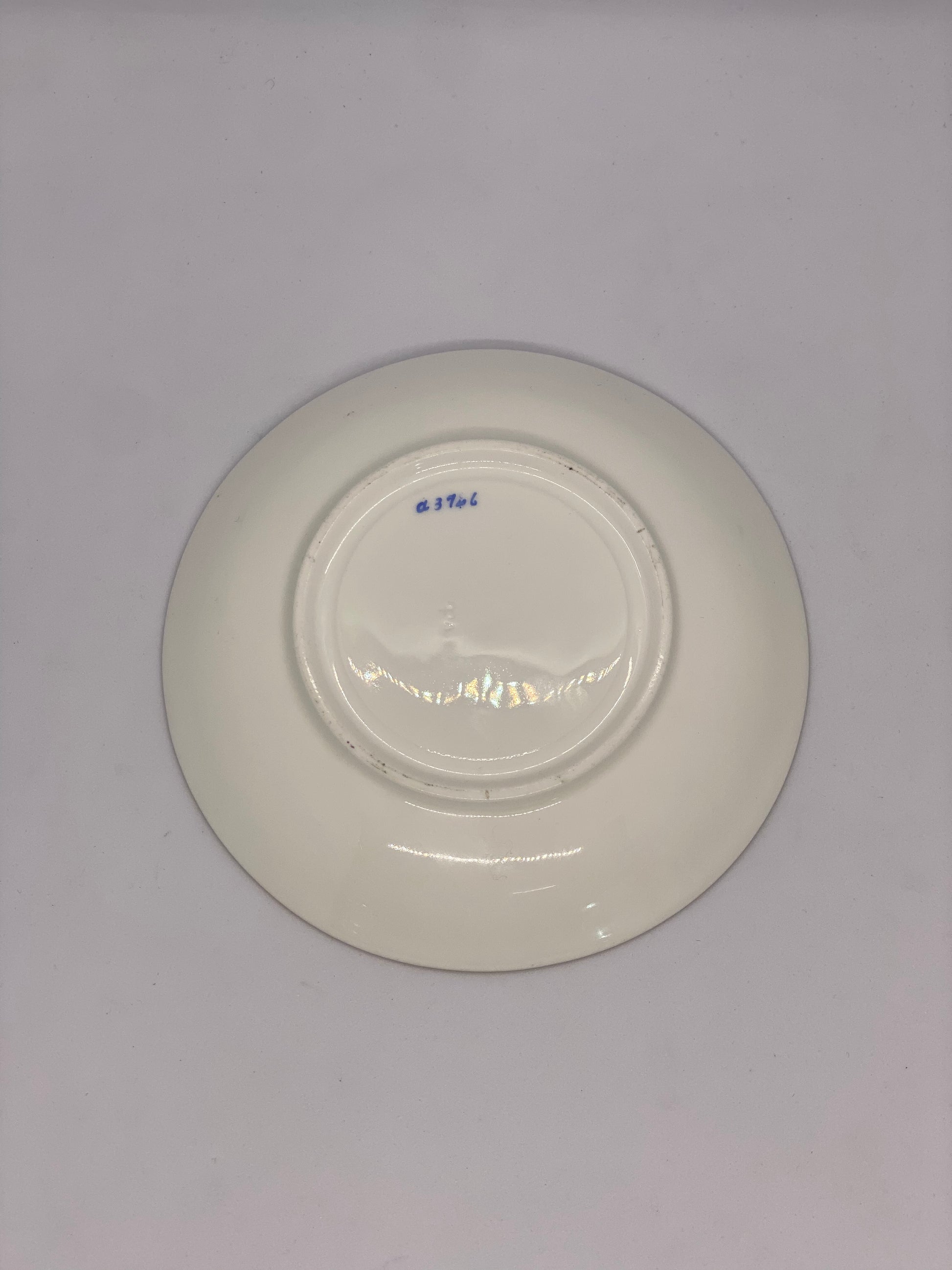 Estado: Un pequeño barco histórico en el borde del platillo; debido al recargado diseño, no es demasiado perceptible. Por lo demás, en buen estado, con desgaste mínimo en los adornos dorados, excepto alrededor del asa donde se sujetaba. Desgaste en la base acorde con su antigüedad.