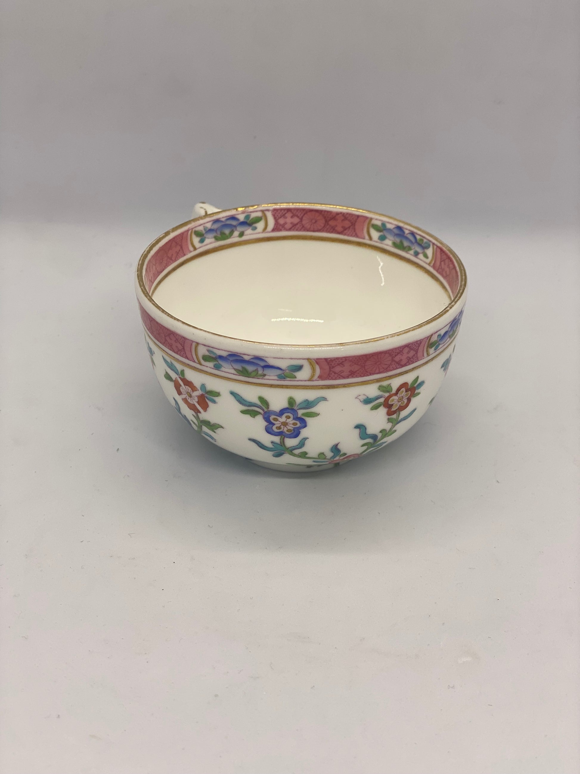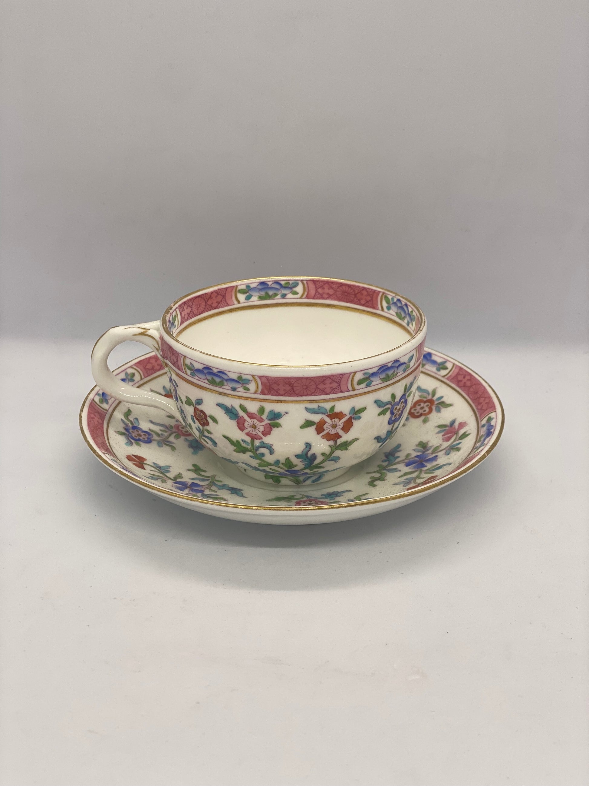 Taza de té y platillo antiguos de estilo chinoiserie Minton, circa 1858.