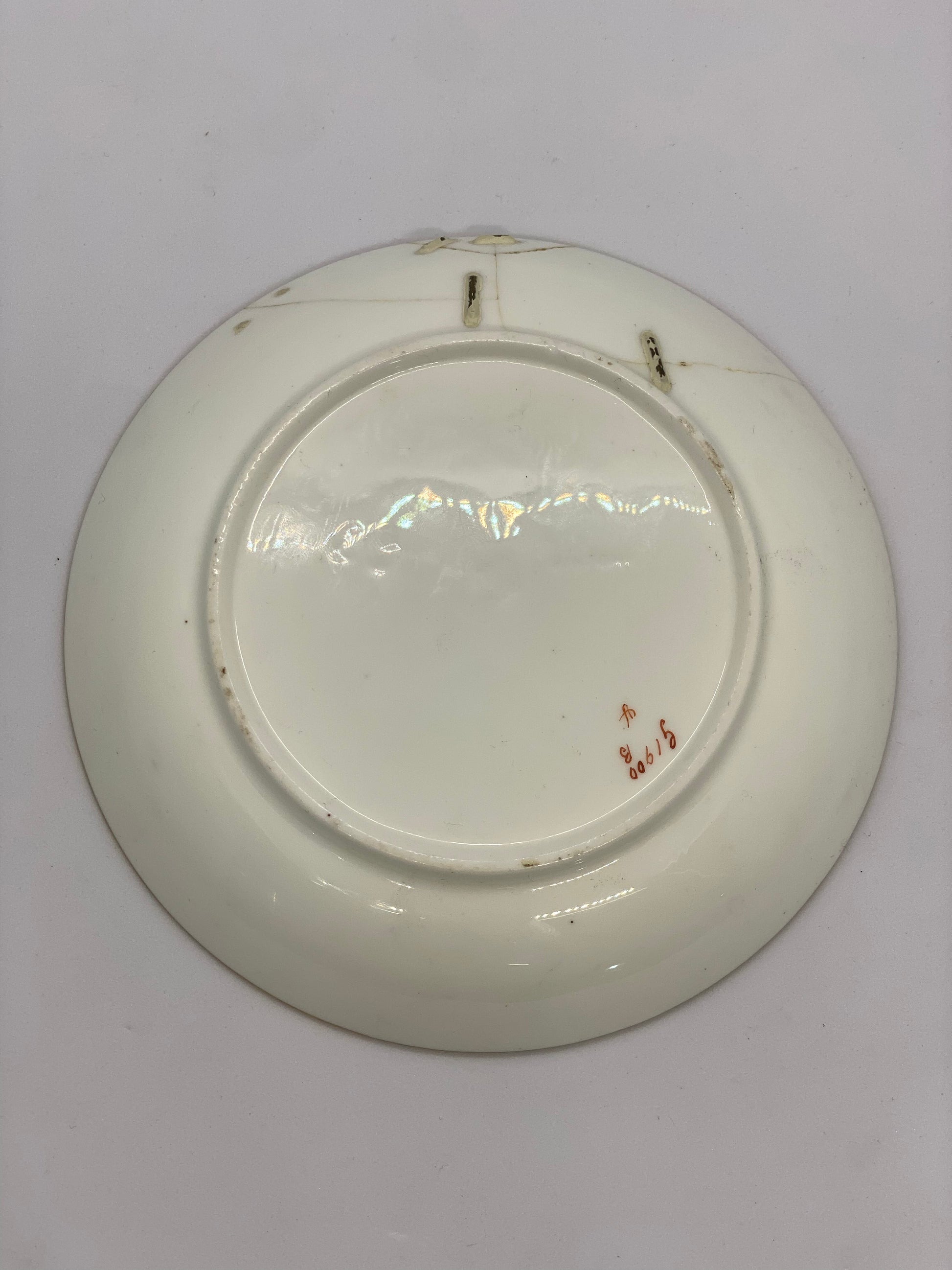 Medidas: Diámetro de la taza: aproximadamente 8 cm; altura de la taza: aproximadamente 5,5 cm. Diámetro del platillo: aproximadamente 14 cm.