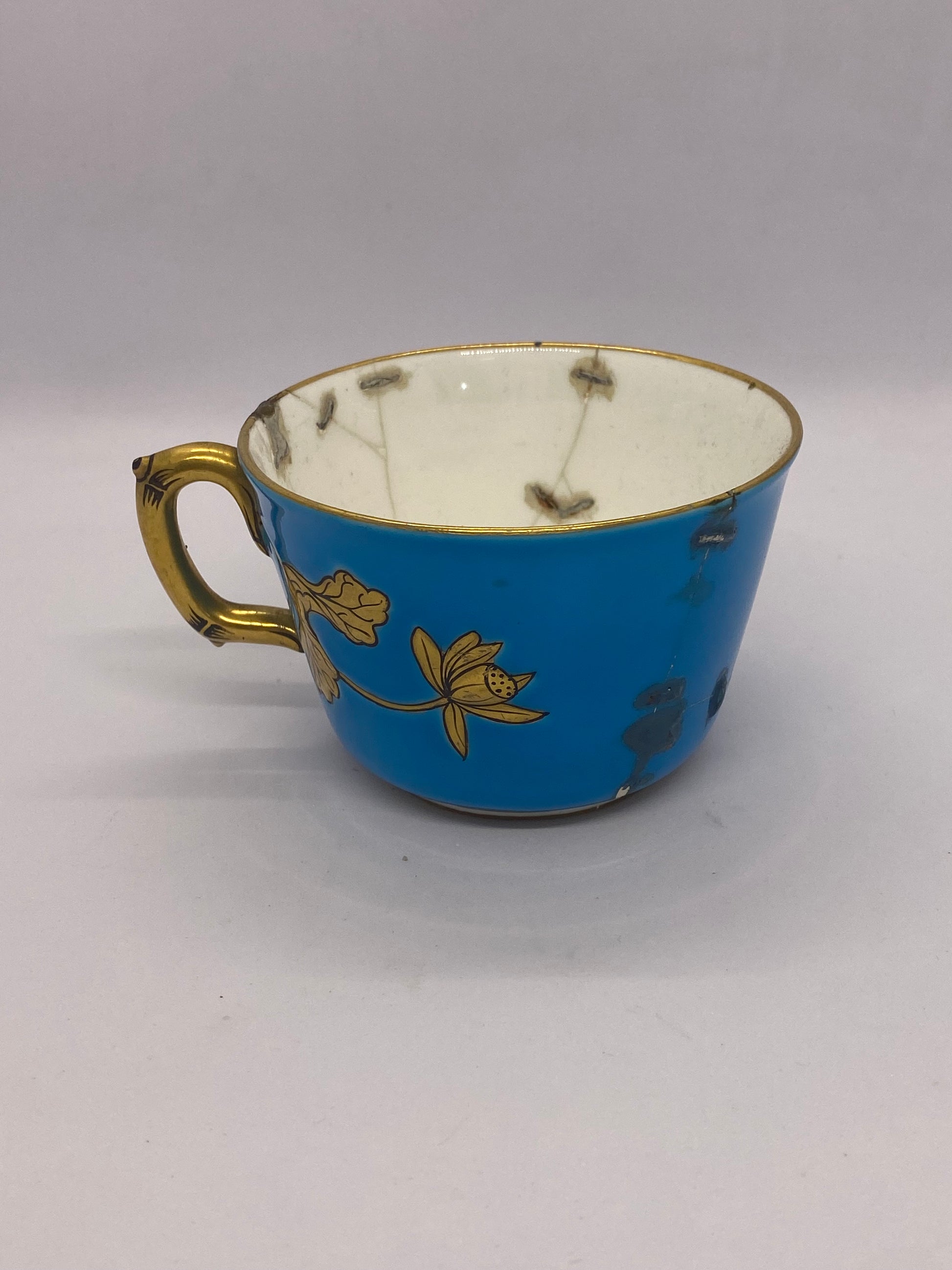 Juego de taza de té y platillo Minton antiguo de alrededor de 1874 en un diseño poco común con reparaciones básicas históricas