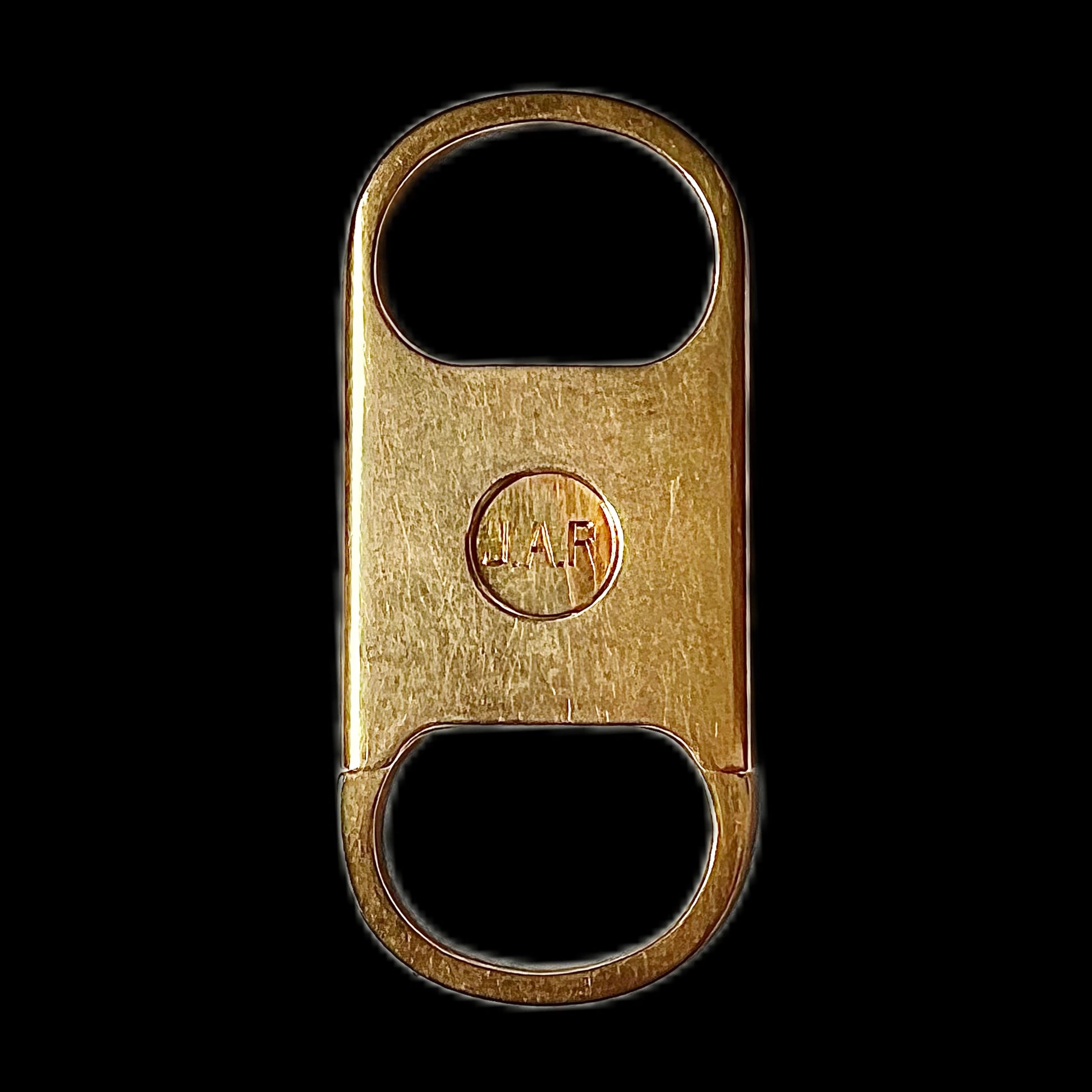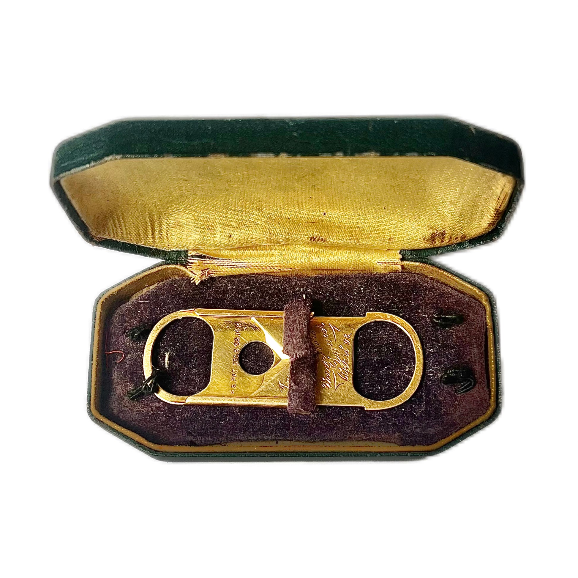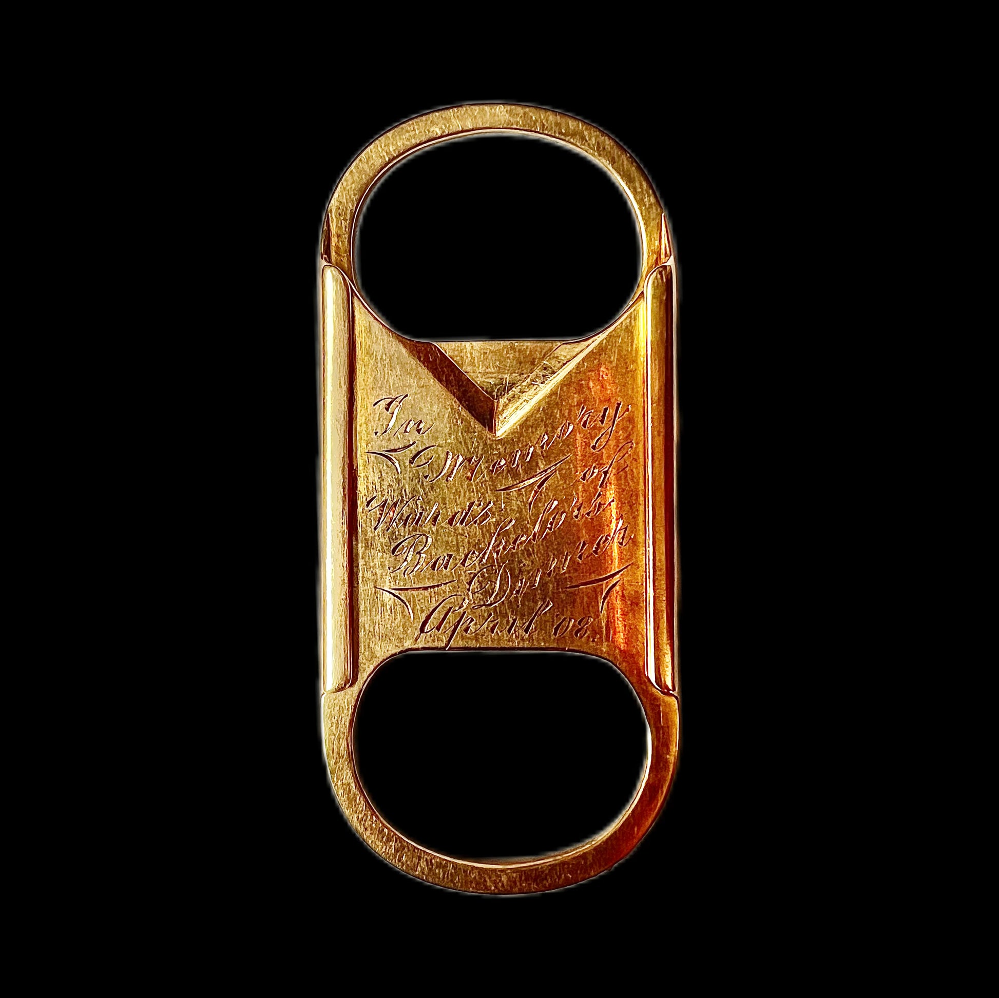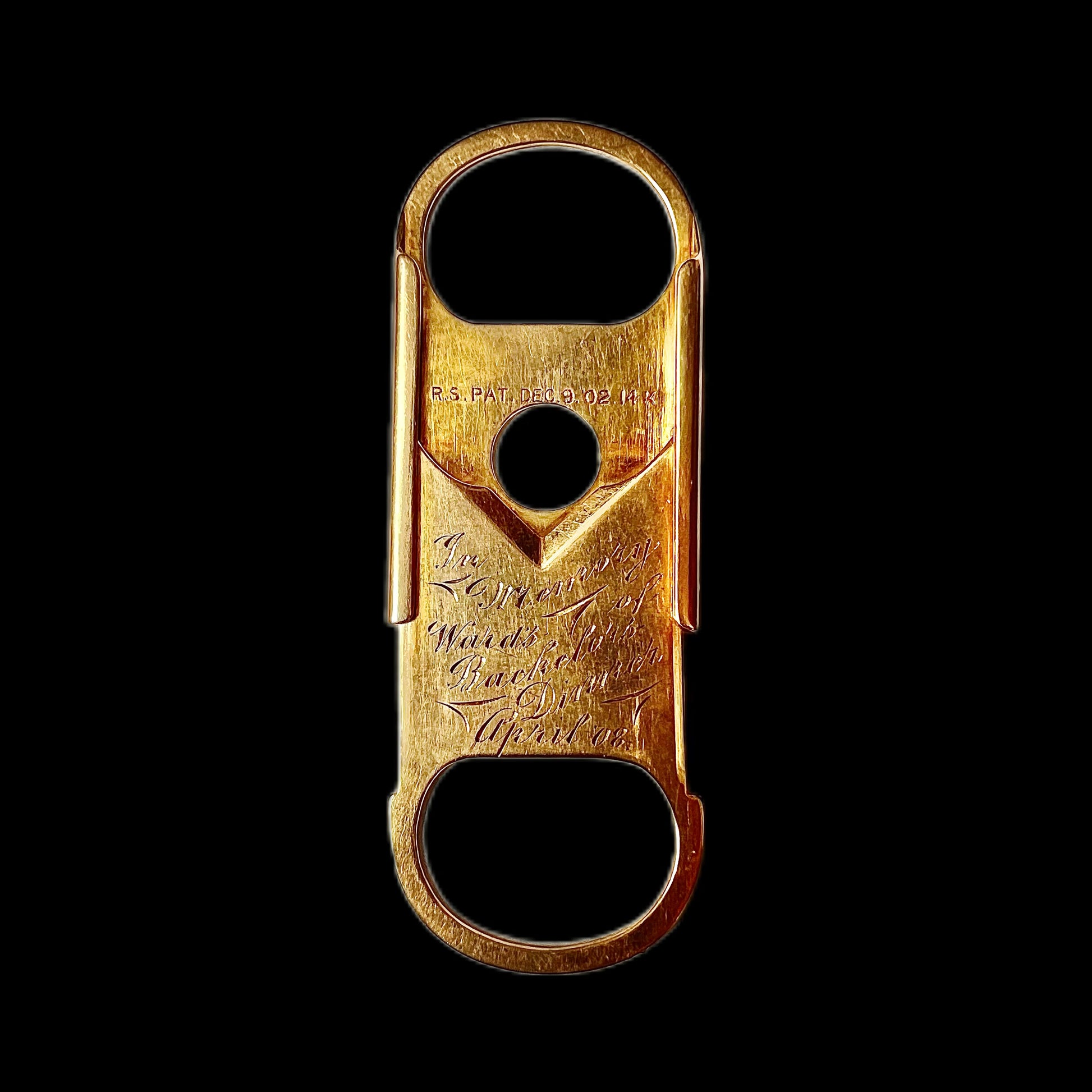 Patentado en 1902 y circa 1908, este cortapuros de oro presenta una elegante elaboración y lleva el monograma JAR en la parte posterior. Una encantadora inscripción en la parte frontal dice: «En memoria // Cena de soltero de Ward // Abril 08».