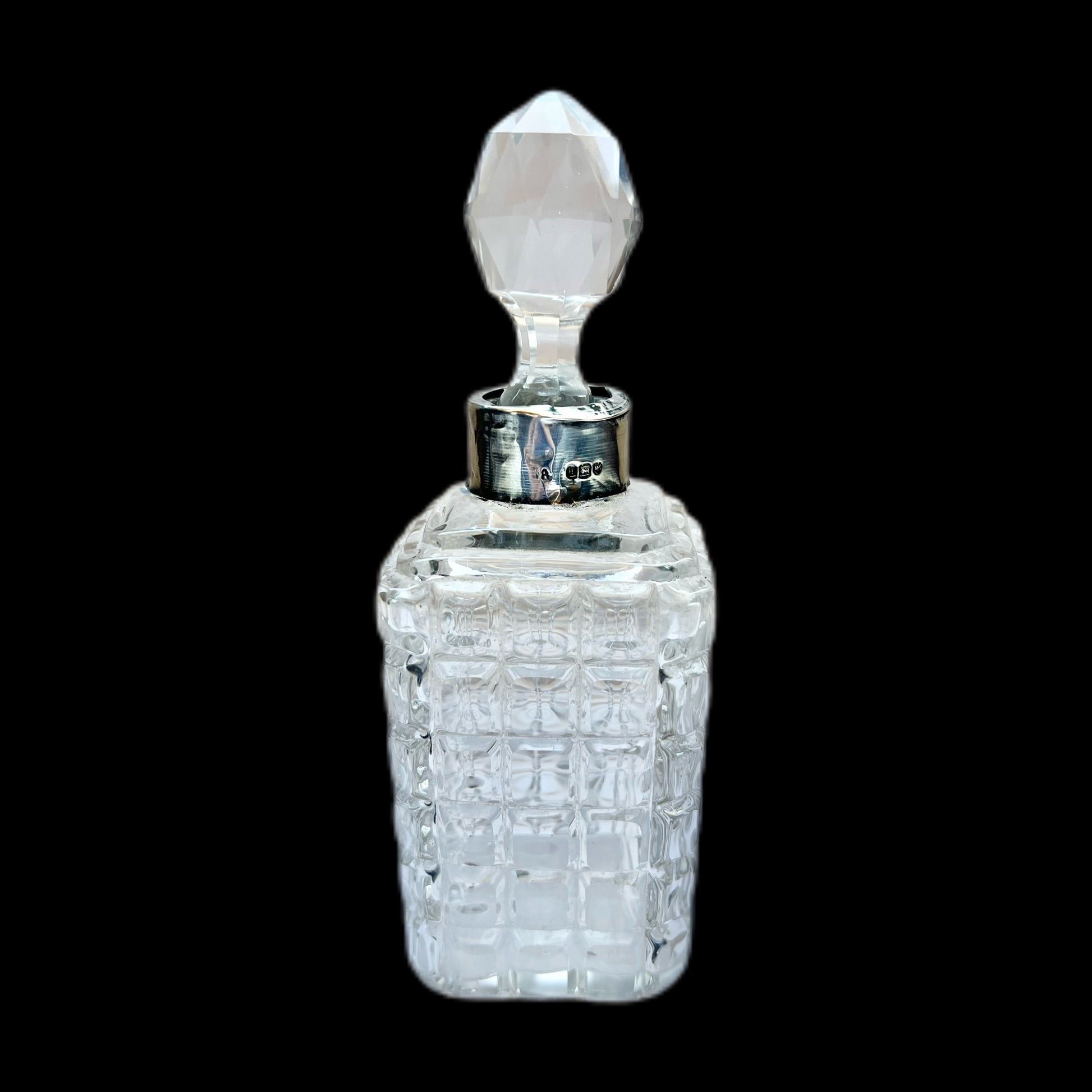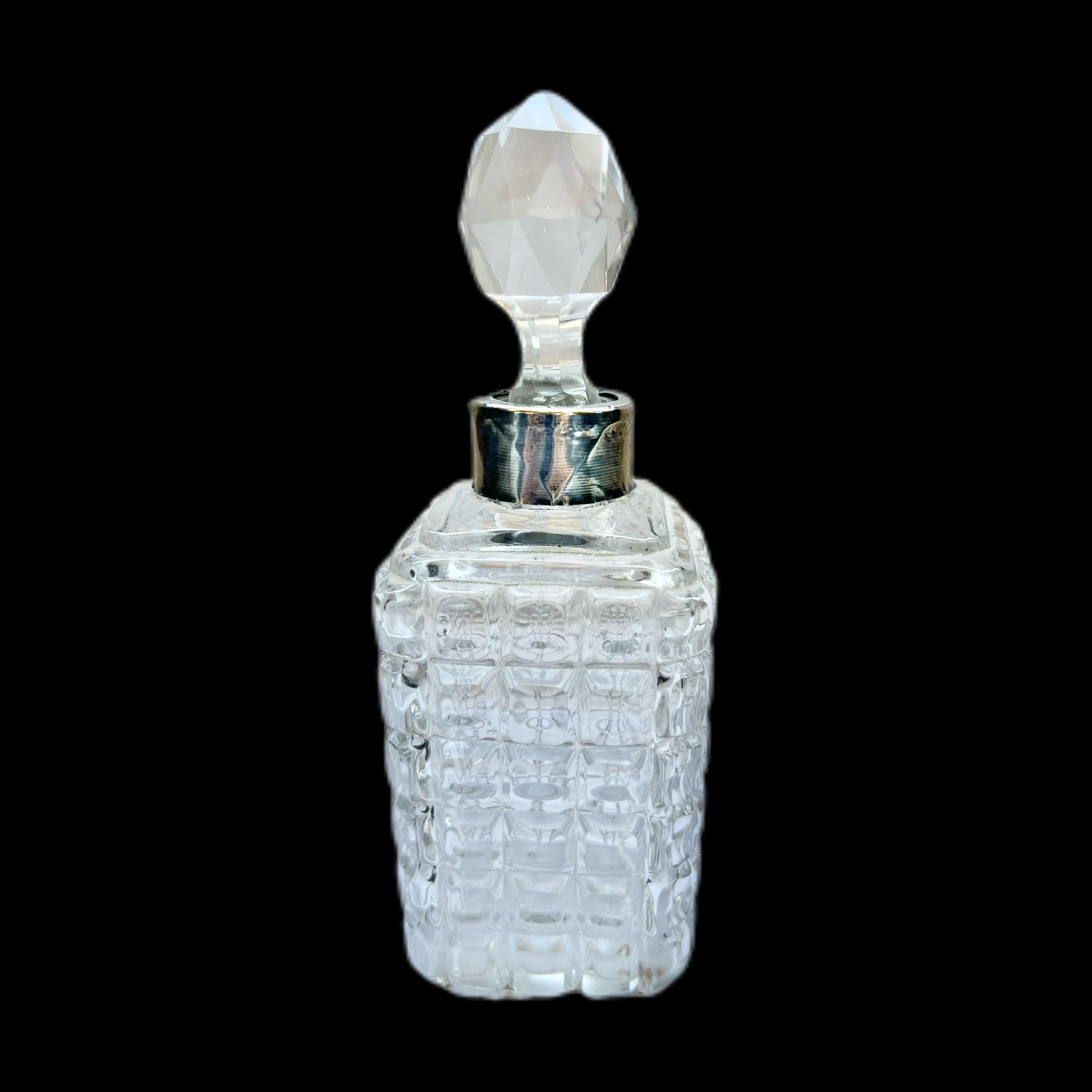 Este antiguo frasco de tocador o perfume de plata esterlina y vidrio tallado eduardiano es elegante y atemporal, con marcas de ensayo de Londres 1907. Es un frasco encantador que se puede usar como frasco de exhibición o incluso para usar, considerando las propiedades antimicrobianas de la plata.
