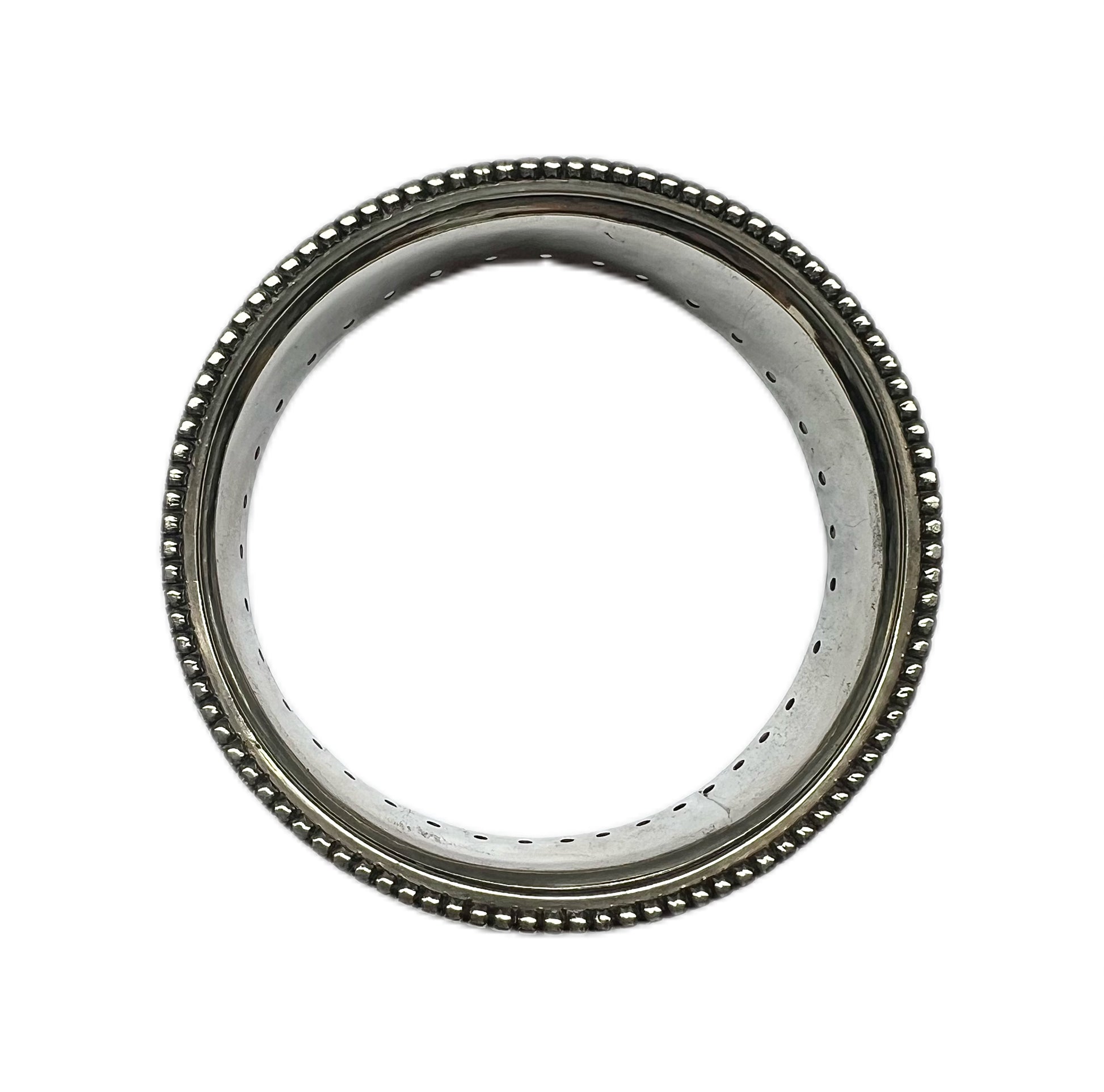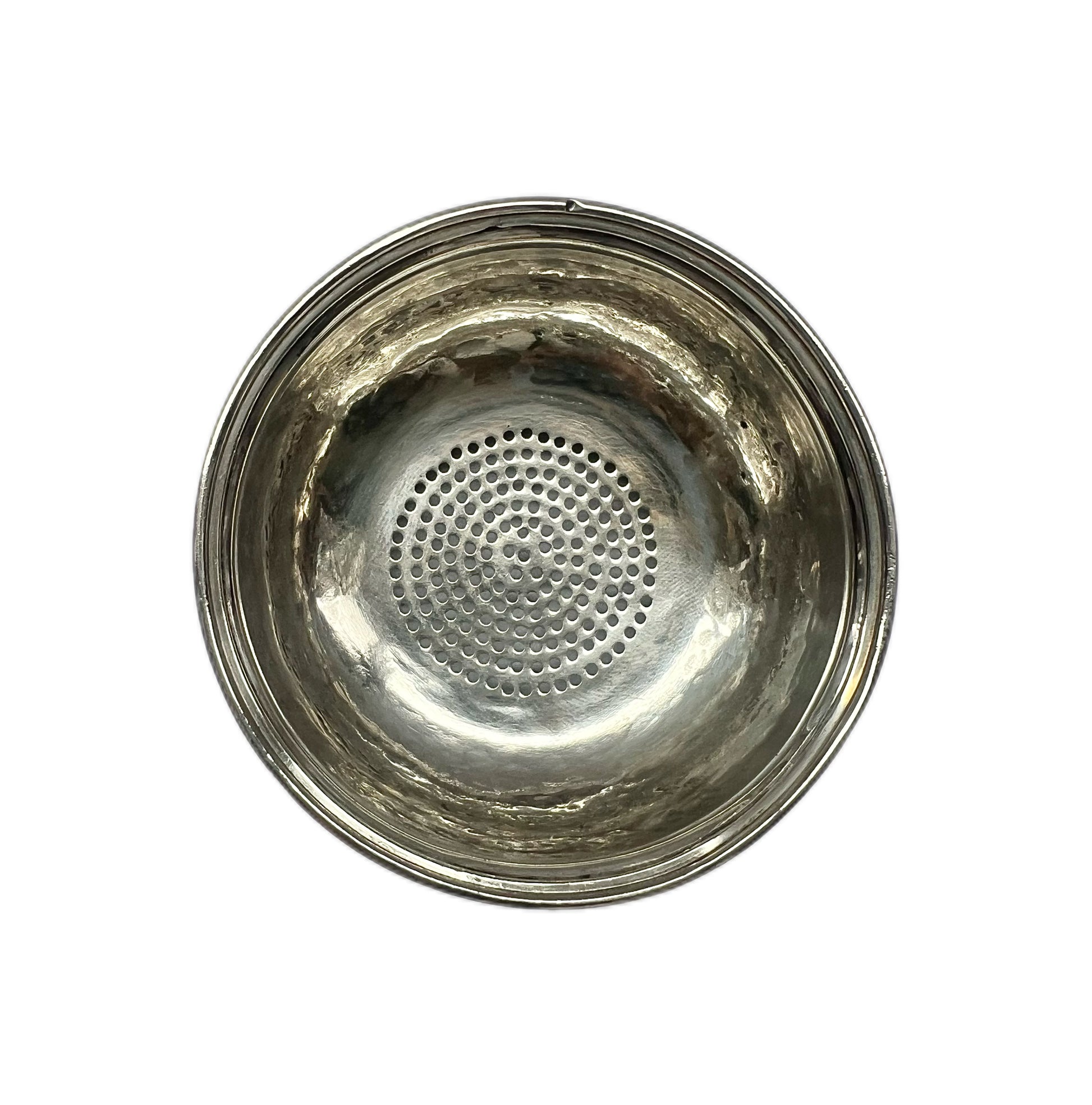 A rare and curious George III hand-raised sterling silver wine strainer, with partial marks for London 1762, no makers maker. This would originally have been part of a set up where the wine would be poured through a funnel into the strainer to remove impurities. The collar would have held a piece of muslin in place as part of the straining process, and it is rare to find the original collar with strainer as a set.