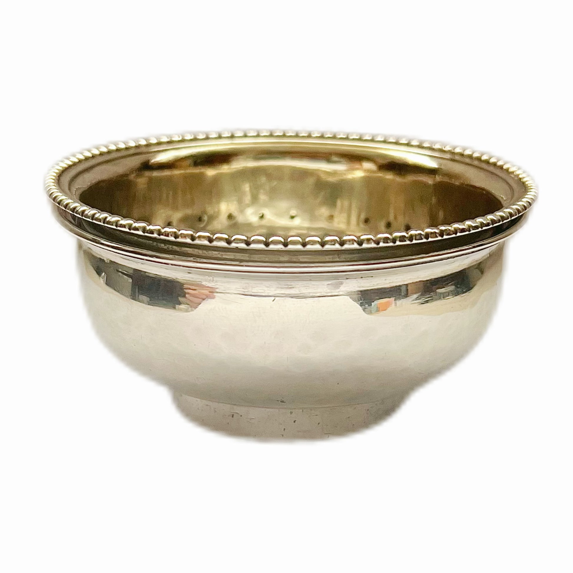 Beautifully crafted, the bowl is hand-raised as can be seen by the lightly planished interior while the collar is well-fitting with beautiful border detail and pierced details.