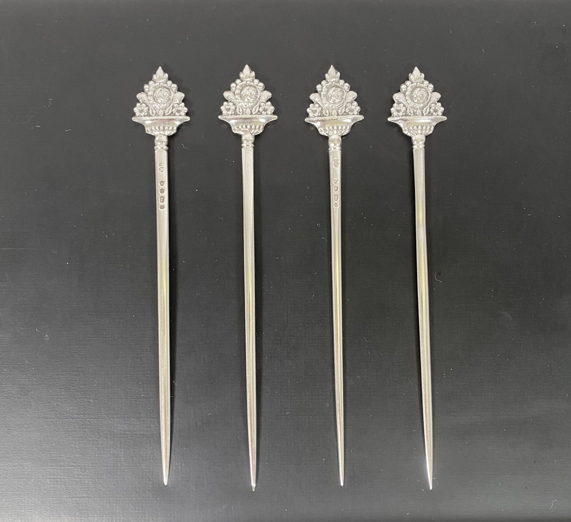 Precioso juego de brochetas de cóctel de plata de ley de la época victoriana. Elegantes con sus tapas con motivos florales repujados, son ideales para cualquier cena o cóctel elegante. Tres de ellas tienen el sello de Londres de 1848 y una posteriormente, el de Londres de 1853.