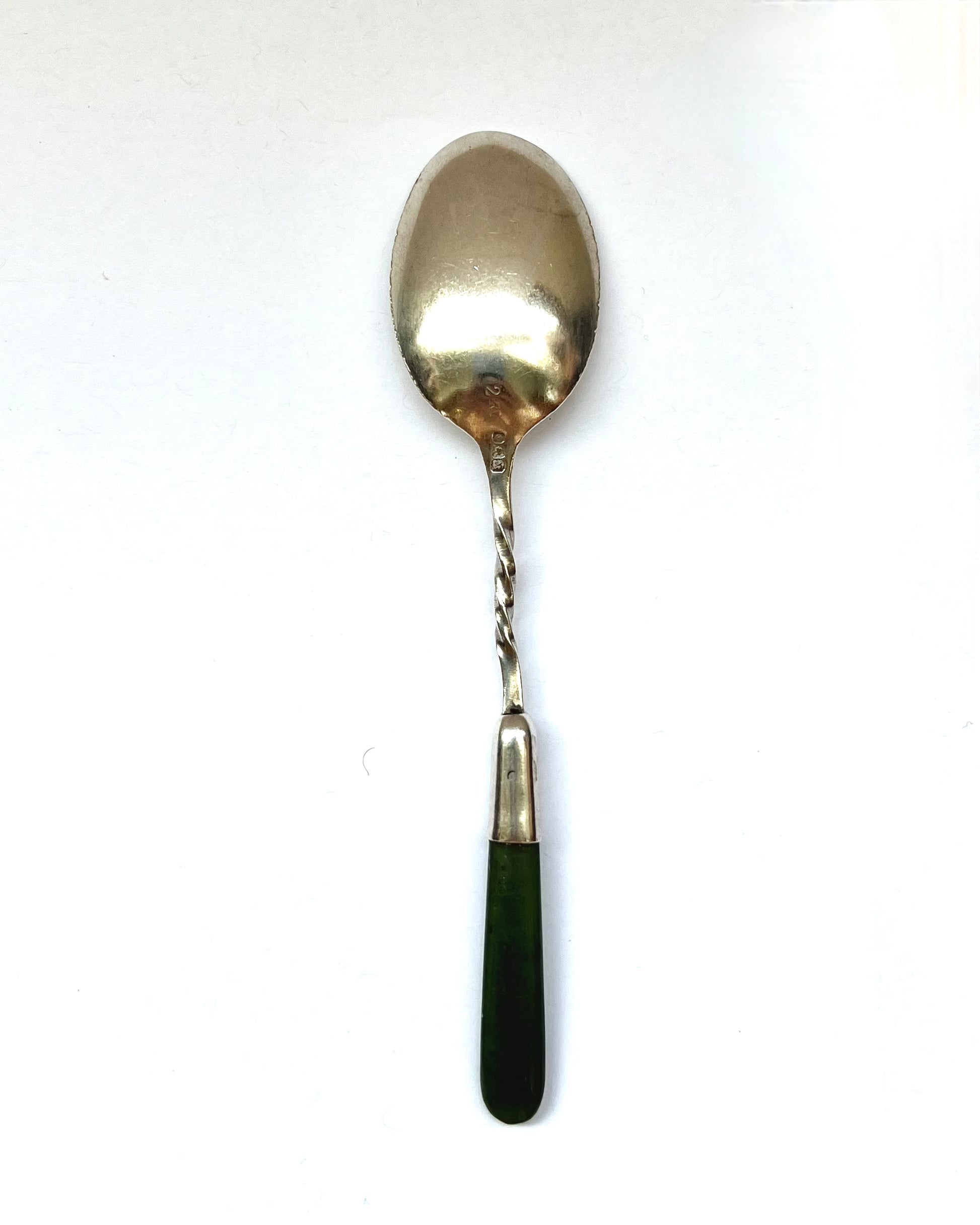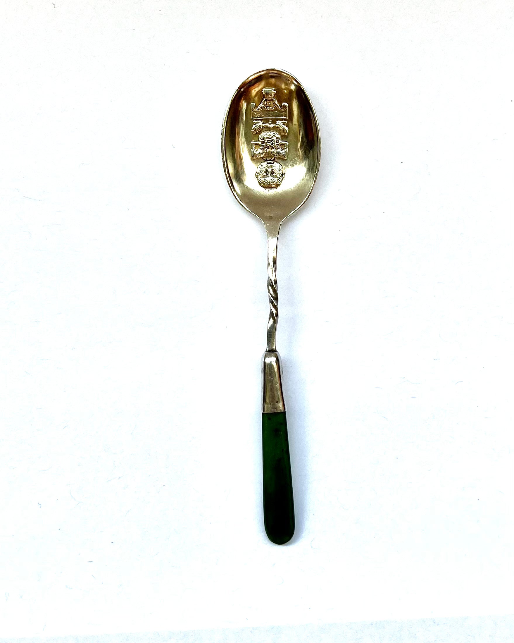 Pequeña pero muy elegante, esta rara y antigua cuchara de té neozelandesa de plata esterlina dorada con mango de jade nefrita ostenta el sello inglés de Birmingham de 1922, marca del patrocinador Levi & Salaman. Dado que los plateros eran relativamente poco comunes en Nueva Zelanda en aquella época, es probable que las hojas y engastes de plata se fabricaran en el Viejo Mundo y se enviaran a Nueva Zelanda, donde se habrían montado. Hermoso diseño repujado con motivos maoríes en el cuenco. Esta variedad de nefrita, originaria de Nueva Zelanda y otros países, ha sido apreciada a lo largo del tiempo por su belleza y su rico tono verde.