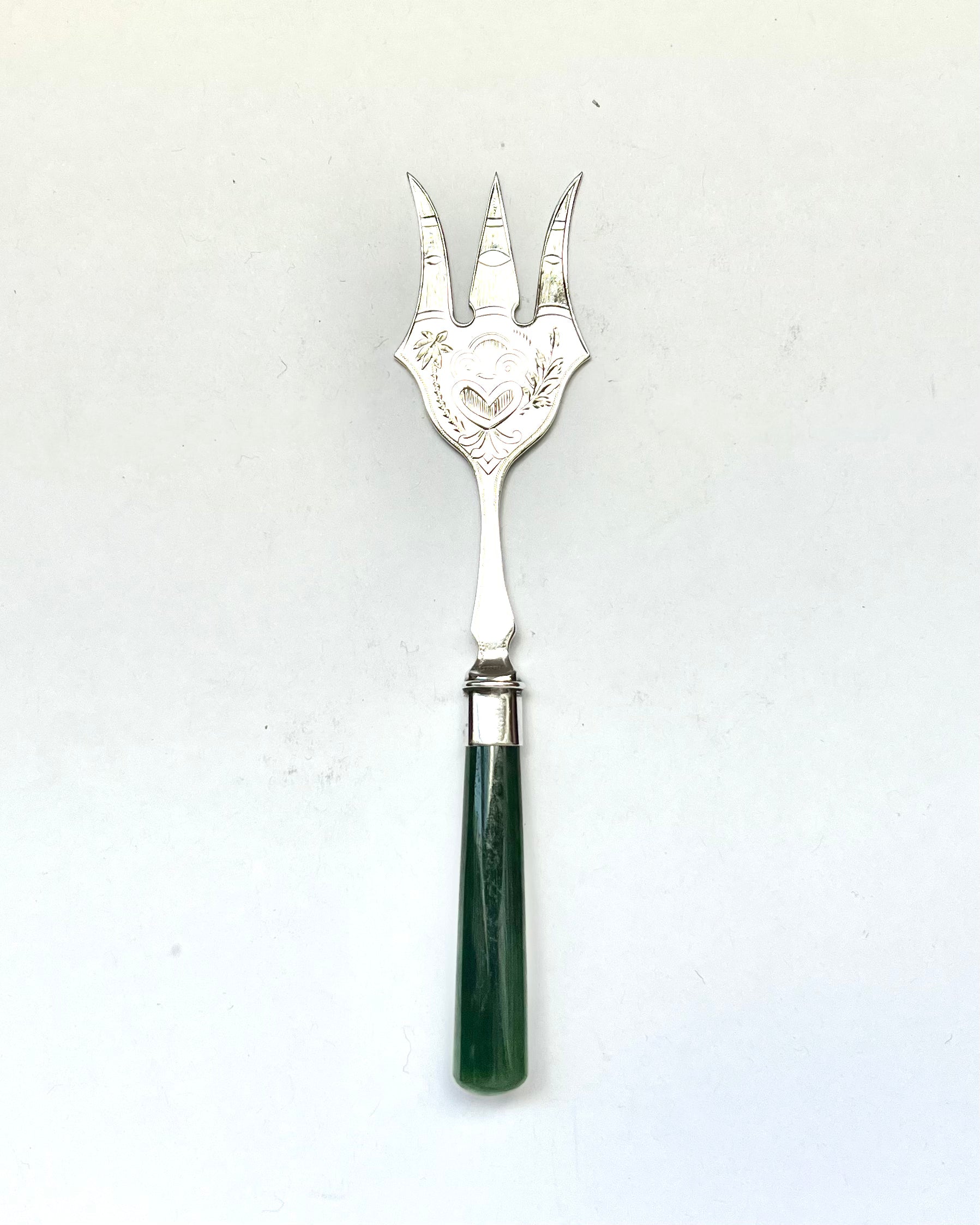 Tenedor de cóctel antiguo de plata esterlina de Nueva Zelanda con mango de jade nefrita, principios del siglo XX