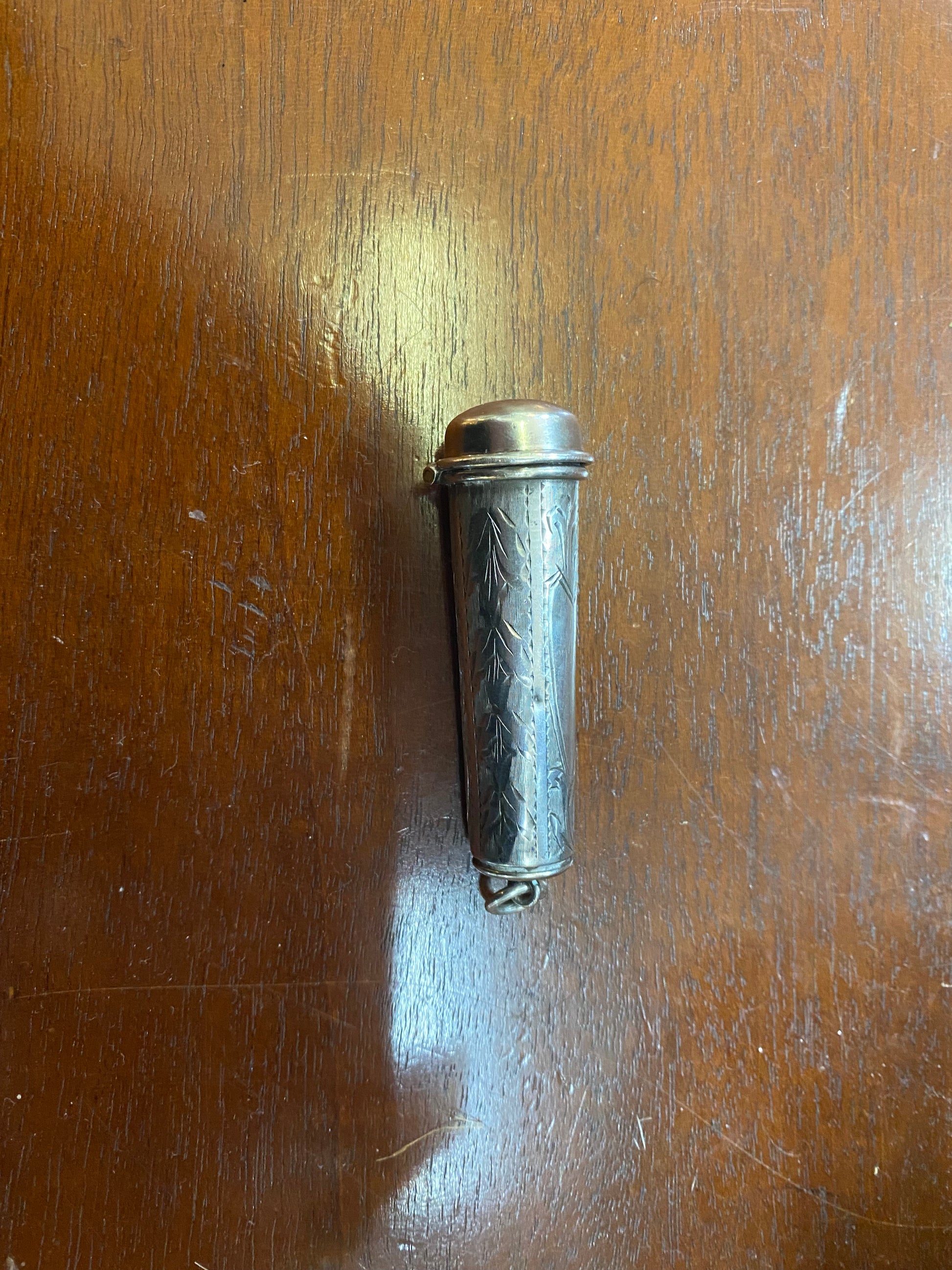 Sin marcar, pero comprobado como plata. Tiene una anilla de plata que lo sujetaría a una chatelaine. En la actualidad, sería perfecto para sujetarlo a una cadena y usarlo como colgante. Precioso interior bañado en oro.