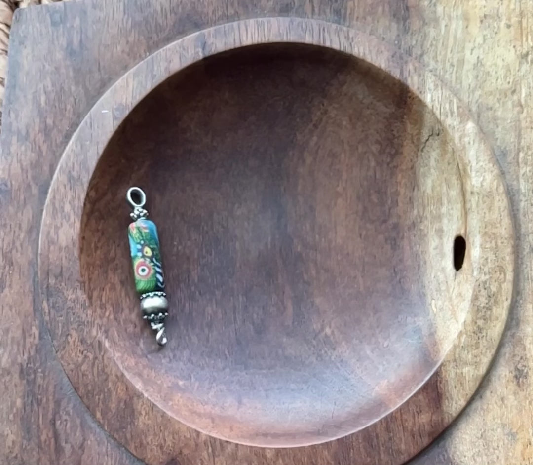 Colgante veneciano antiguo de cuentas comerciales con engaste de plata de ley, con bastones millefiori fusionados al estilo "Fin del Día".