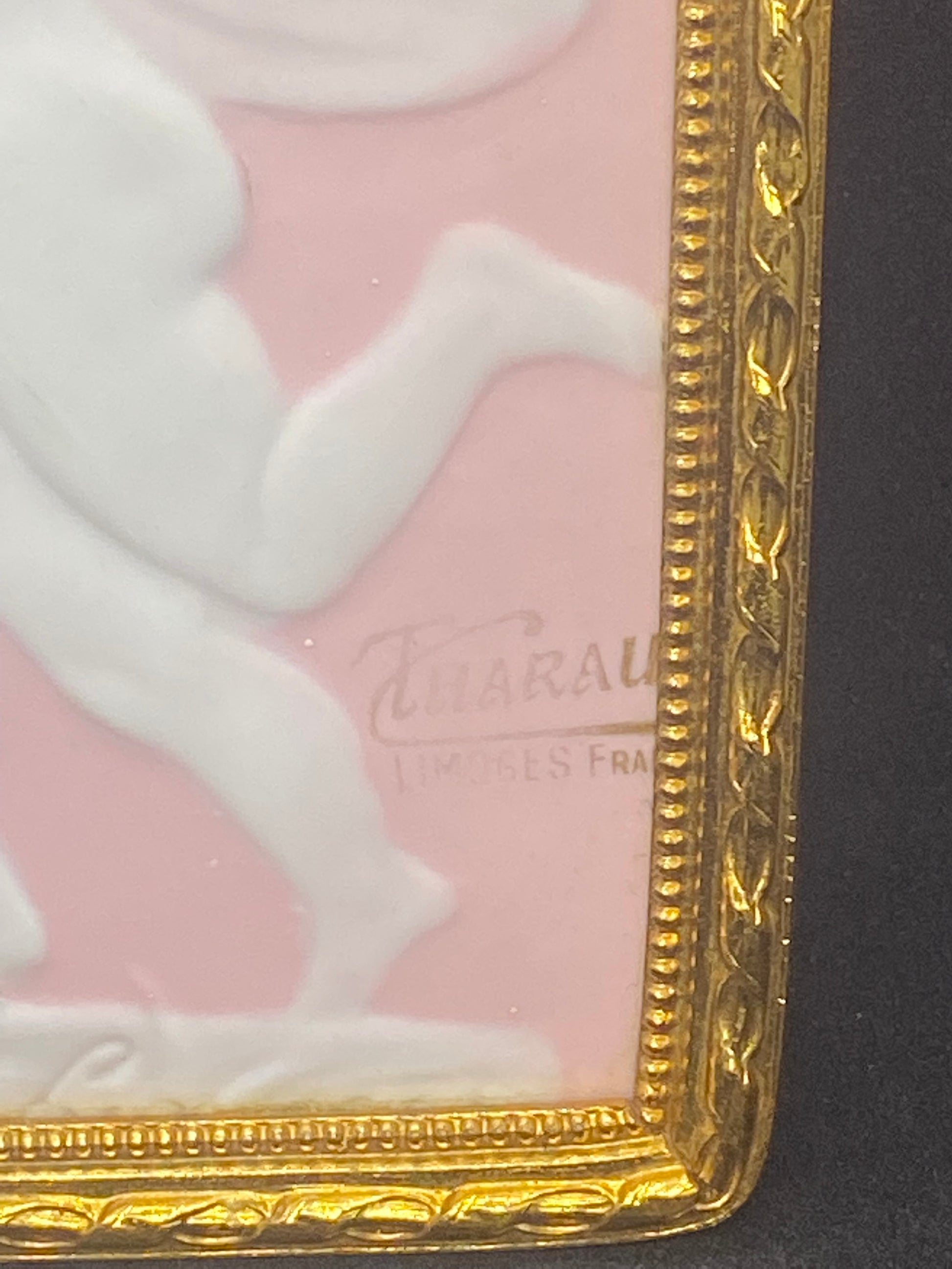 Hermoso estilo neoclásico con pequeños querubines cabalgando sobre una cabra y guiándola. El rosa siempre es un color coleccionable, especialmente en este estilo, ya que las piezas más grandes de Tharaud son extremadamente coleccionables; gran parte de su paté sur ware rosa se fabricó como platos decorativos más pequeños o cajas de baratijas.