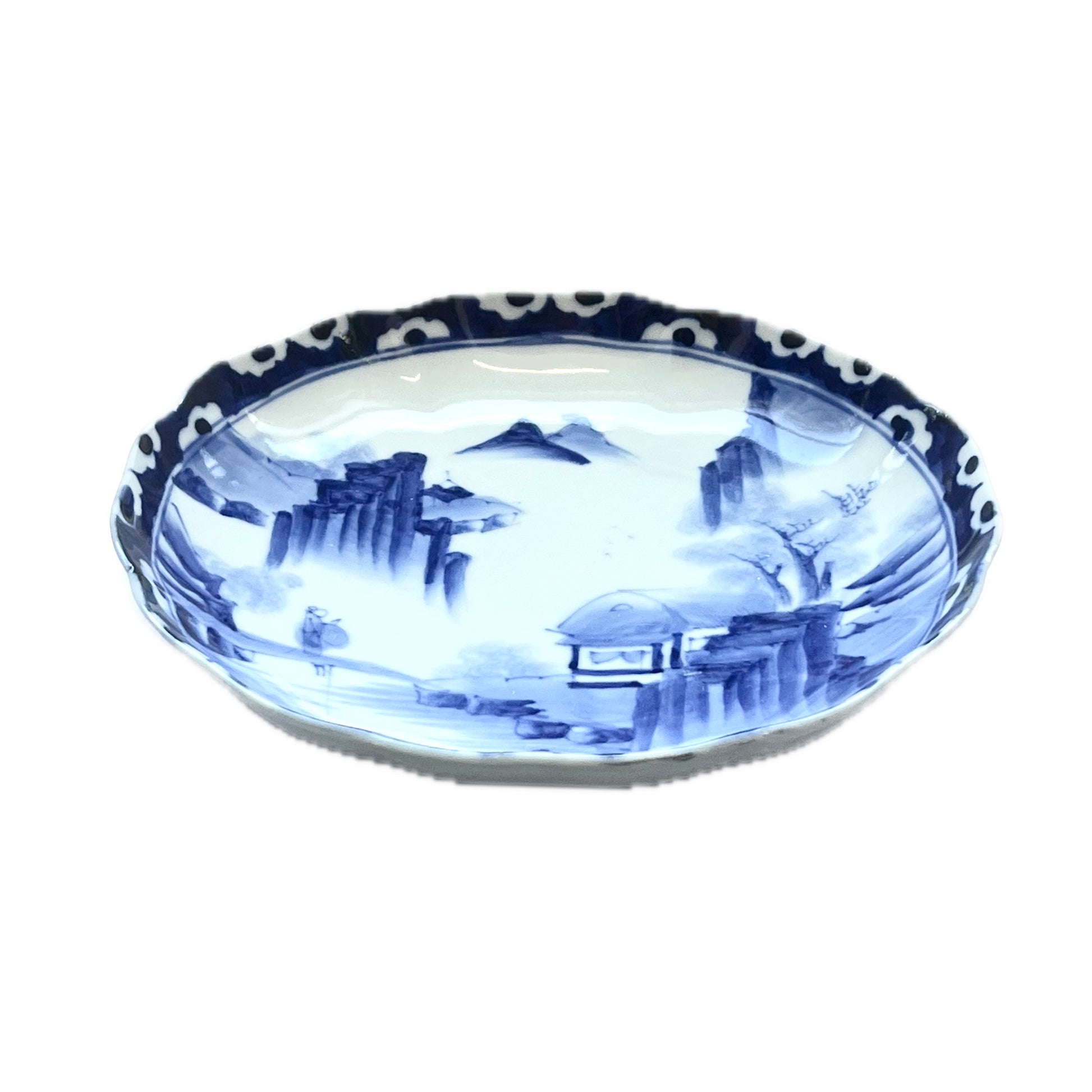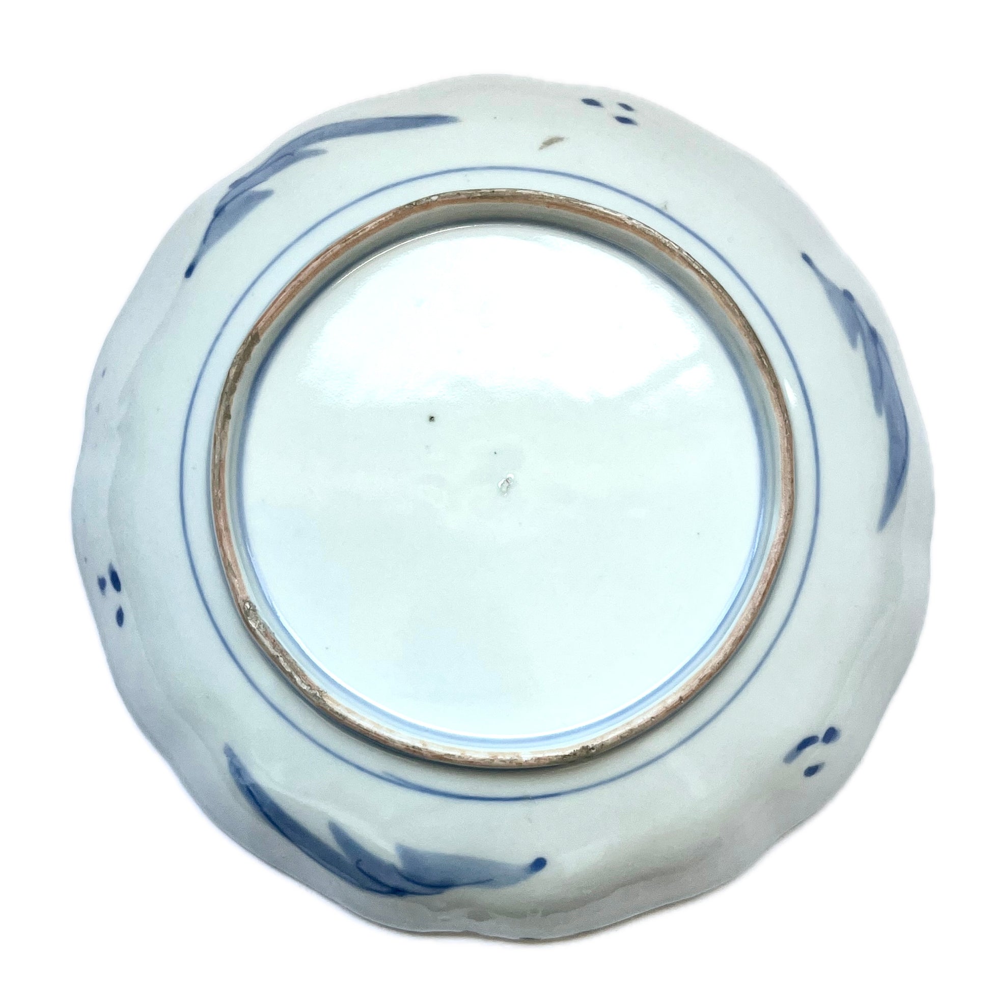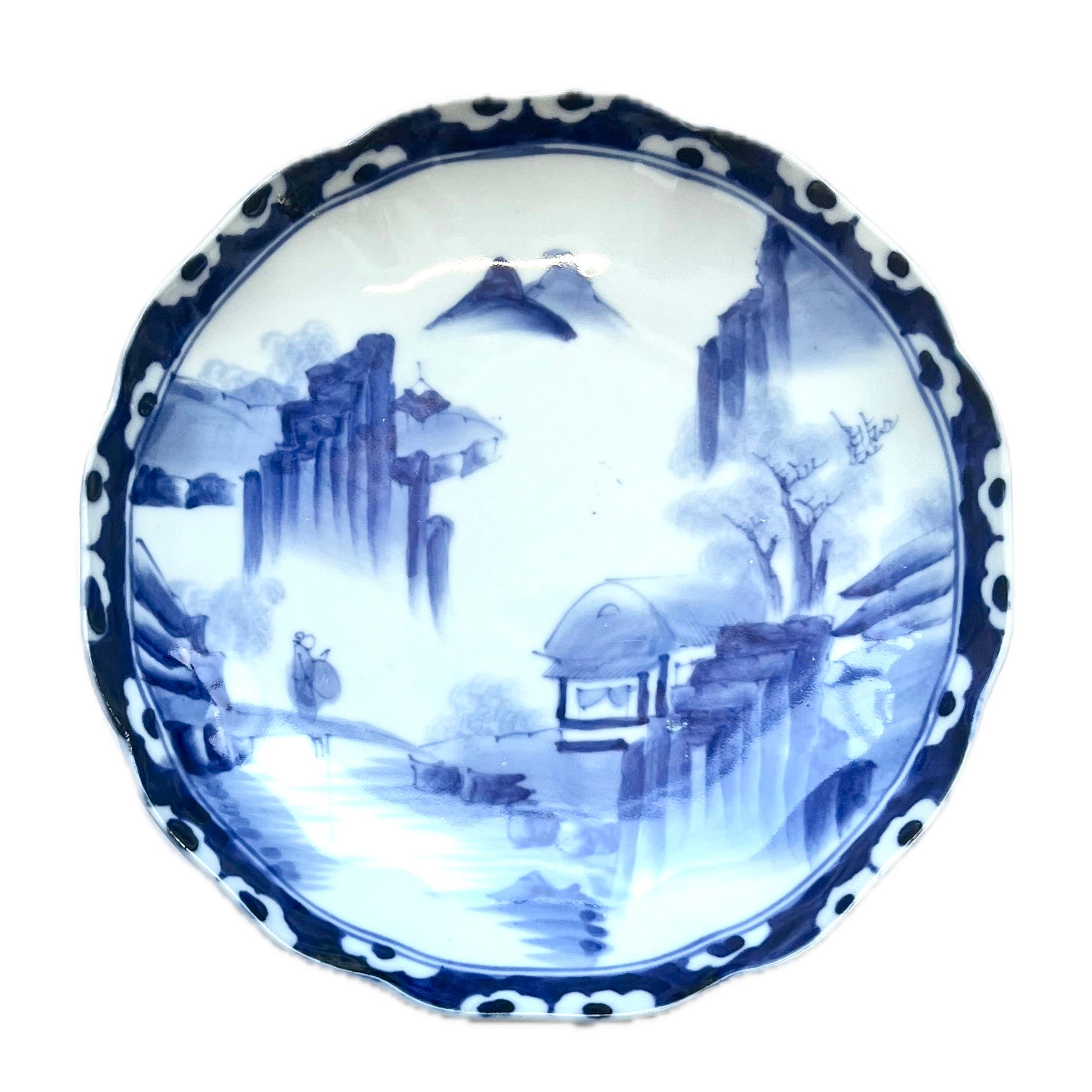 Precioso cuenco poco profundo de porcelana japonesa del período Edo, de finales del siglo XVIII a principios del XIX, pintado a mano con decoración bajo cubierta en azul cobalto que representa una escena de montaña y mar. El borde está decorado con flores de cerezo sobre un fondo azul cobalto. El reverso está decorado con elegantes pinceladas. El cuerpo de porcelana es blanco y de excelente calidad, con un esmaltado igualmente fino. En general, el plato es de excelente calidad y presenta una ligera textura de cáscara de naranja. Los lados del plato están ligeramente estriados para crear un efecto lobulado.