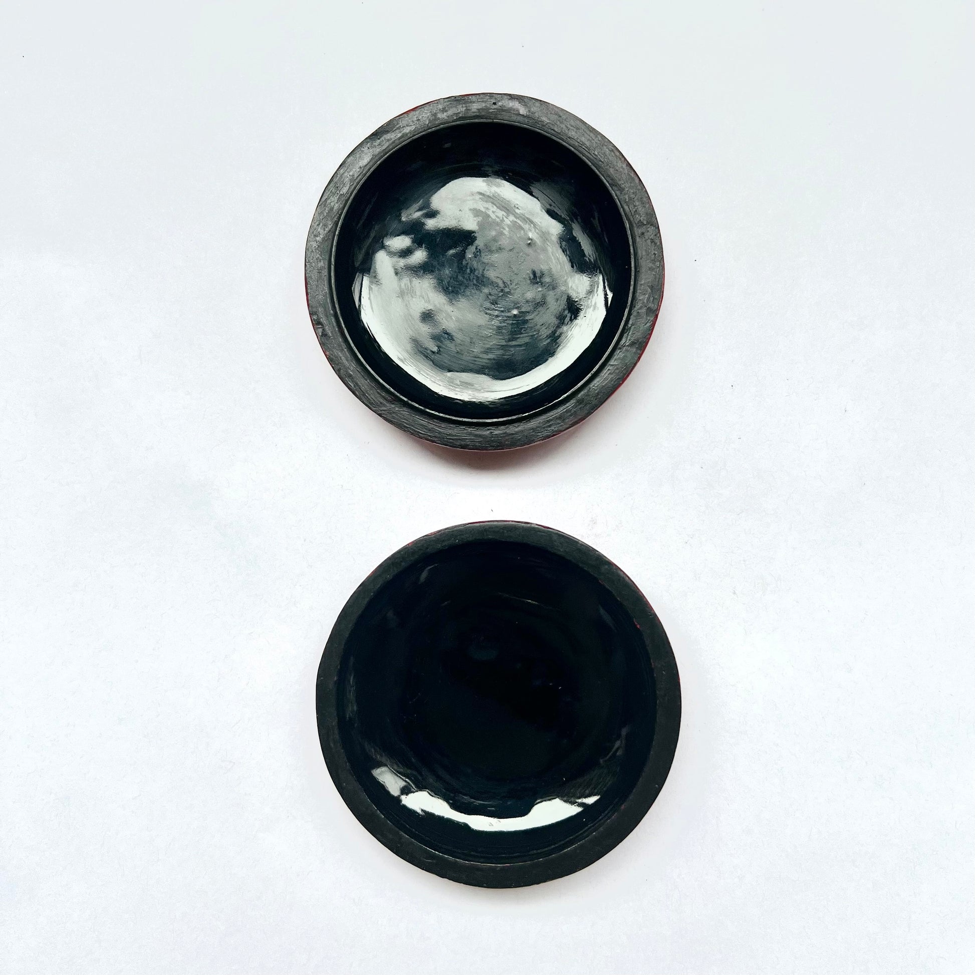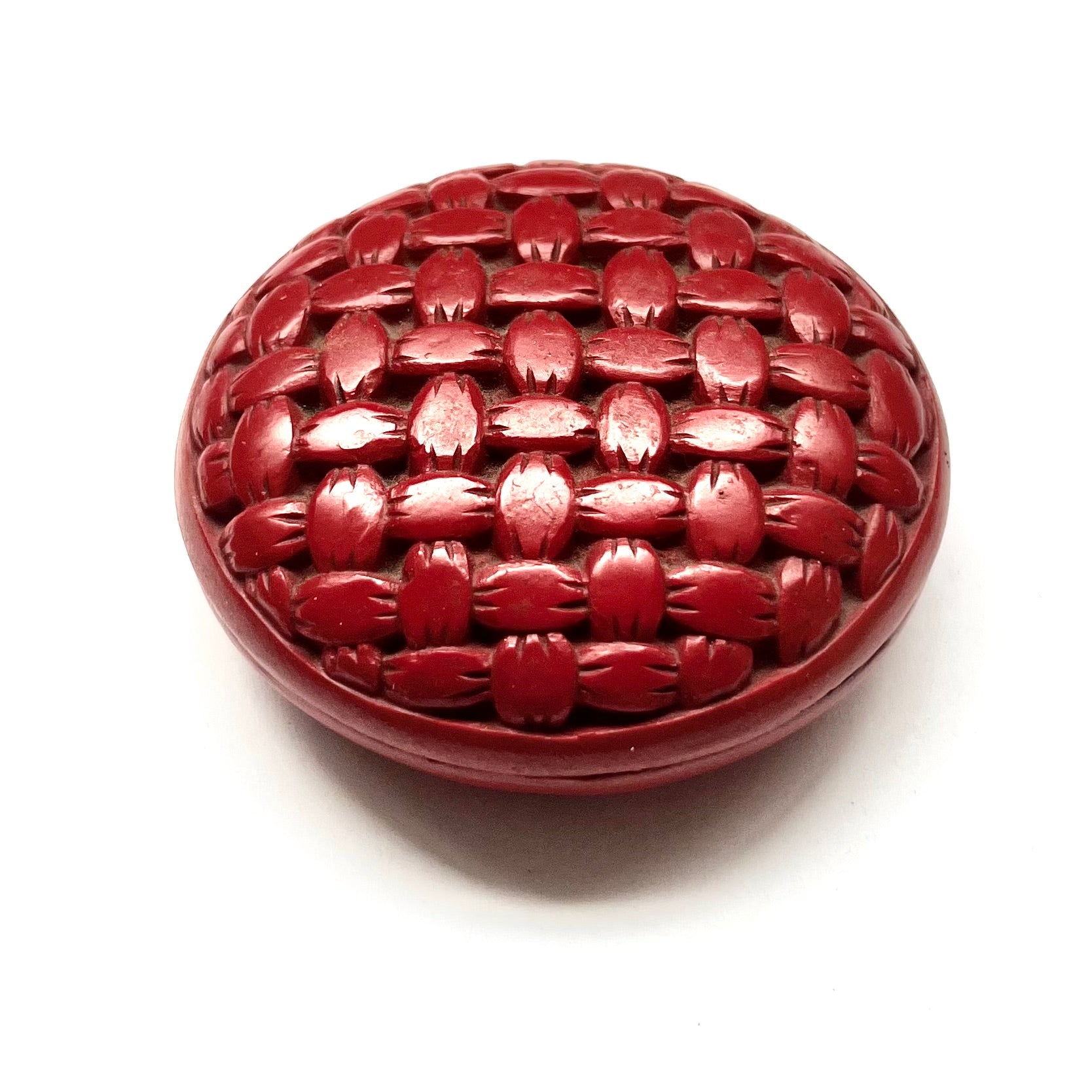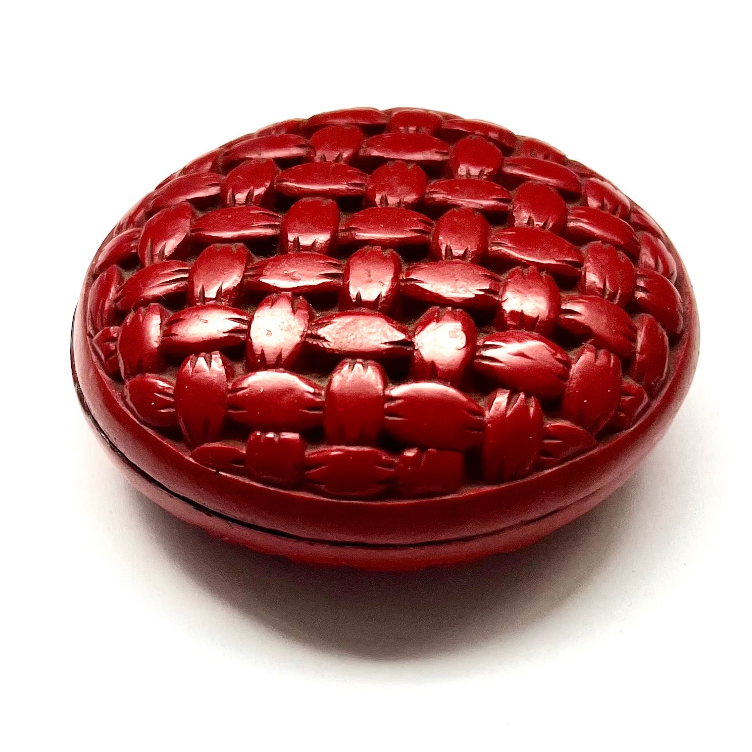 Una encantadora caja antigua japonesa de laca de cinabrio del periodo Meiji, tallada con un precioso patrón de nudos en la parte superior. Los intensos procesos empleados para crear y tallar la laca hacen que piezas como estas sean muy codiciadas; eran de calidad de exportación durante el siglo XIX y, con su intenso color rojo, siguen siendo muy coleccionables hoy en día.