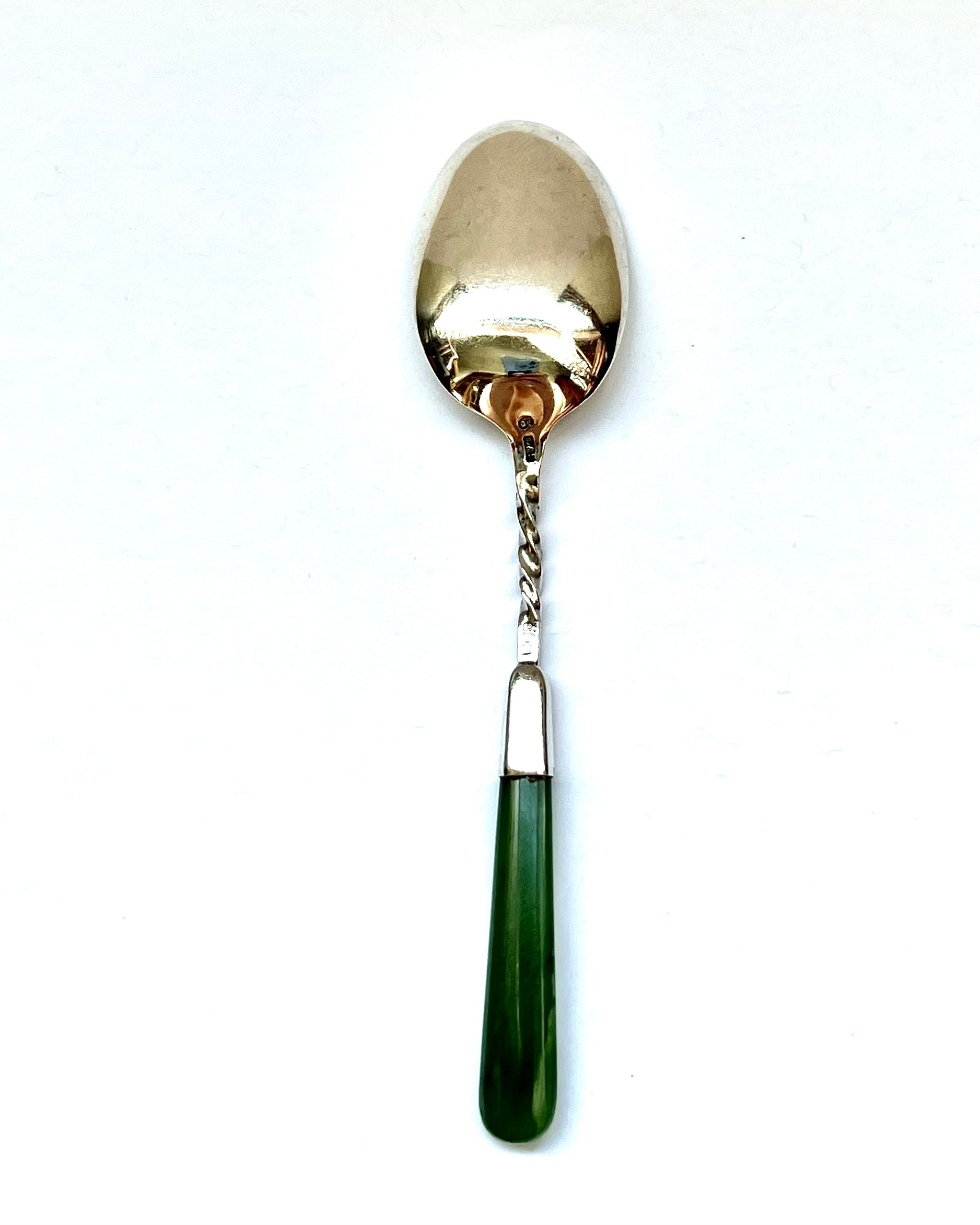 Pequeña pero muy elegante, esta rara y antigua cuchara de té neozelandesa de plata esterlina dorada con mango de jade nefrita ostenta el sello inglés de Birmingham de 1921, marca del patrocinador Levi & Salaman. Dado que los plateros eran relativamente poco comunes en Nueva Zelanda en aquella época, es probable que las hojas y engastes de plata se fabricaran en el Viejo Mundo y se enviaran a Nueva Zelanda, donde se habrían montado. Hermoso diseño repujado con motivos maoríes en el cuenco. Esta variedad de nefrita, originaria de Nueva Zelanda y otros países, ha sido apreciada a lo largo del tiempo por su belleza y su rico tono verde.