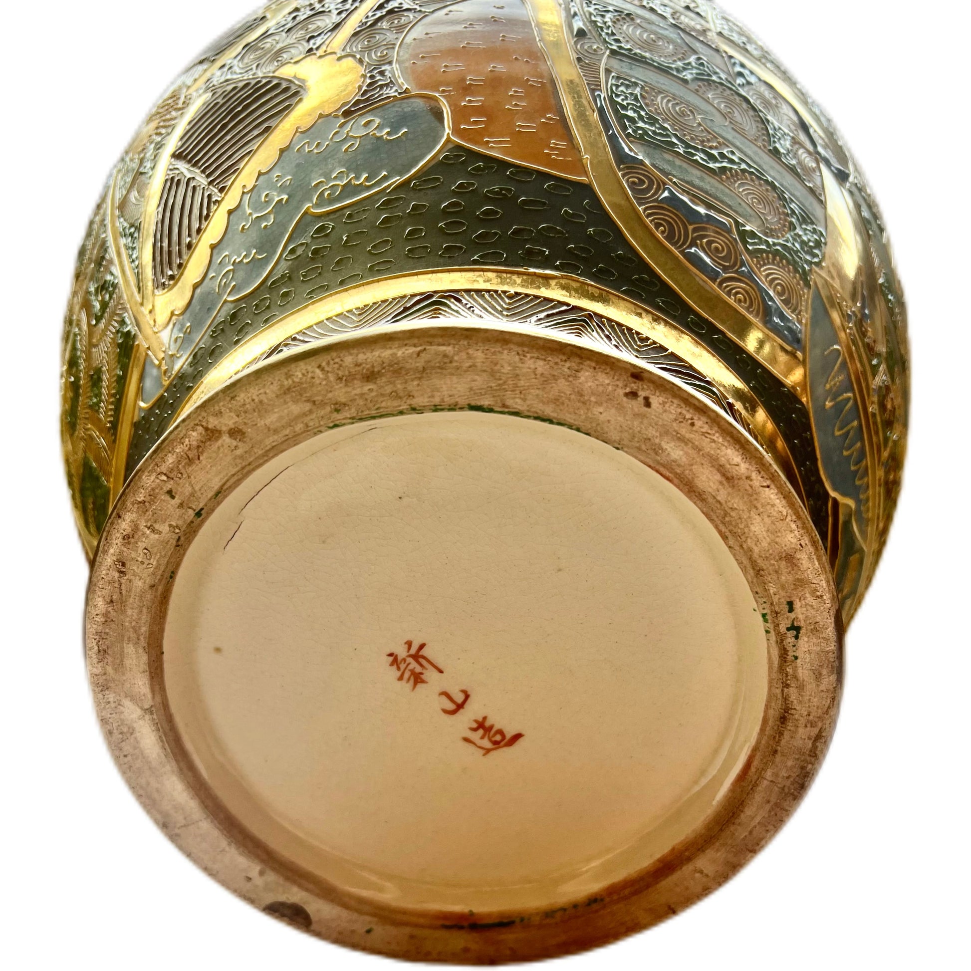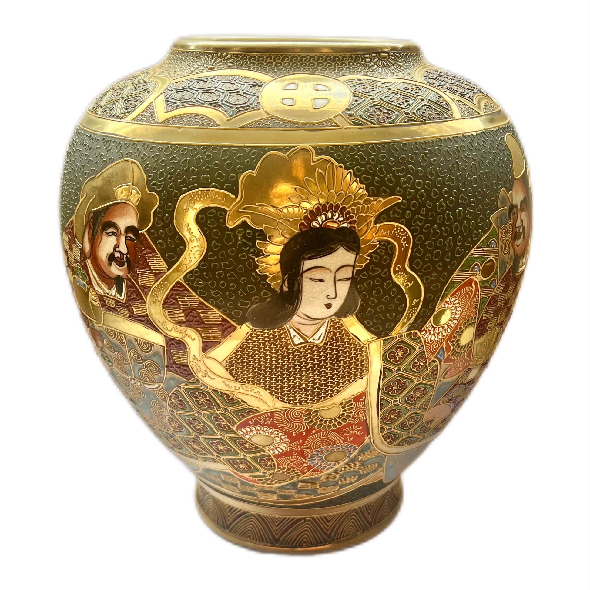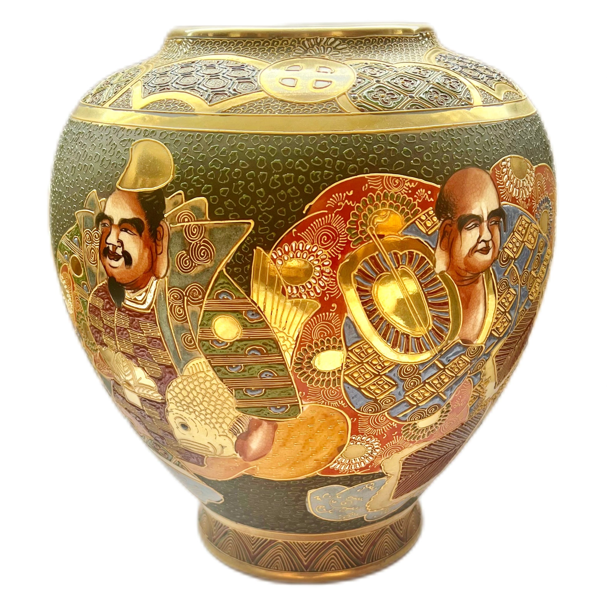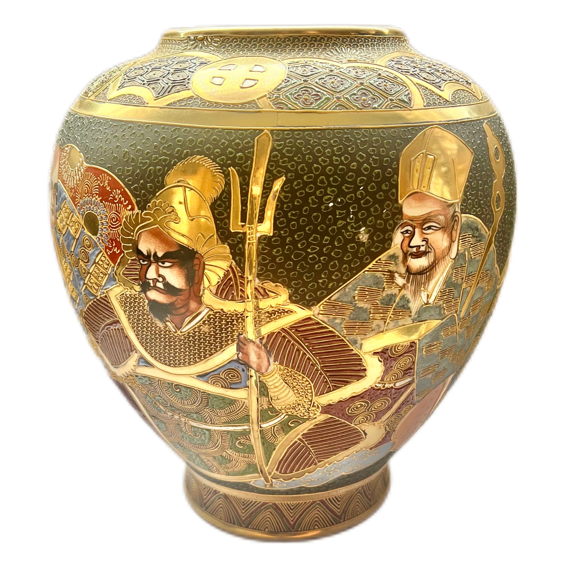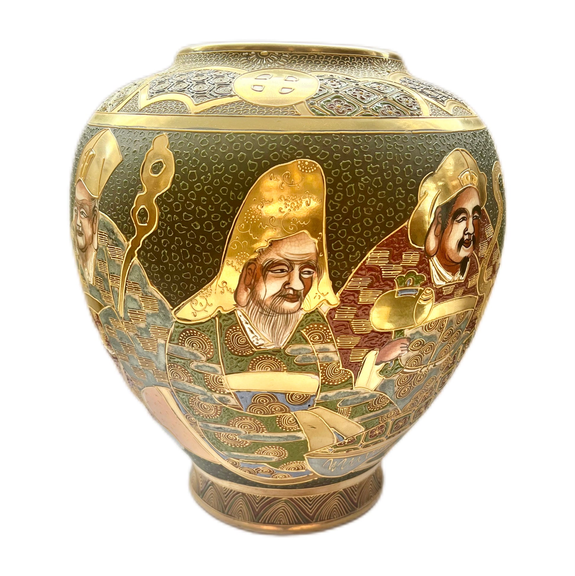 Jarrón Satsuma japonés de principios del siglo XX que representa a varios Inmortales, pintado a mano según la tradición Satsuma, con detalles dorados y pintados a mano. Esmaltes Moriage en alto relieve. Circa finales del periodo Meiji y principios del periodo Taisho.