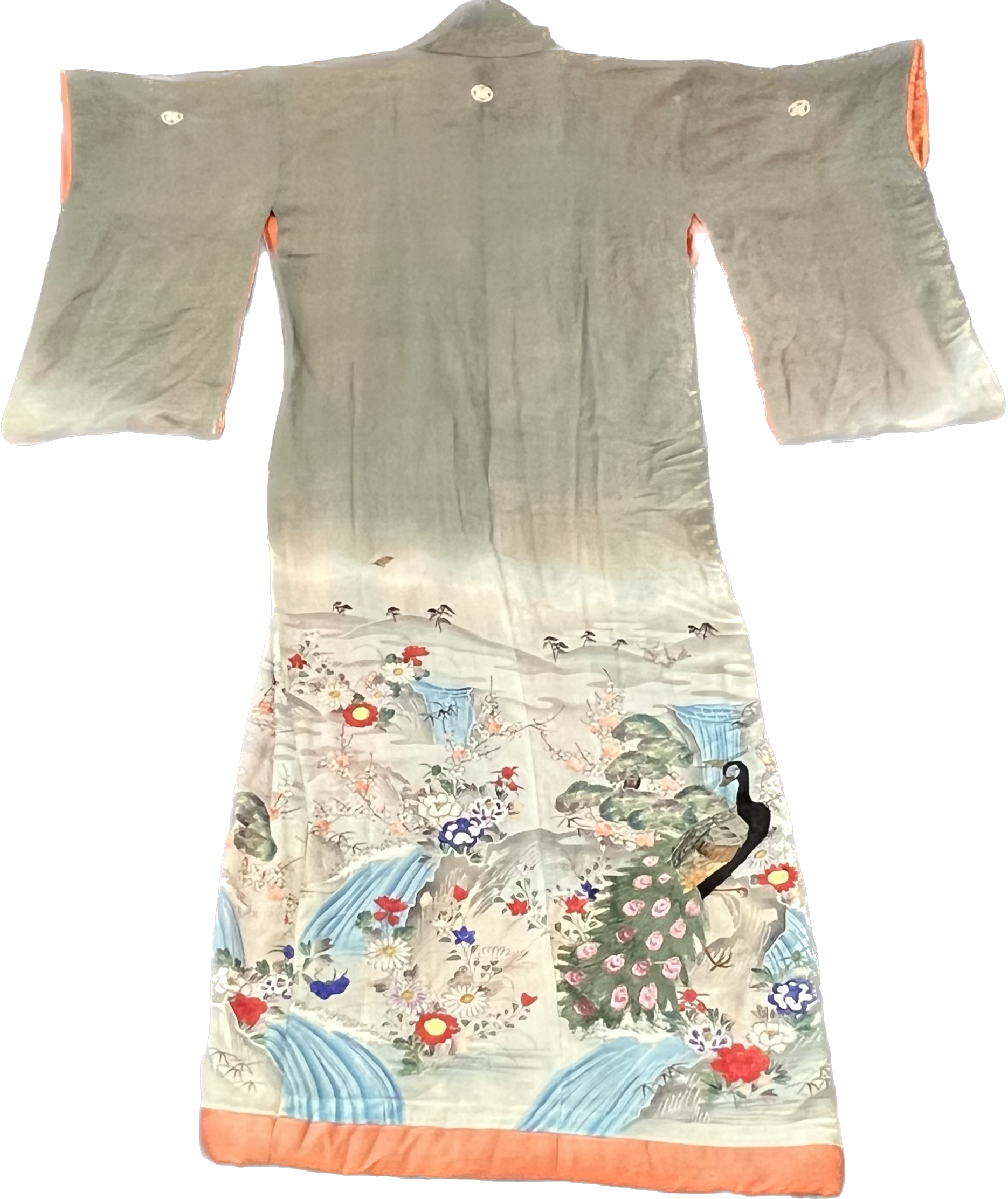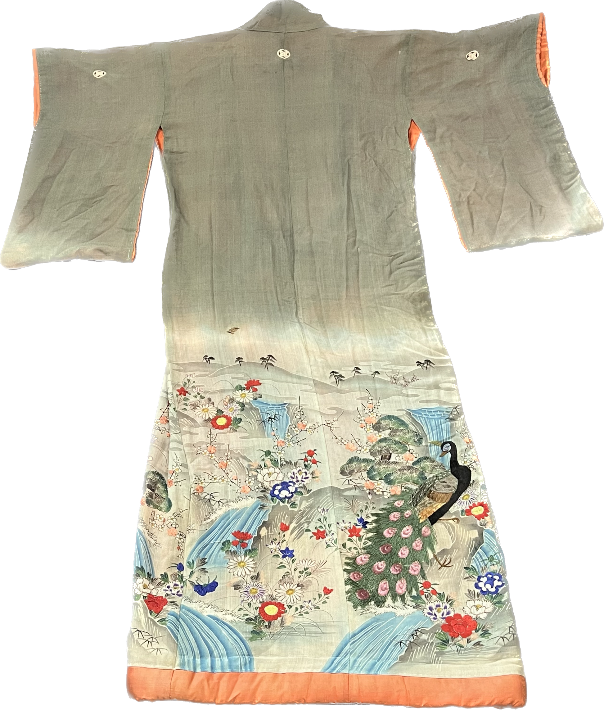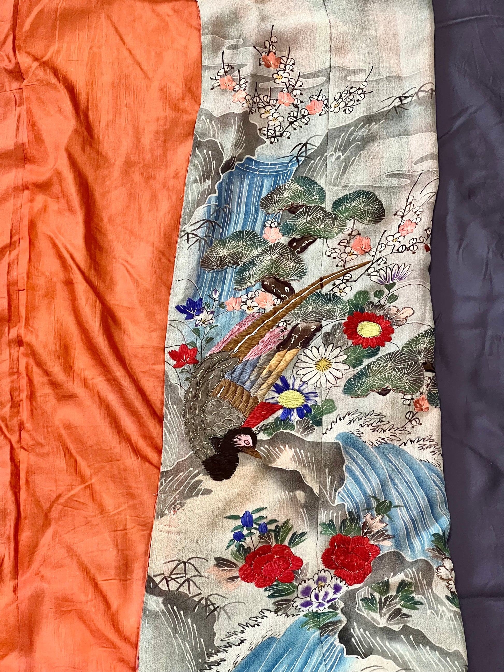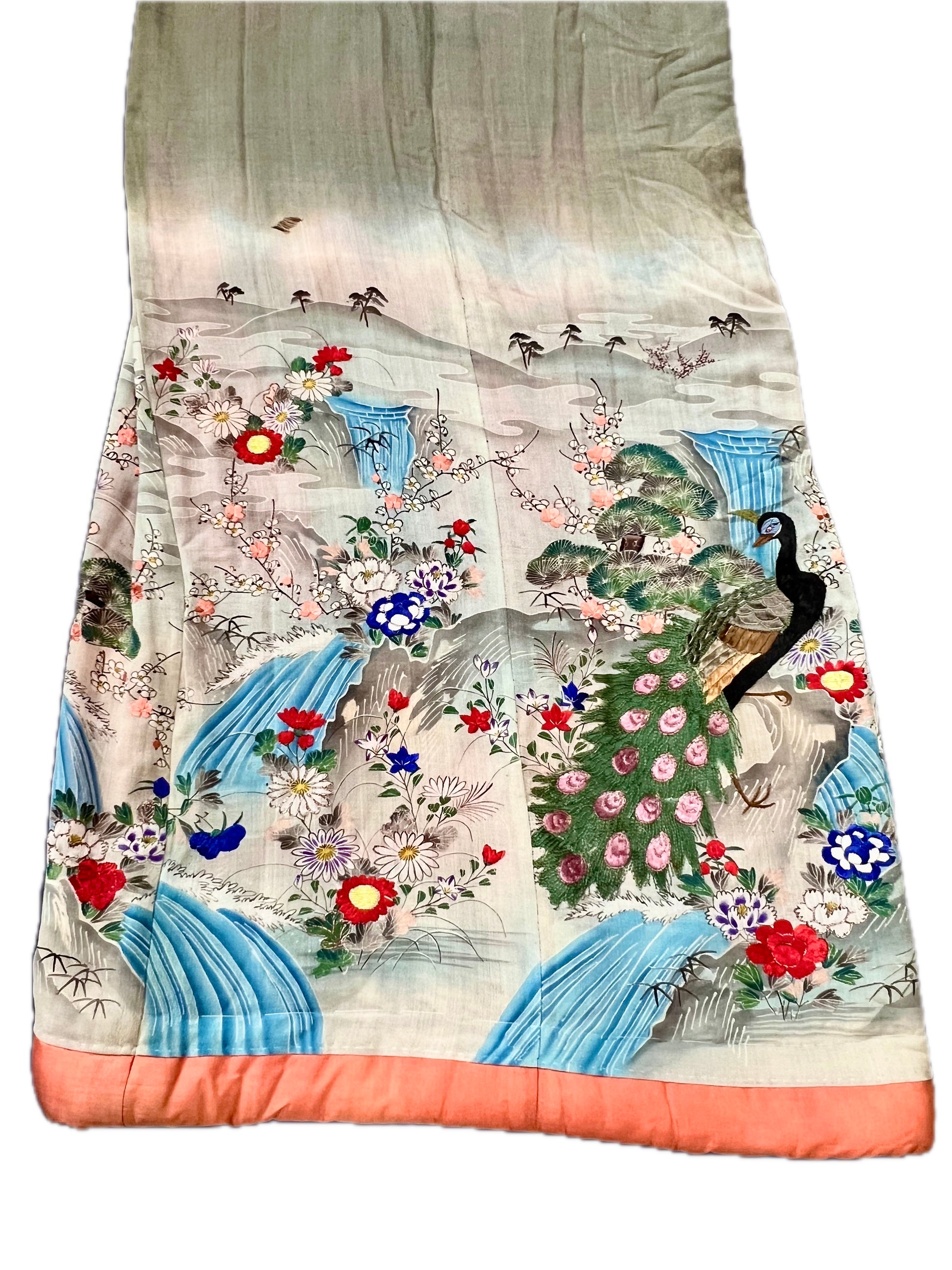 Este kimono está cortado al estilo tradicional de cuatro paneles para realzar el hermoso trabajo artístico en la parte delantera y trasera. Los motivos de pavo real y los pétalos de flores están bordados a mano, mientras que el paisaje montañoso está delicadamente pintado a mano. Este laborioso proceso implicaba que la confección de estos kimonos podía tardar hasta un año.