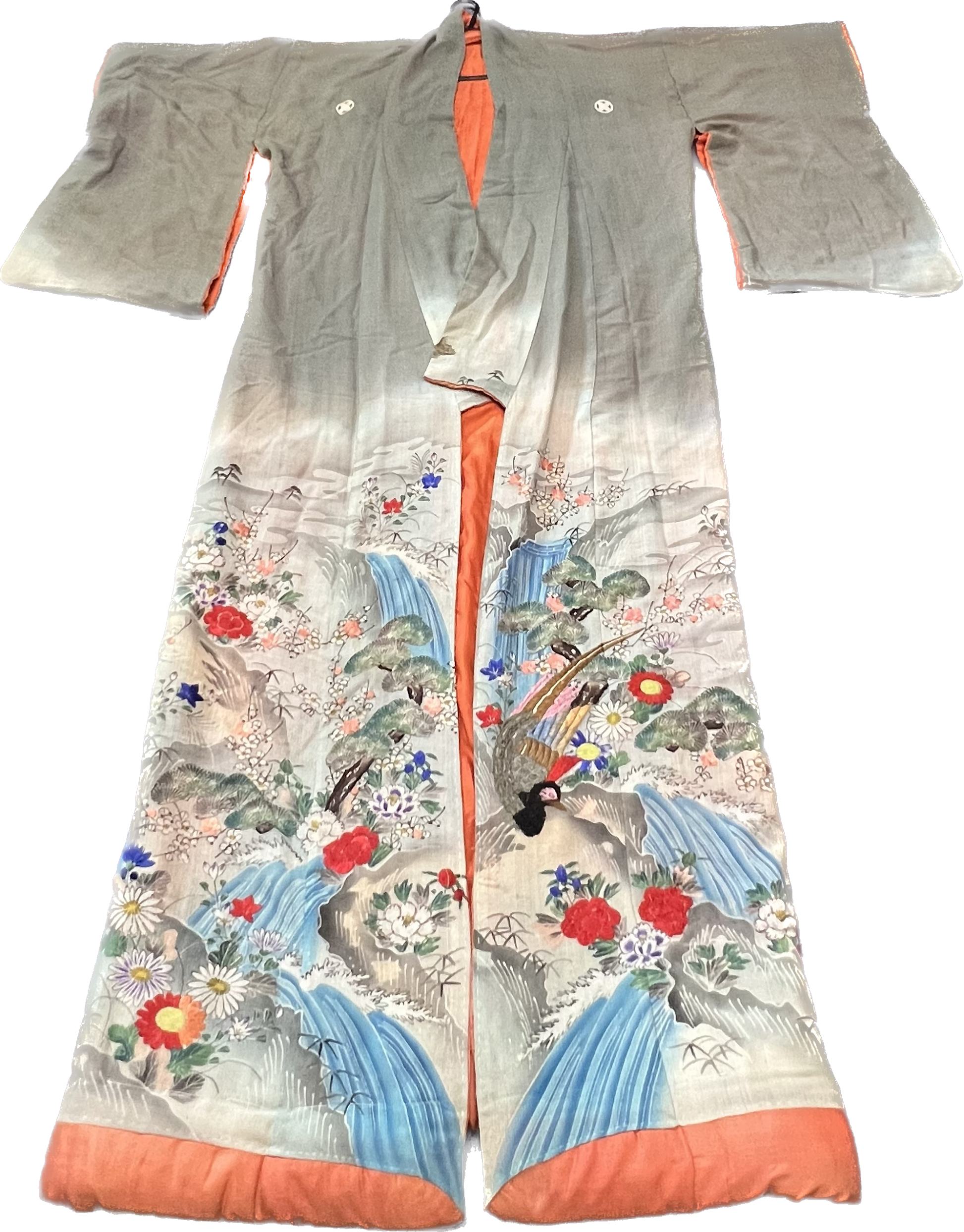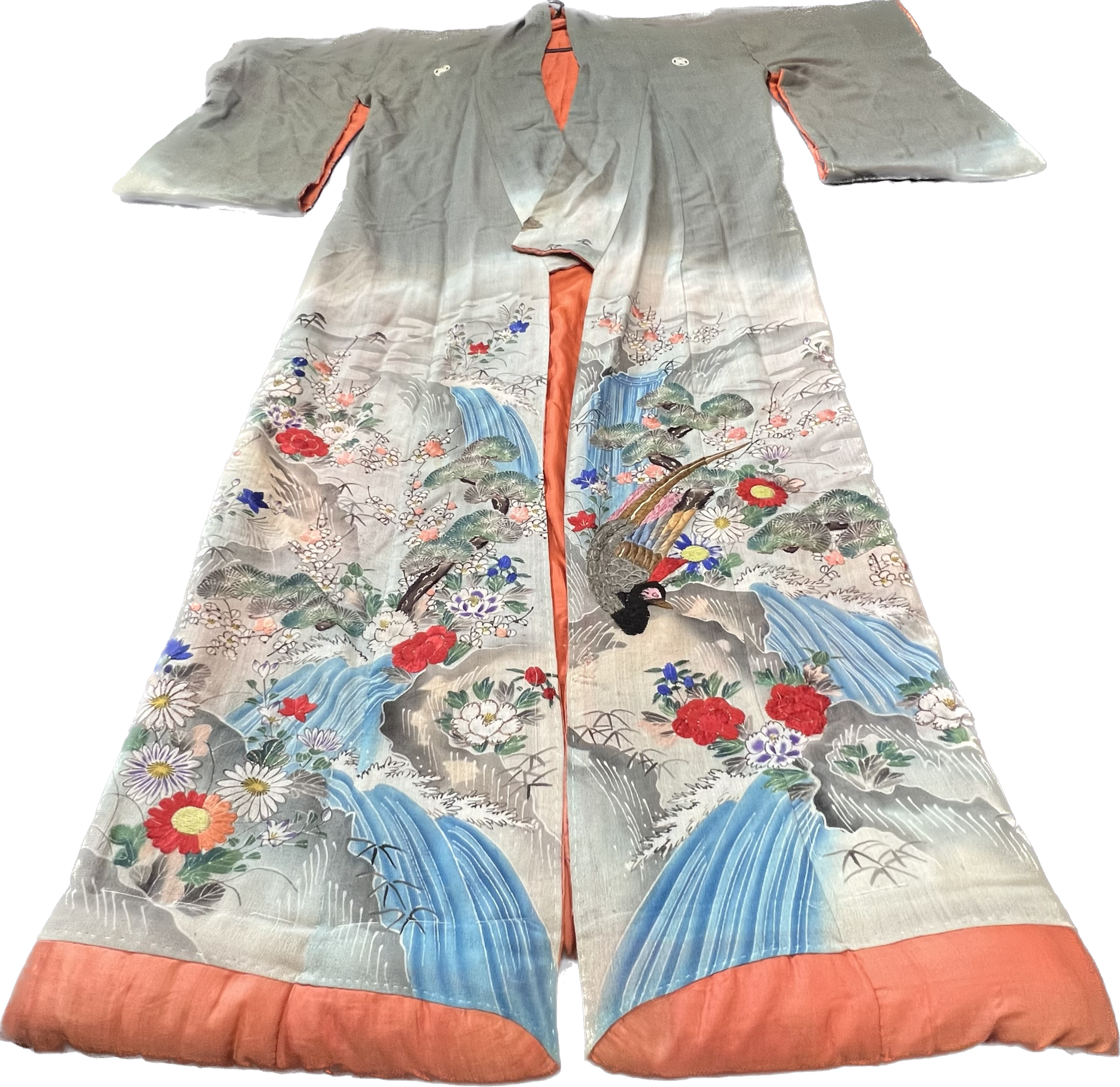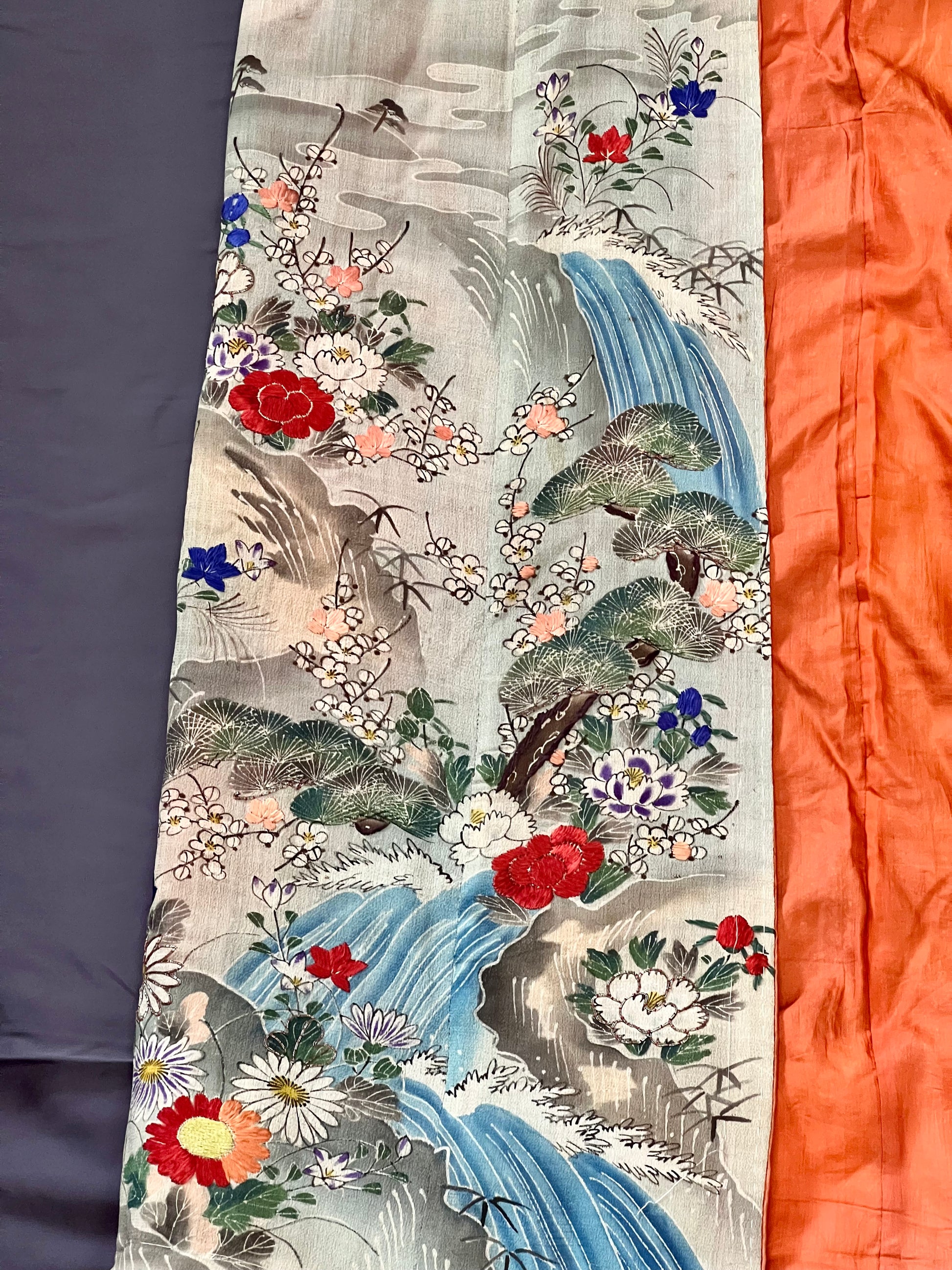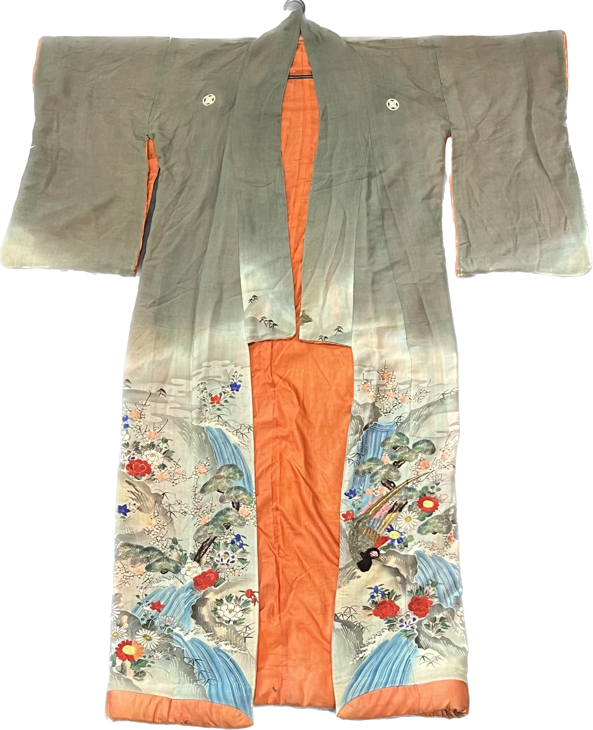 Este kimono está cortado al estilo tradicional de cuatro paneles para realzar el hermoso trabajo artístico en la parte delantera y trasera. Los motivos de pavo real y los pétalos de flores están bordados a mano, mientras que el paisaje montañoso está delicadamente pintado a mano. Este laborioso proceso implicaba que la confección de estos kimonos podía tardar hasta un año.