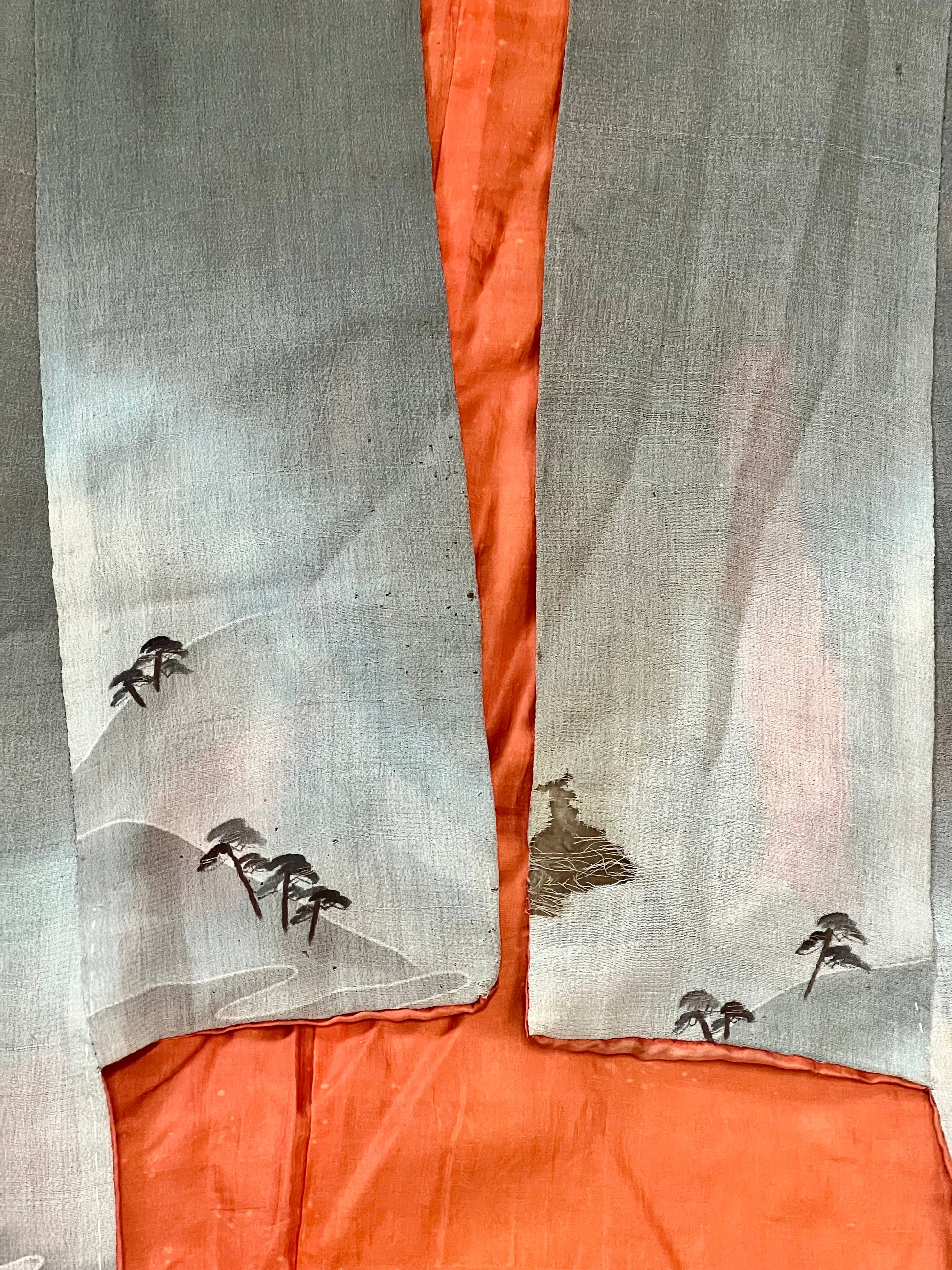 La seda Chirimen es un proceso japonés tradicional que requiere más seda cruda que la producción de seda moderna debido al método de alta torsión y al proceso de tejido; cuando se usa en combinación con teñido y pintura a mano como vemos aquí, esto crea una mayor variación de profundidad y luminosidad.