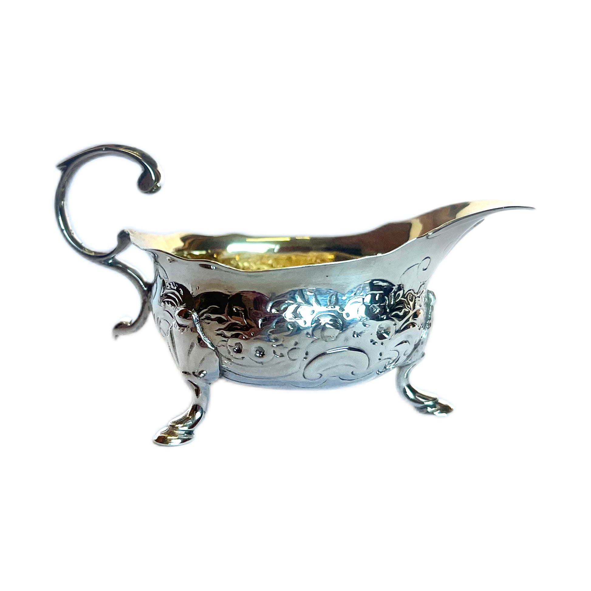 Beautiful George II sterling silver creamer jug, with marks for London, 1742, John Pollock. Exceptional details including a gilt-washed bowl, repousse motifs and pad feet.