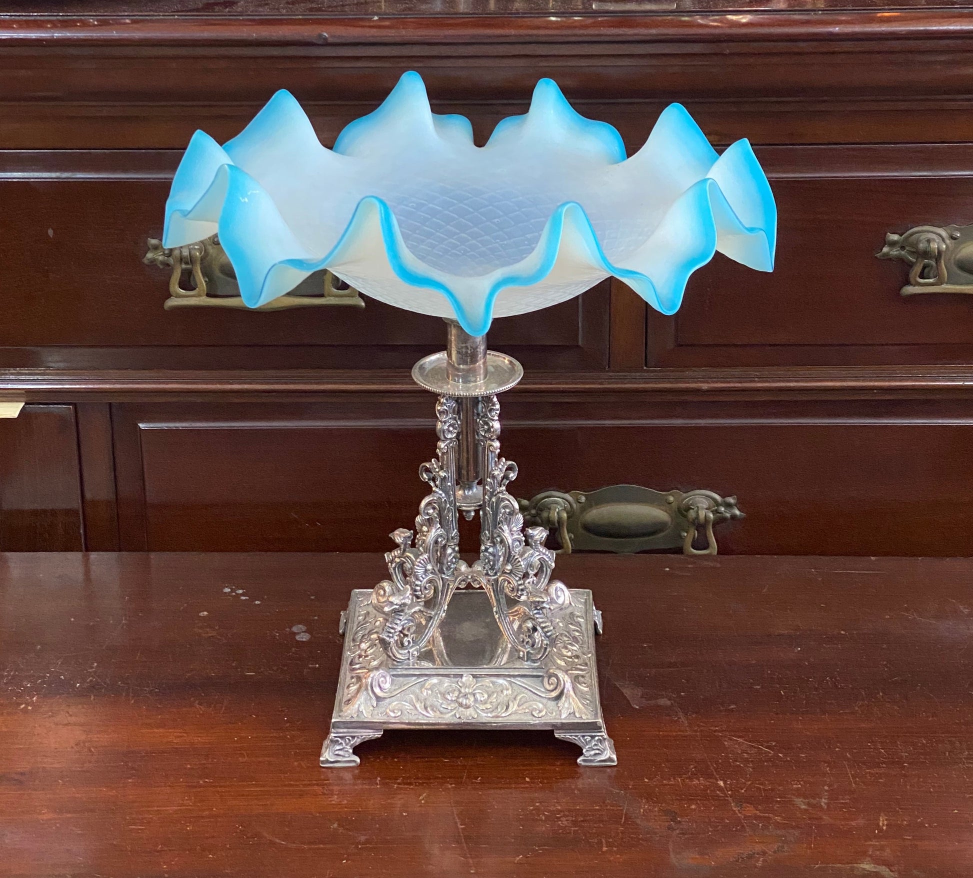 Preciosa pieza central plateada de James Dixon & Sons, de finales del siglo XIX. Preciosa cómoda de cristal vaselinado con borde festoneado.