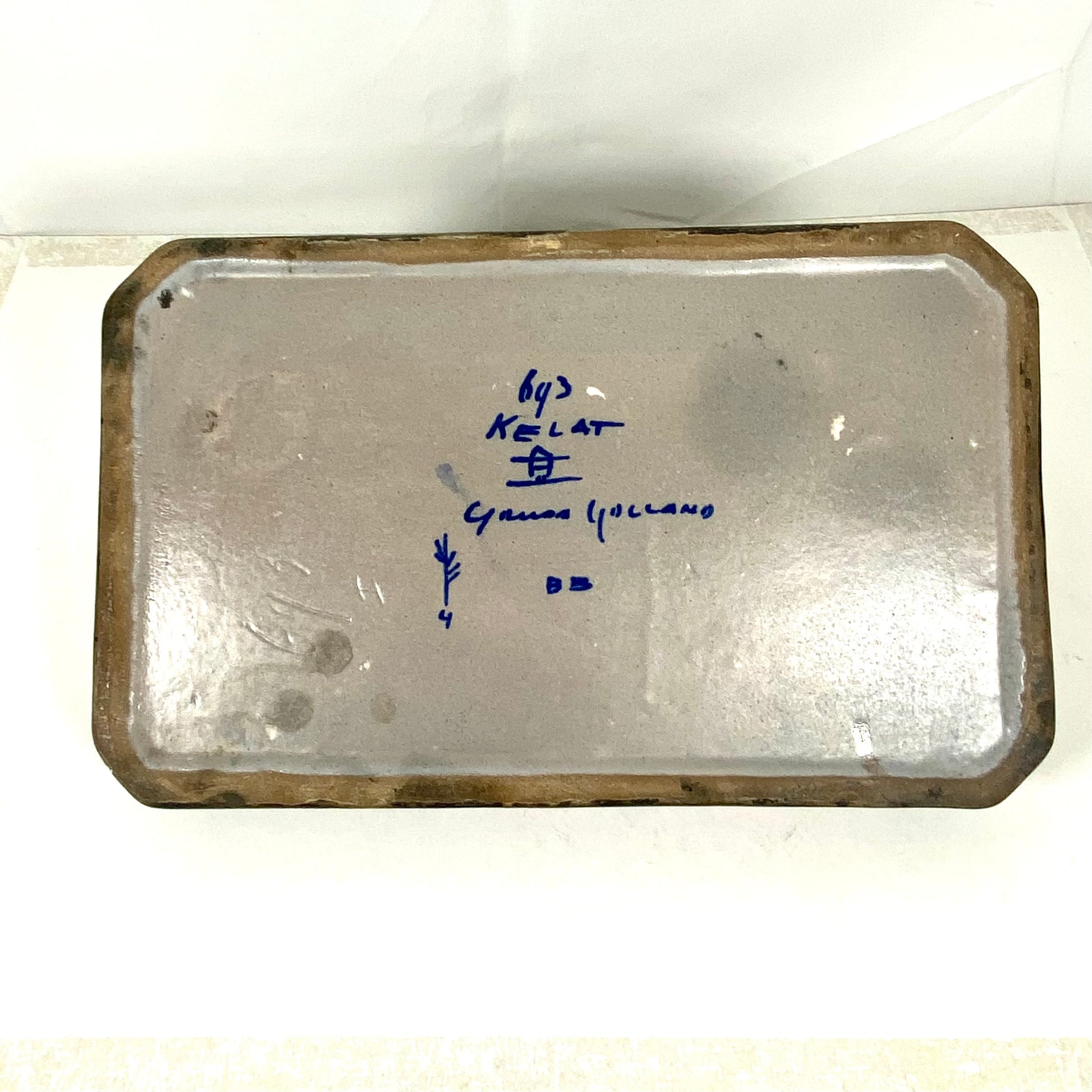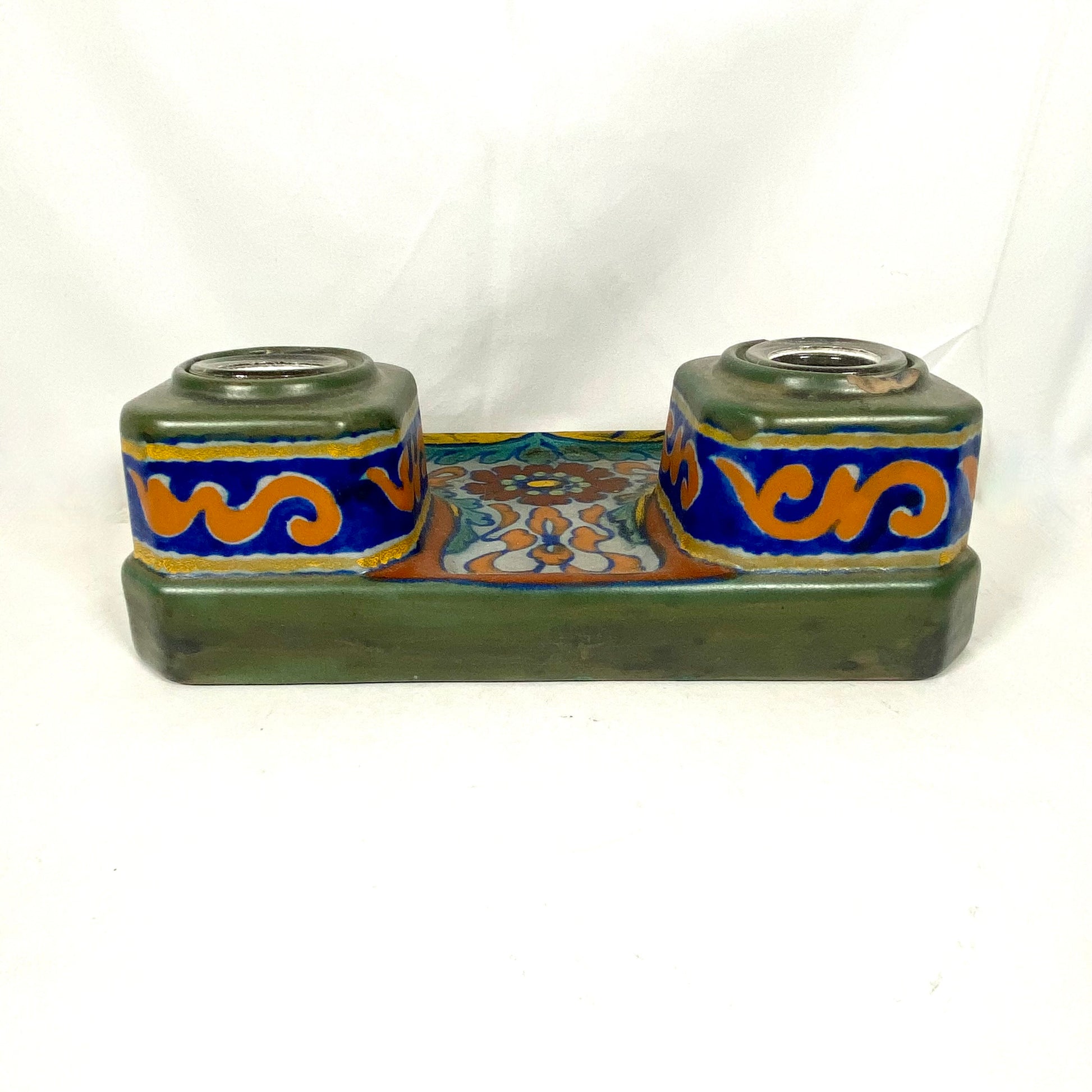 Código de fecha de aproximadamente 1920 pintado a mano en la parte inferior; posible error ortográfico en el código de fecha, pero el estilo y el patrón corresponden a principios de la década de 1920 en cuanto a fabricación. También se incluyen marcas en la base para el número de patrón y diseño (Kelat 643), las iniciales del decorador y la firma de la casa Lazarus de la fábrica PZH. Los juegos de tinta doble Gouda para escritorio simplemente no se comercializan, y es probable que este sea el único disponible actualmente con este patrón.