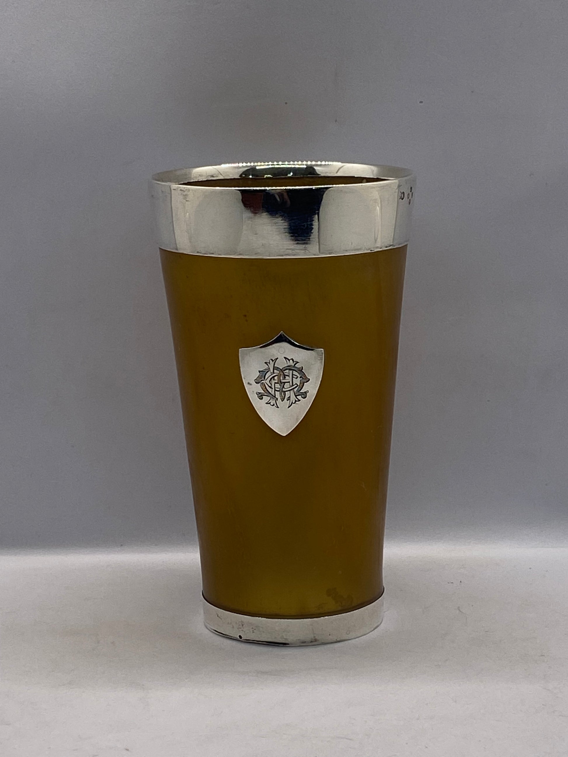 Este precioso vaso de cuerno y plata de ley del siglo XIX, de estilo victoriano, cuenta con el sello distintivo de George Adams (Chawner and Co.), Londres, 1872. Es una pieza elegante y sería una excelente adición a un estudio, biblioteca o a la colección de bar de una persona adinerada. Un monograma en el cartucho del escudo le añade interés a esta pieza ya de por sí destacada. El fondo, forrado de vidrio, se encuentra en excelentes condiciones.