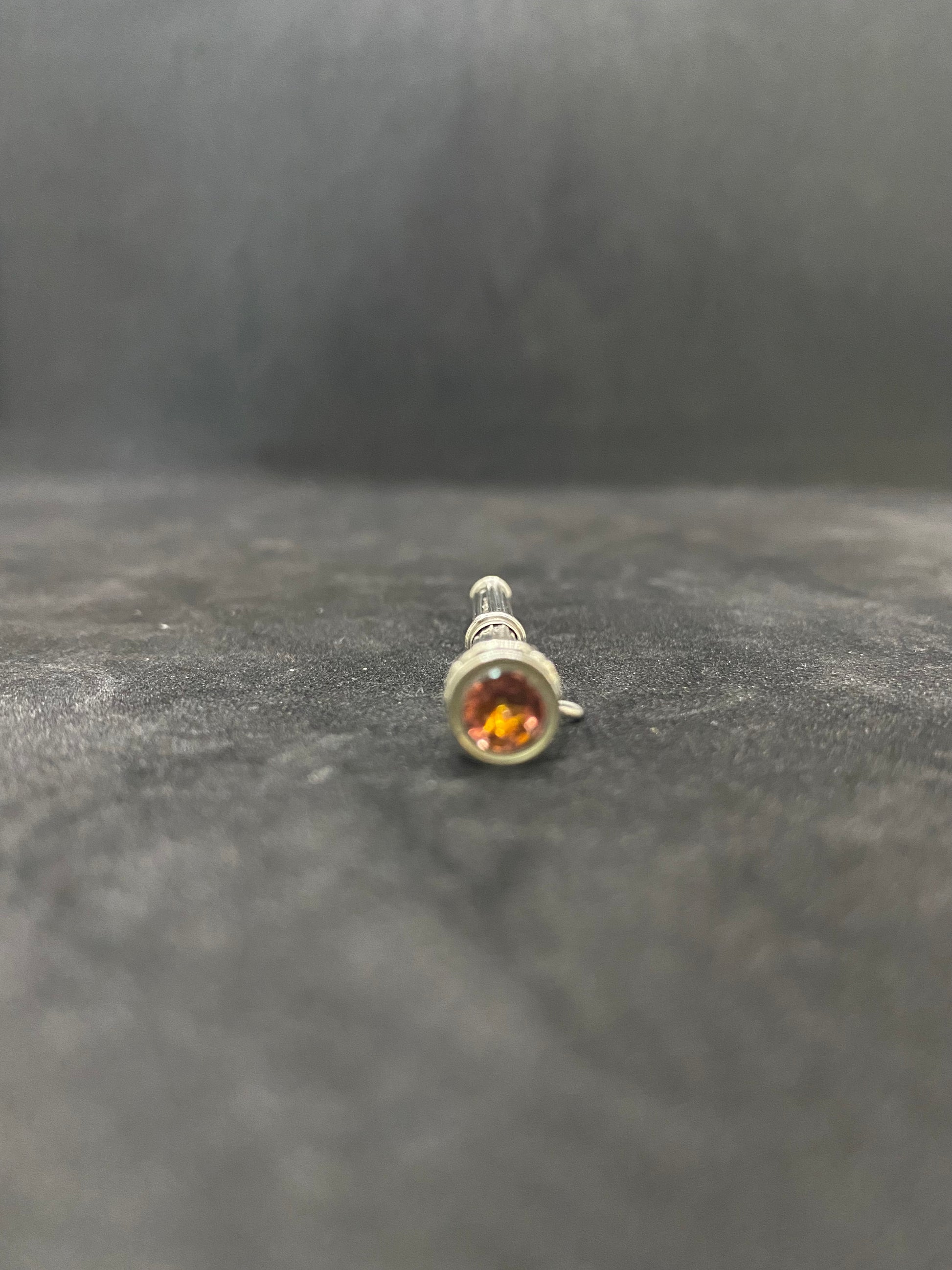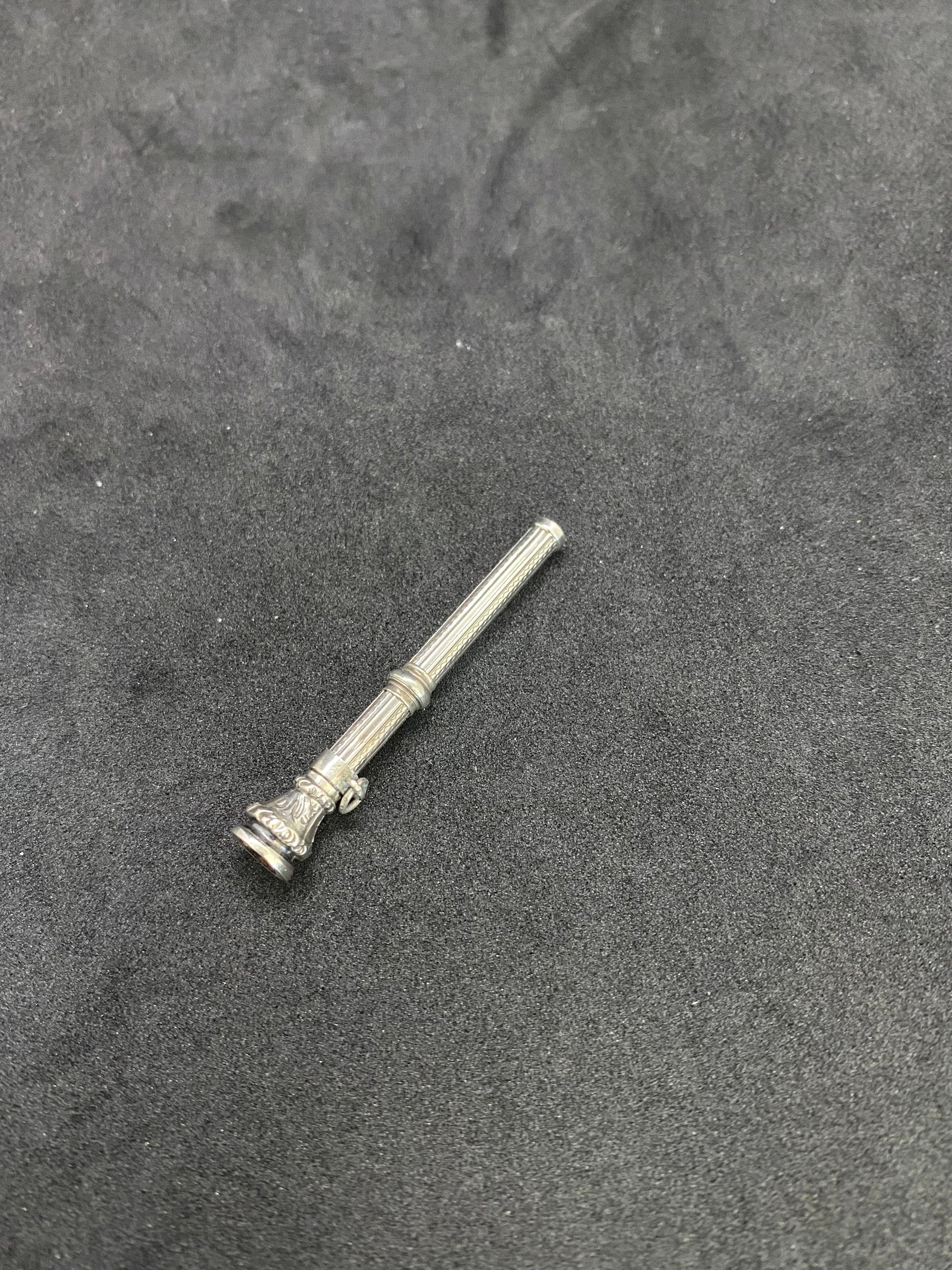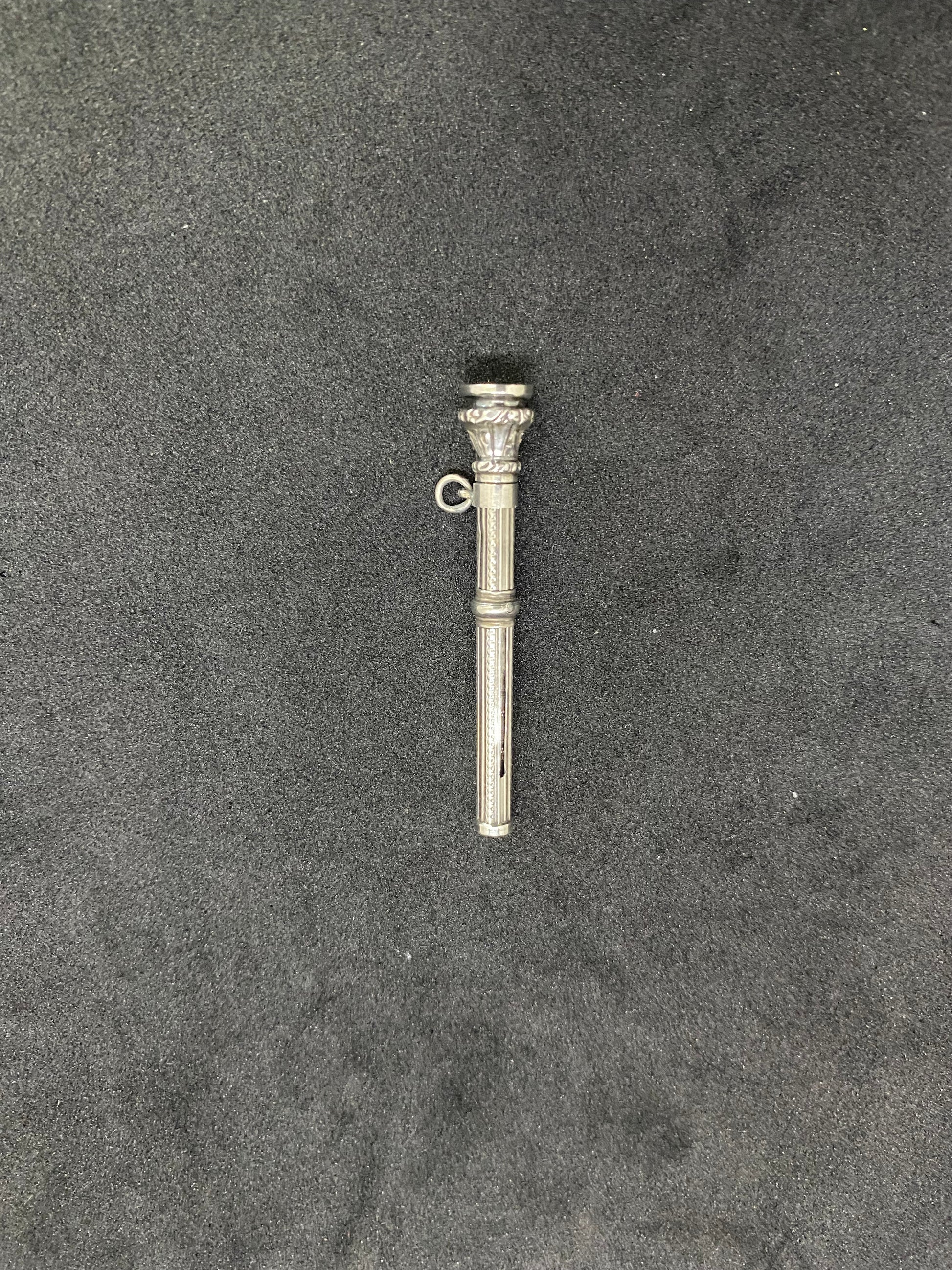 Un precioso portaminas en miniatura, probablemente de finales de la época victoriana (fines del siglo XIX), fabricado en plata de ley y rematado con un sello de cristal de color citrino.