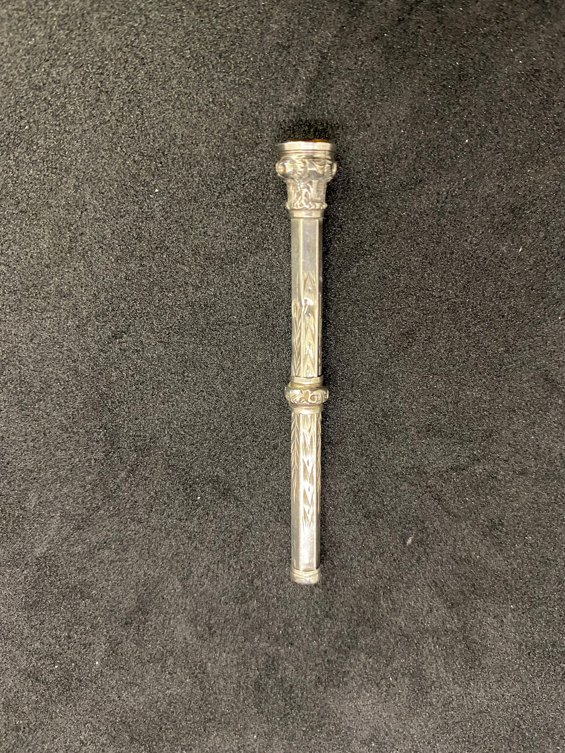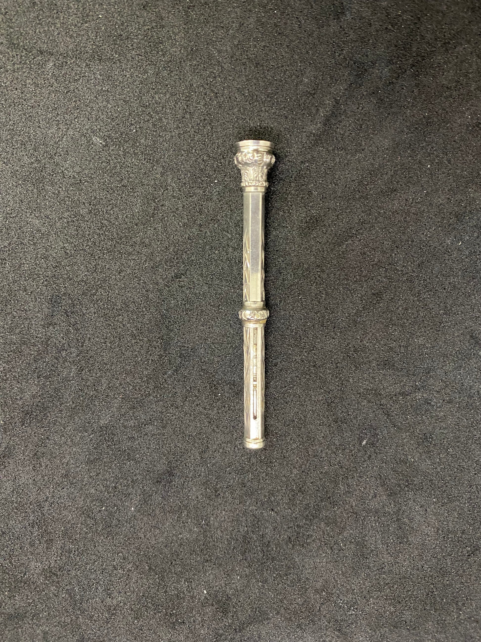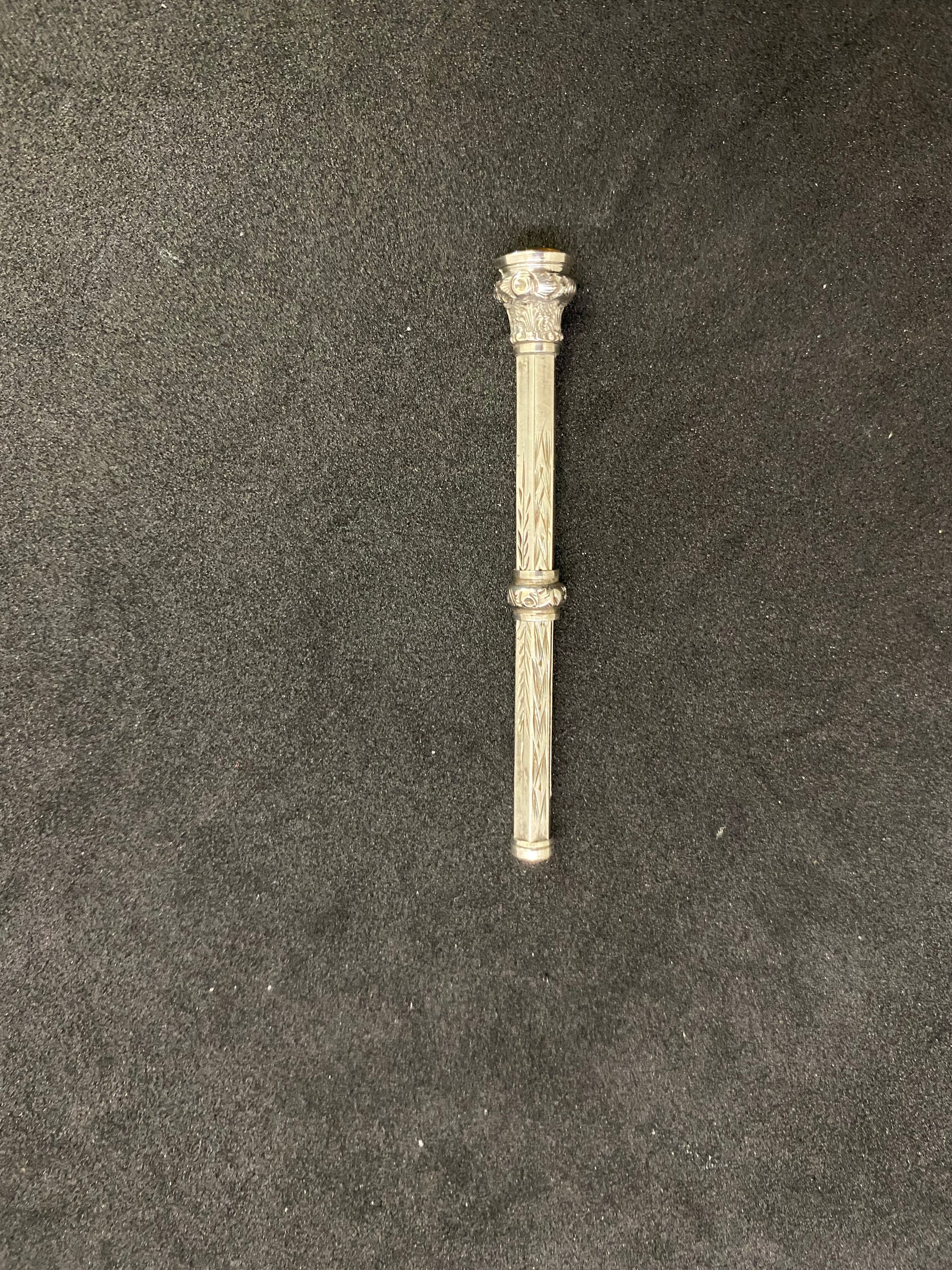 Un hermoso portaminas en miniatura, probablemente de finales de la época victoriana (fines del siglo XIX), fabricado en plata de ley y rematado con un sello de citrino en la parte superior.