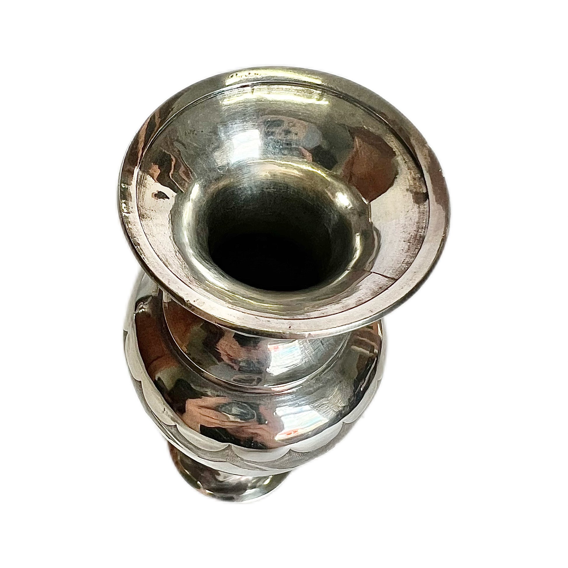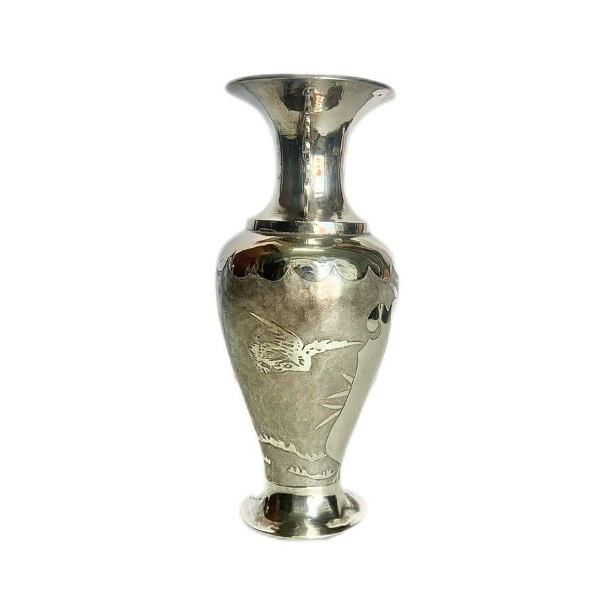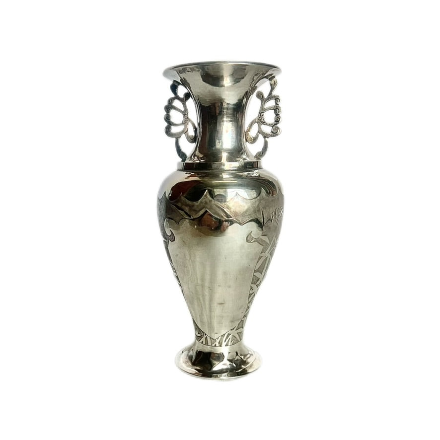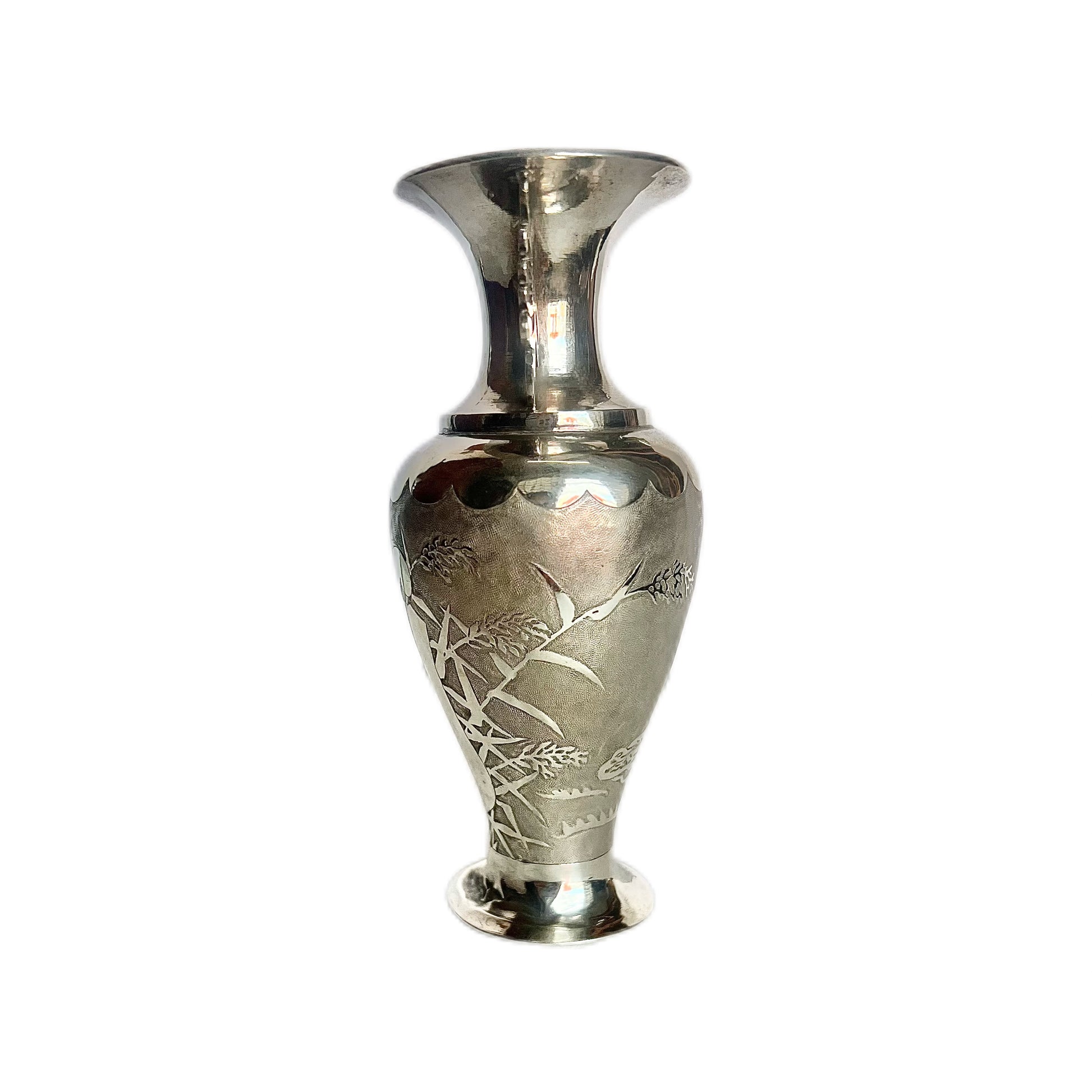 A beautiful late 19th to early 20th century Japanese export silver posy vase, beautifully made with pierced handles, a blank escutcheon-shaped cartouche and engraved tree patterns, which emerges near the base as repousse motifs creating a dimensional effect.