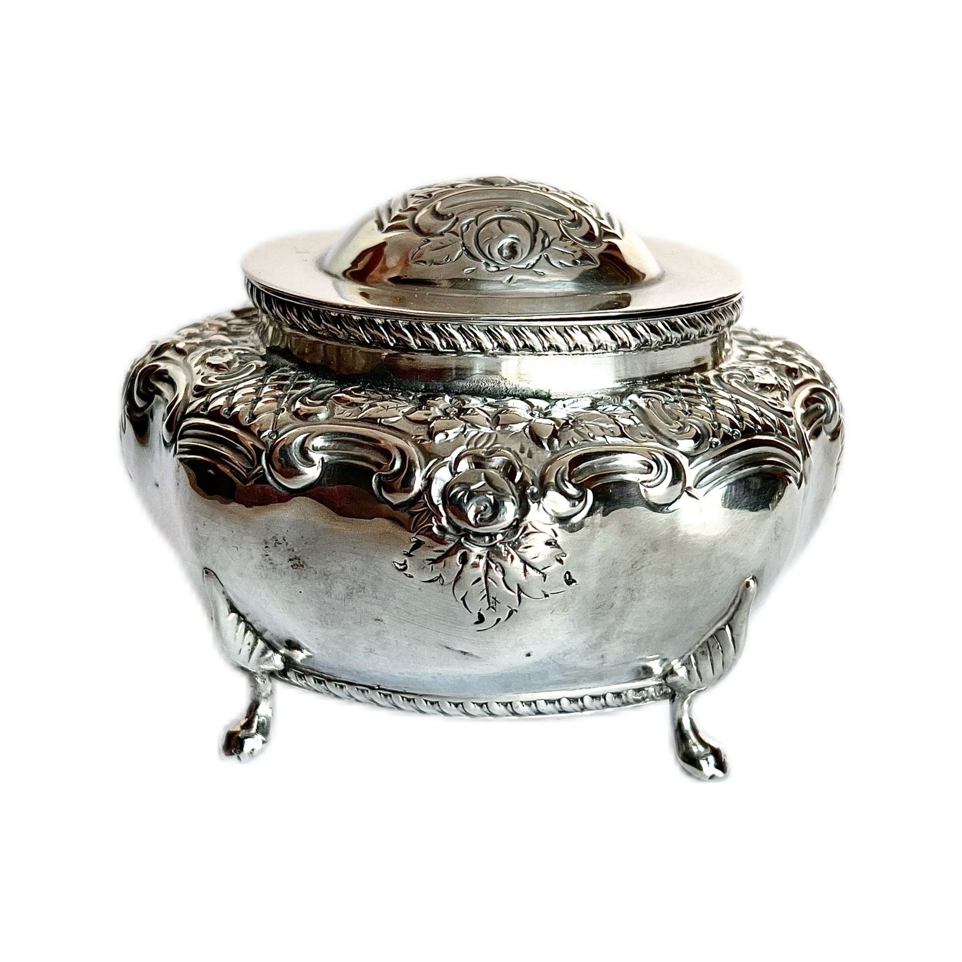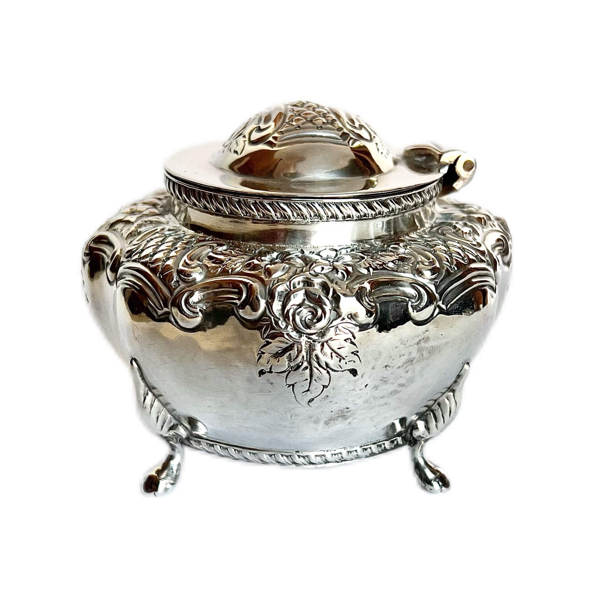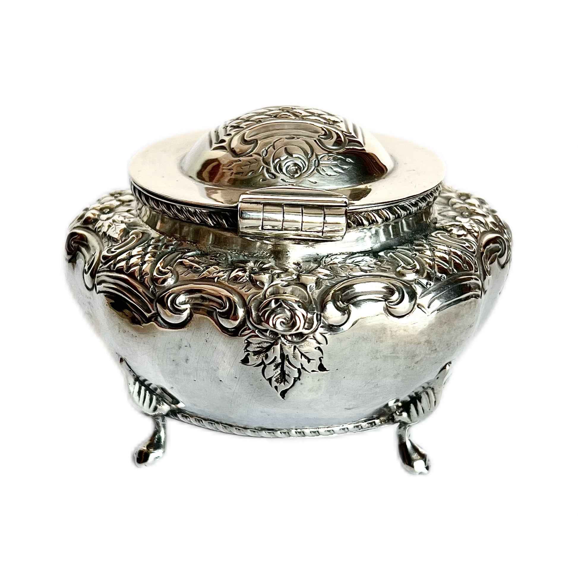 Lovely Rococco Revival details including rope-twist border details, repousse motifs to lid and base and clawed feet.