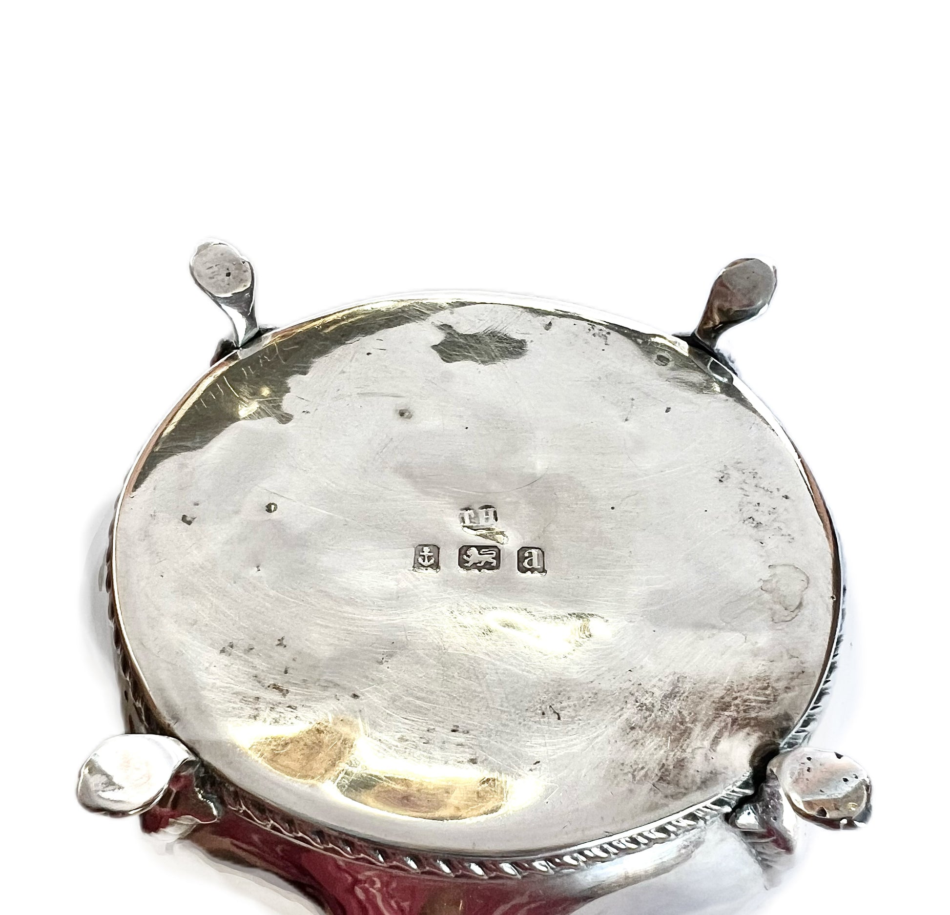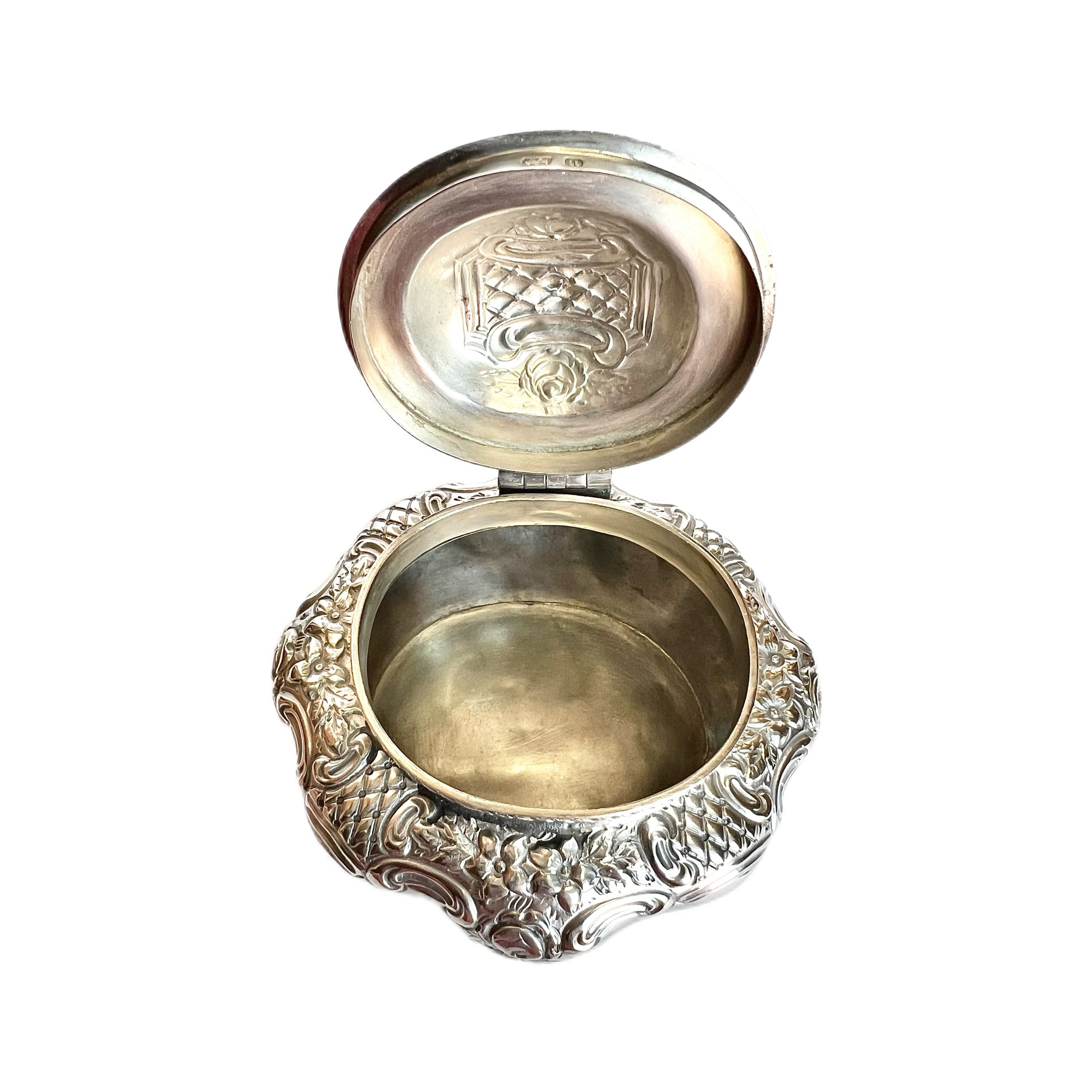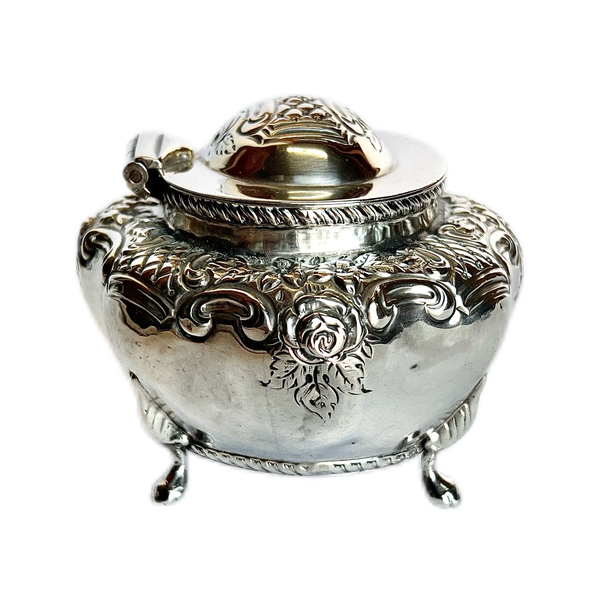 Lovely Rococco Revival details including rope-twist border details, repousse motifs to lid and base and clawed feet.