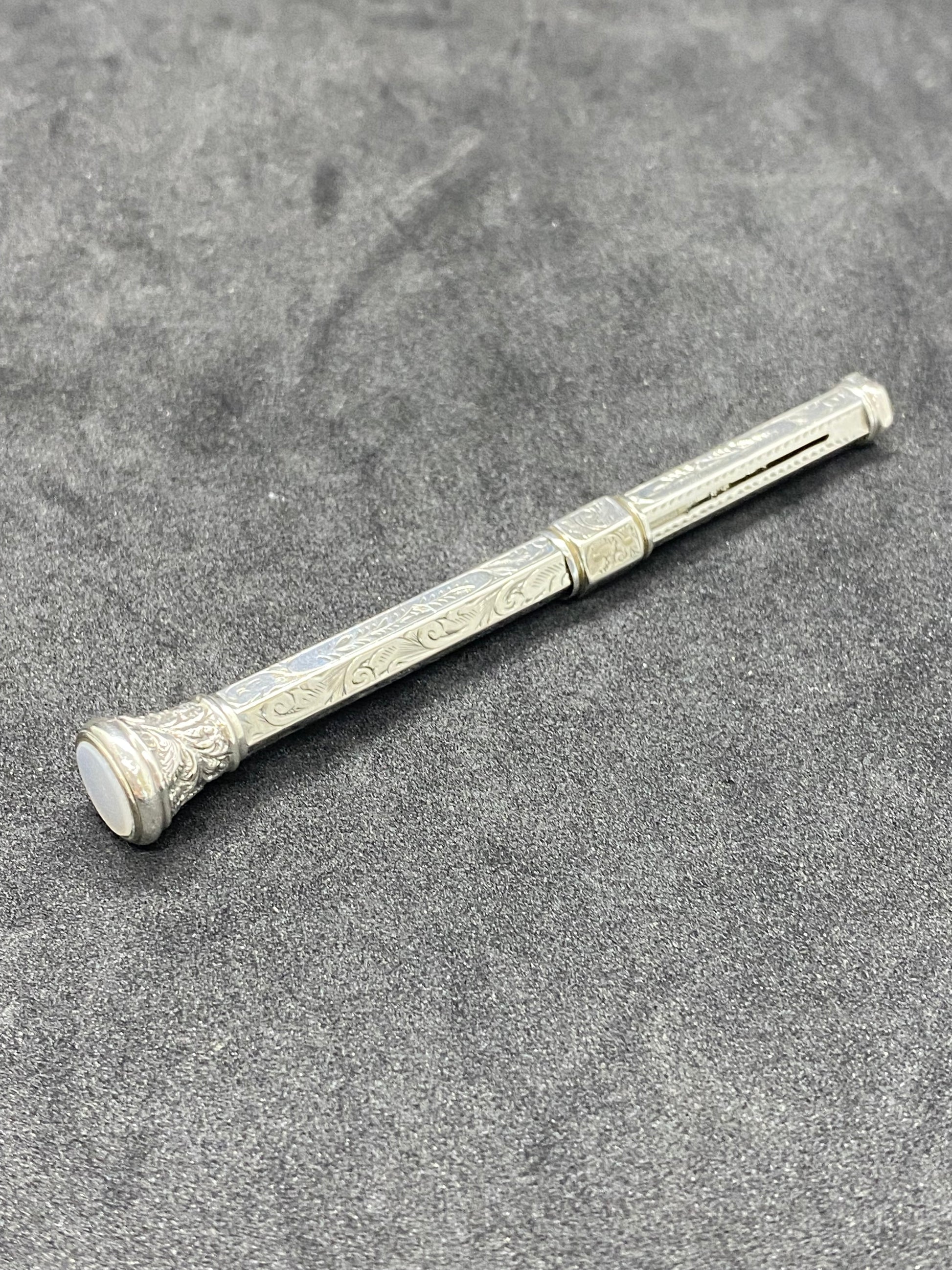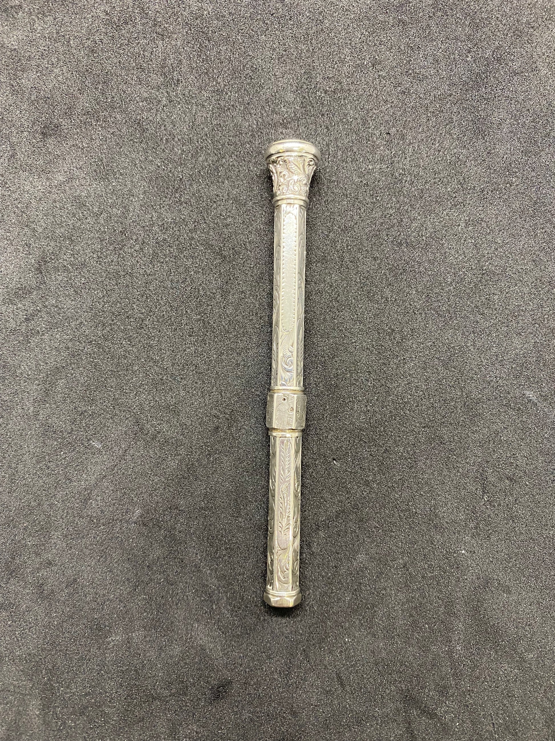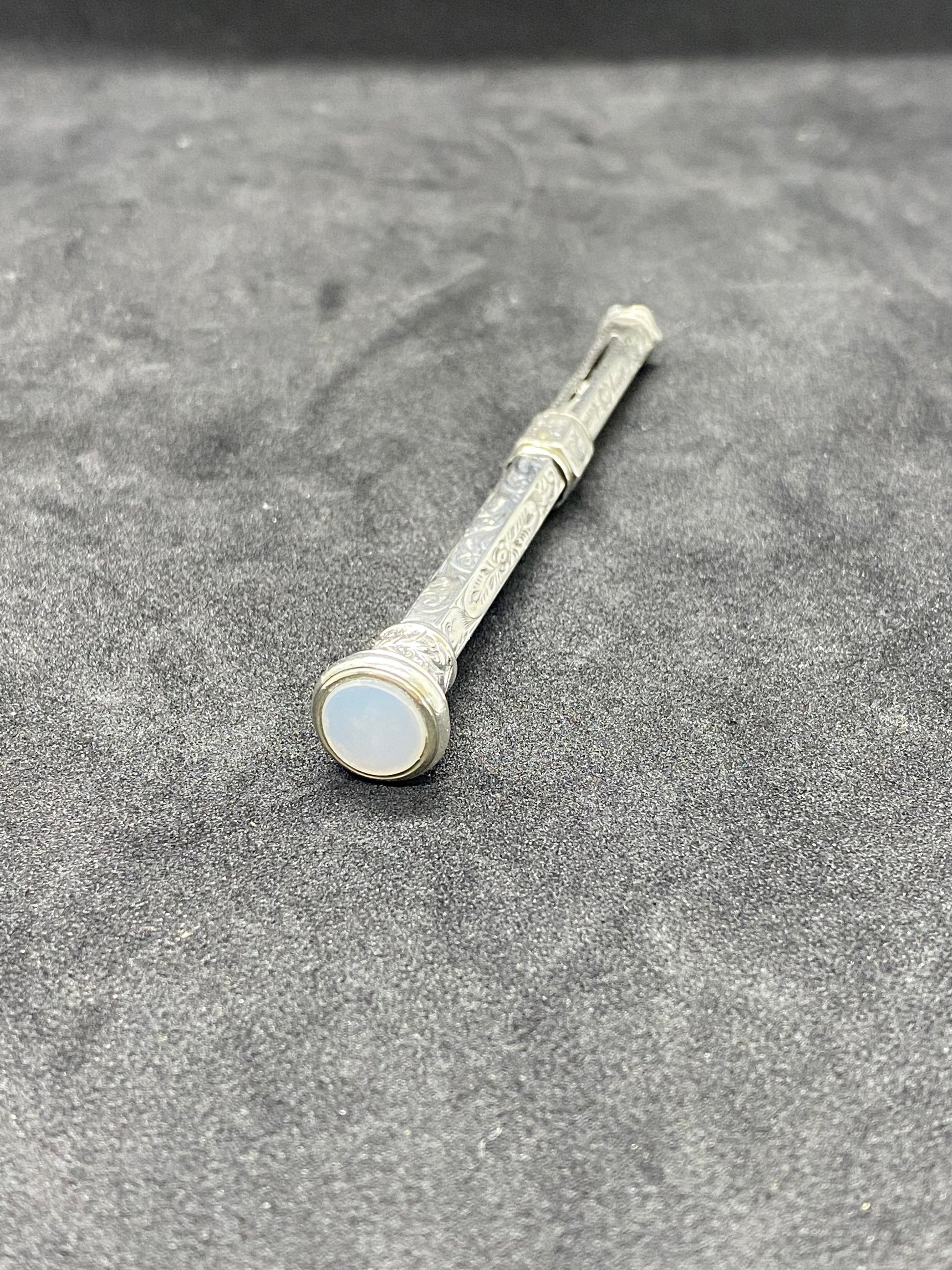 Un hermoso portaminas probablemente de finales de la época victoriana (fines del siglo XIX) fabricado en plata esterlina, rematado con un sello de ágata en blanco.
