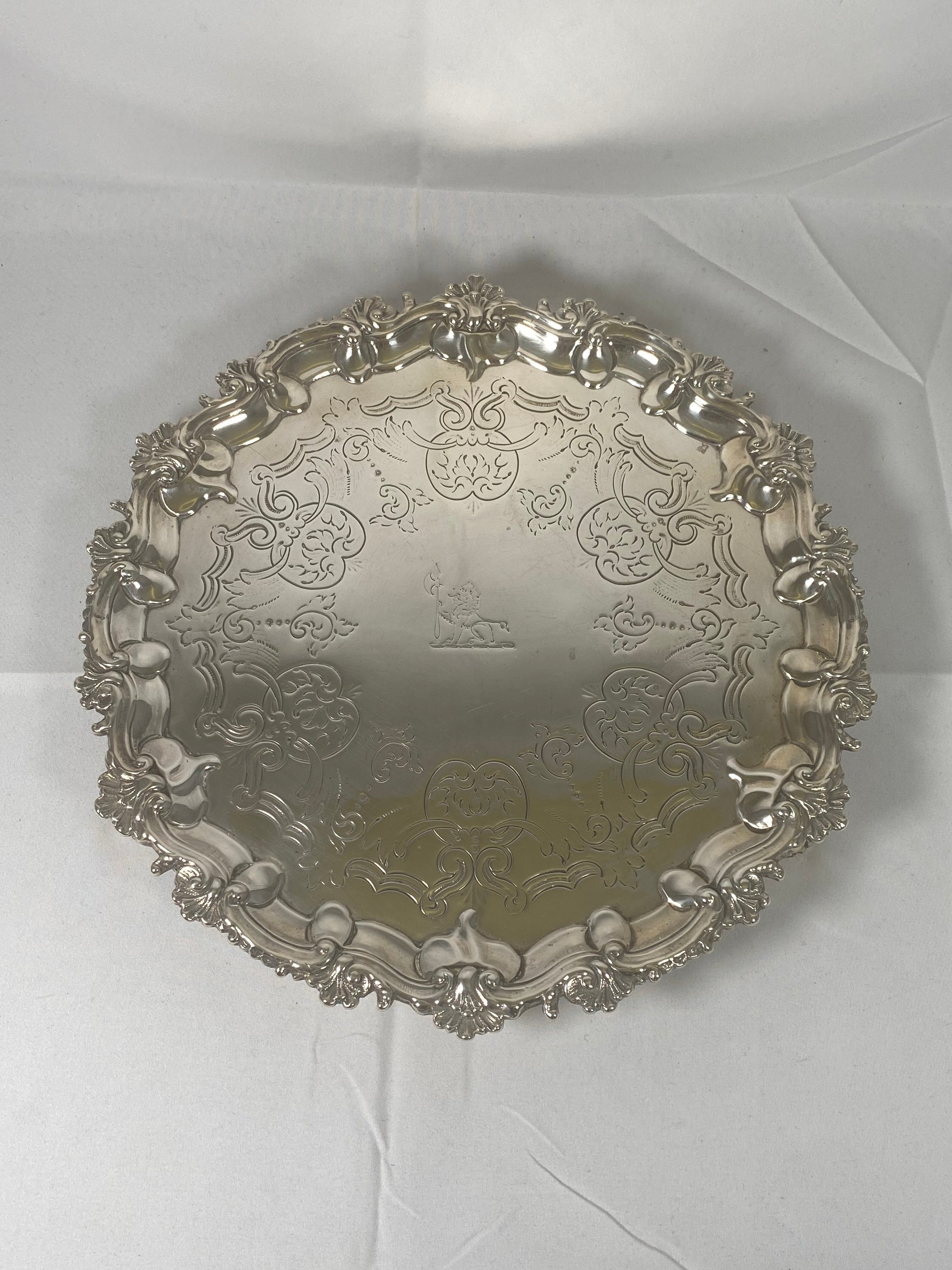 Esta bandeja para servir de plata esterlina de finales de la época victoriana luce las marcas del fabricante Goldsmiths Alliance, Londres, 1871. Bellamente grabada y con delicadas palmetas y detalles repujados en el borde, luce un escudo en el centro que representa a un león que porta una alabarda o hacha de guerra. Tradicionalmente, parece que muchas familias que usaban el león como parte de su escudo lo concedían debido a hazañas o hazañas militares. Lamentablemente, por ahora no hemos podido delimitar con mayor precisión el uso de este escudo.