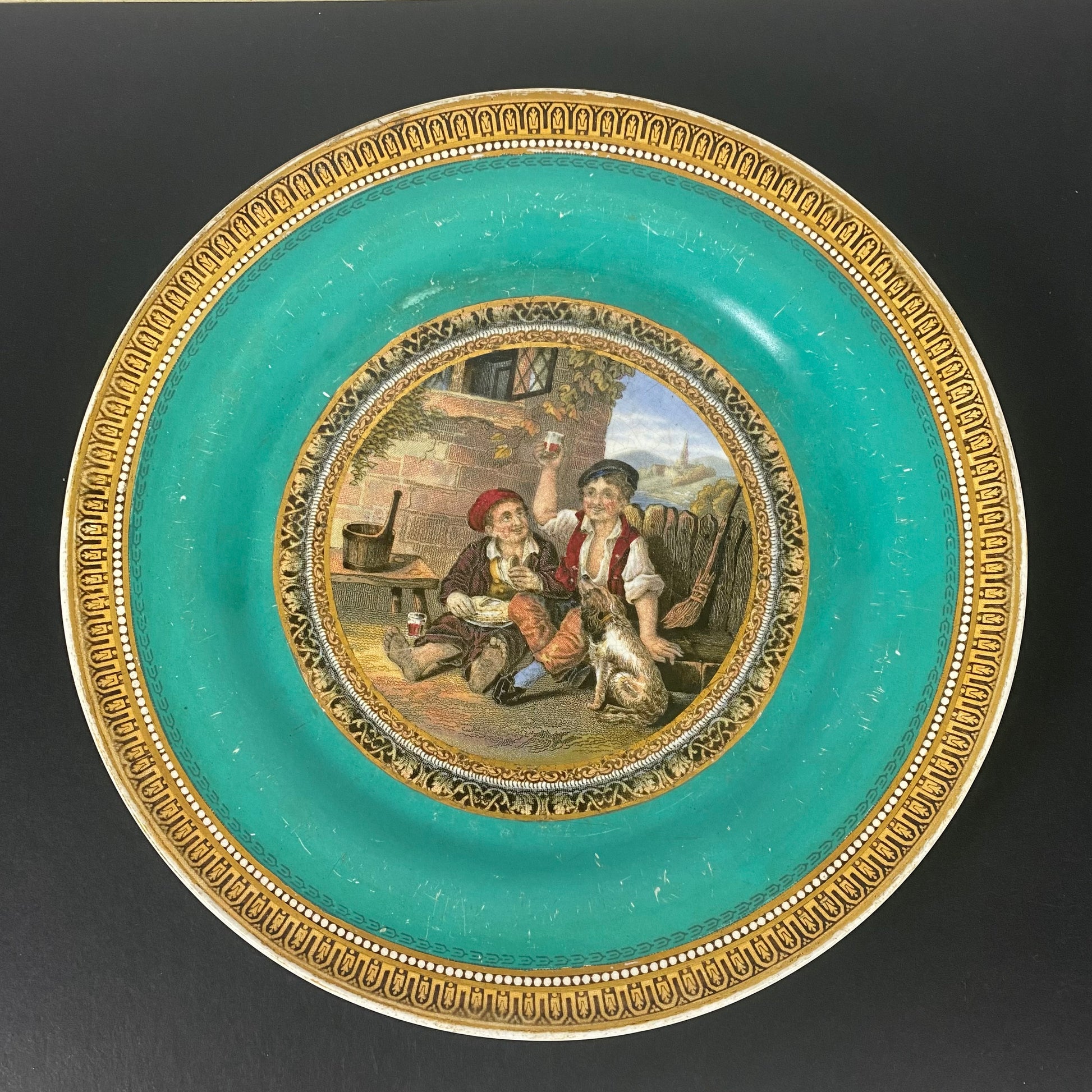 Un atractivo plato Prattware victoriano de alrededor de 1850-60, decorado con un fondo verde azulado/turquesa y una impresión de transferencia que representa una escena de peones agrícolas disfrutando de un buen pastel acompañado de cerveza.