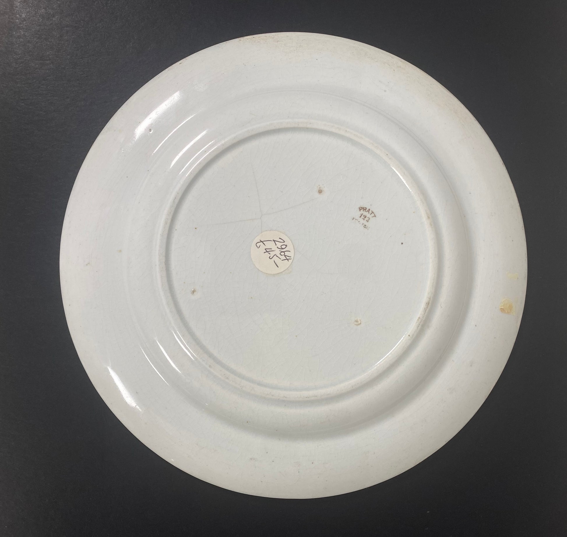 El fondo azul de la placa presenta un desgaste considerable, pero el diseño del borde y la propia transferencia están en muy buen estado. Presenta ligeras grietas acordes con la antigüedad y el desgaste. No presenta daños ni grietas importantes. Etiqueta de procedencia antigua de la primera compra del propietario original en Inglaterra hace varias décadas.
