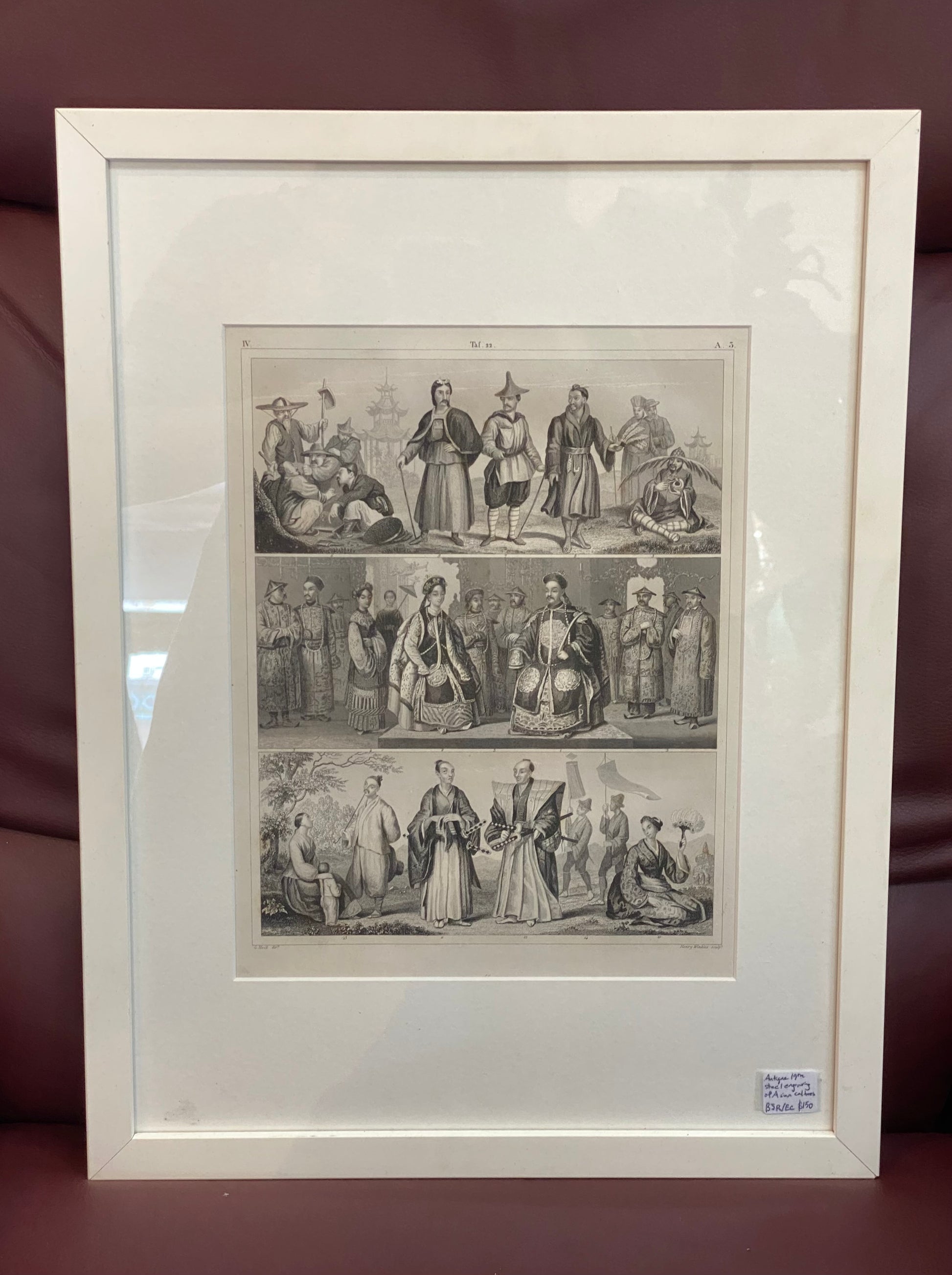 Este grabado en acero de mediados del siglo XIX es del destacado ilustrador, grabador e impresor Henry Winkles (1801-1860).  Trabajó con varios autores, siendo este grabado en particular de  La Enciclopedia Iconográfica de Ciencia, Literatura y Arte de G. Heck, publicada por R. Garrigue en 1852, fundó junto con Karl Ludwig Frommel el primer estudio de grabado en acero en Alemania. Representando las culturas de diversos países como India, China y Japón, esta obra es una fascinante y hermosa pieza histórica que muestra las perspectivas occidentales de la época.