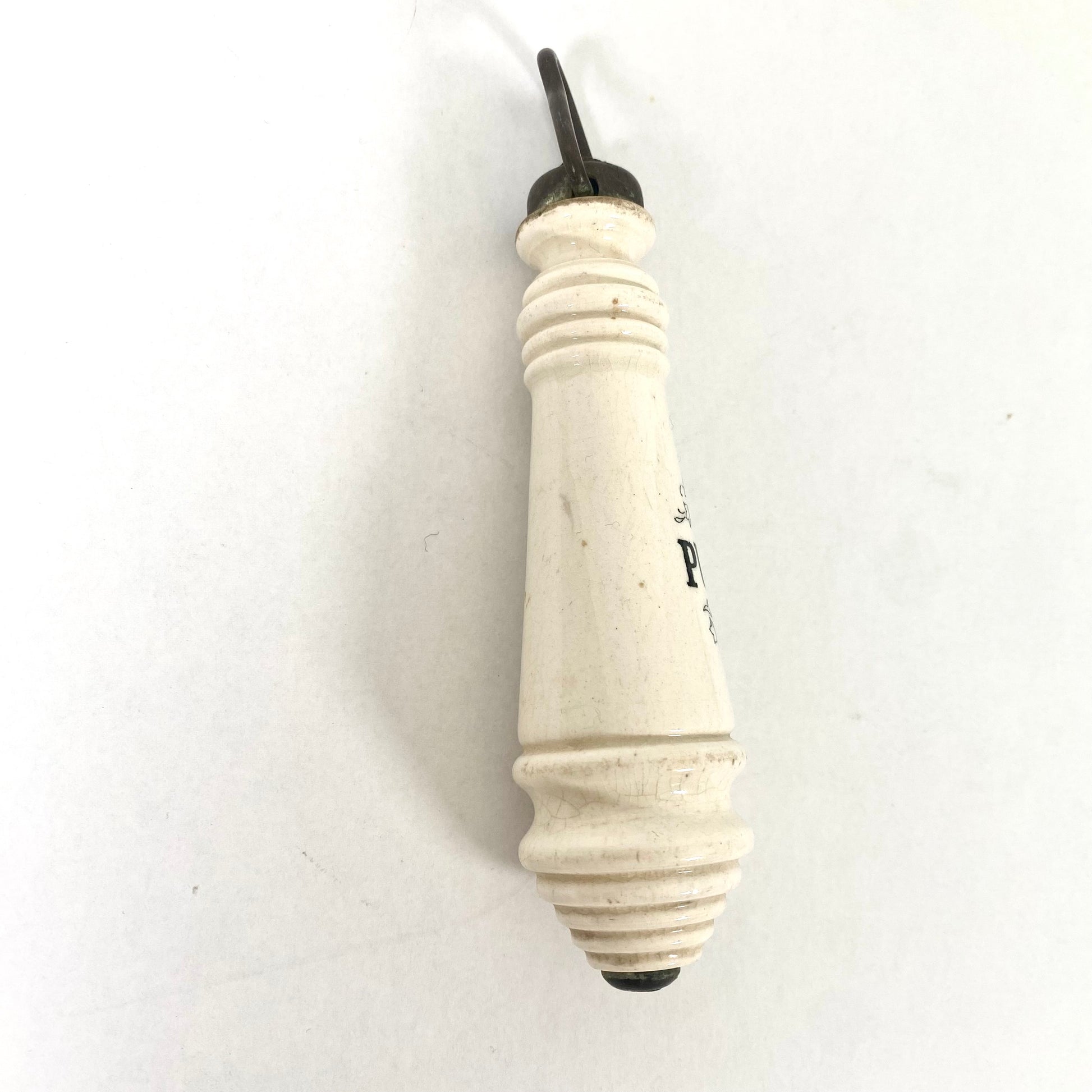 Este en particular presenta un motivo de colmena en la parte superior e inferior del asa, así como la palabra "PULL" estampada con un clásico motivo floral victoriano. Son extremadamente difíciles de encontrar y se encuentran entre las piezas más codiciadas por los coleccionistas de hardware.