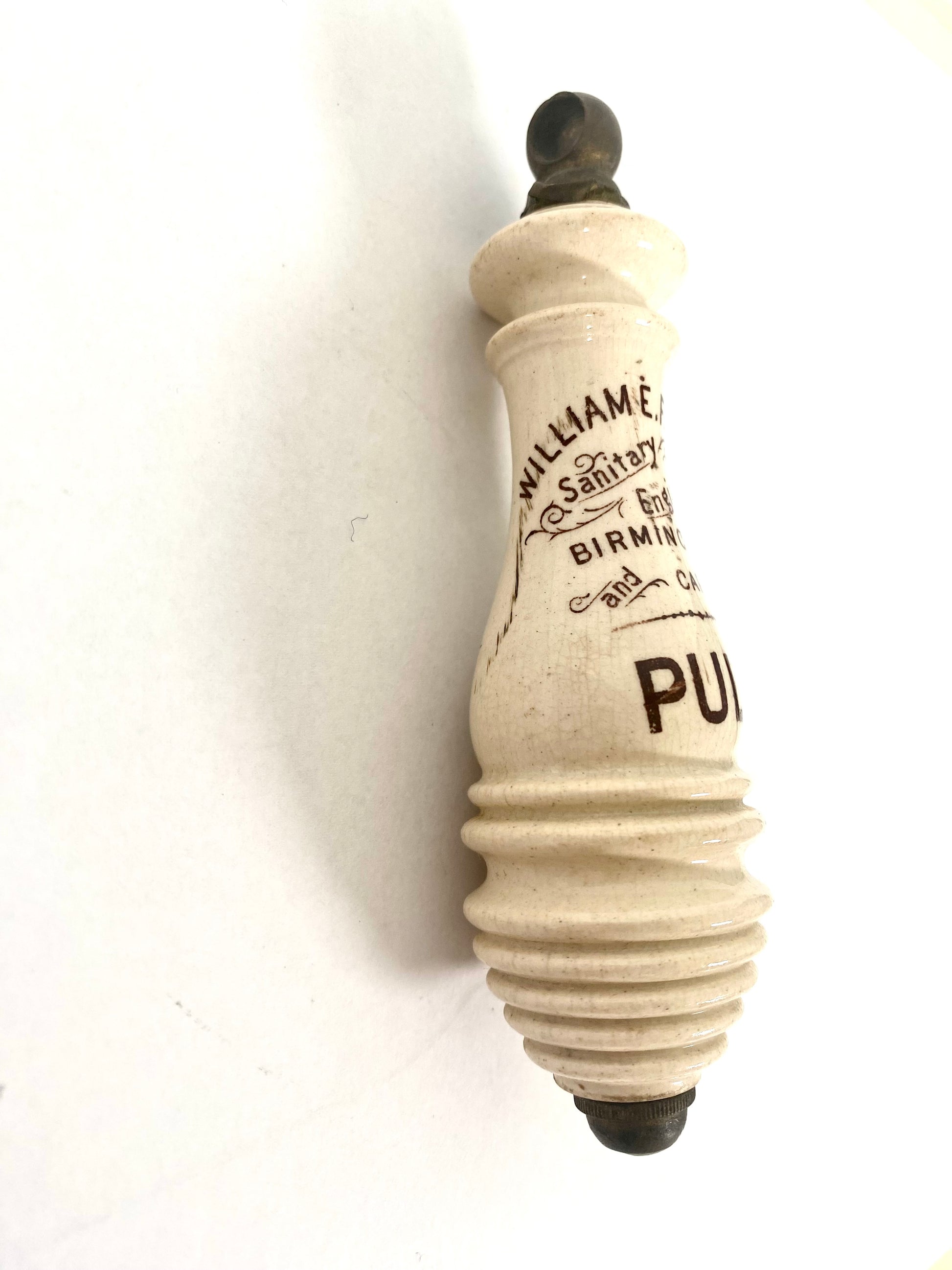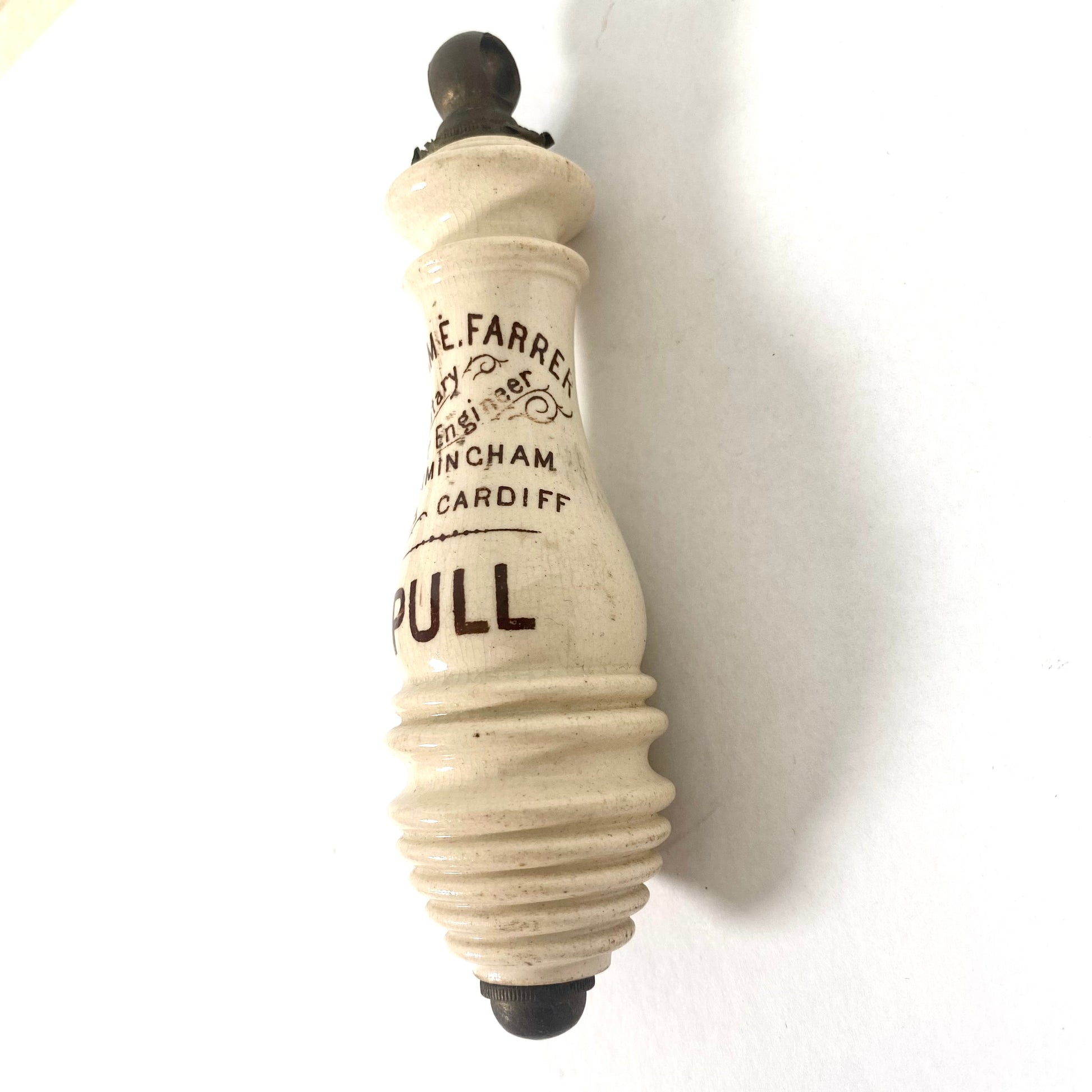 Este en particular presenta un motivo de colmena en la parte superior e inferior del asa, así como las palabras «William E Farrer / Ingeniero Sanitario / Birmingham / y / Cardiff» y la palabra «TIRE» estampada con motivos florales victorianos clásicos. William E. Farrer (1867-1931) parece haber estado activo hasta la década de 1920 y recibió premios por su trabajo. Este tirador en particular probablemente data de alrededor de la década de 1880-1890.