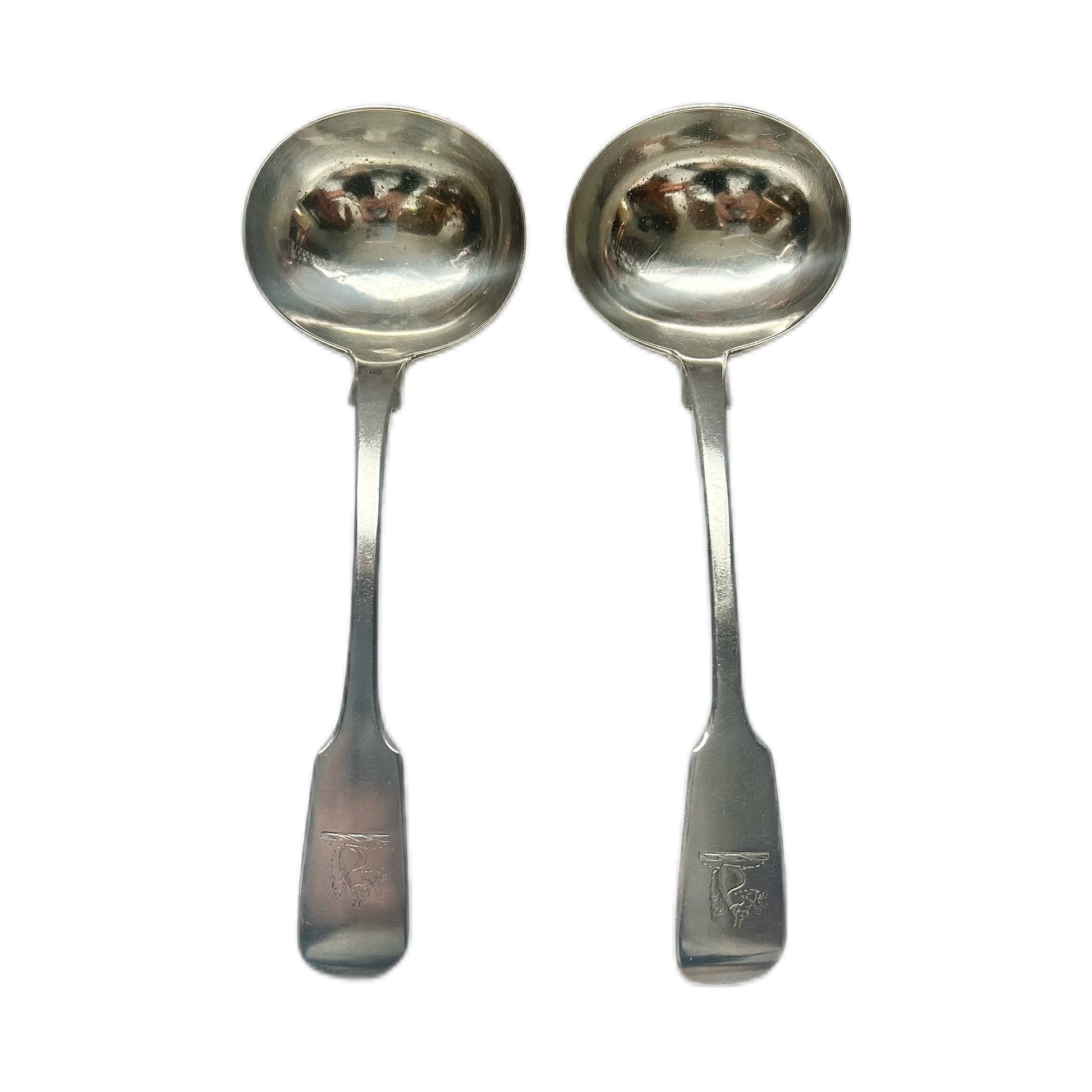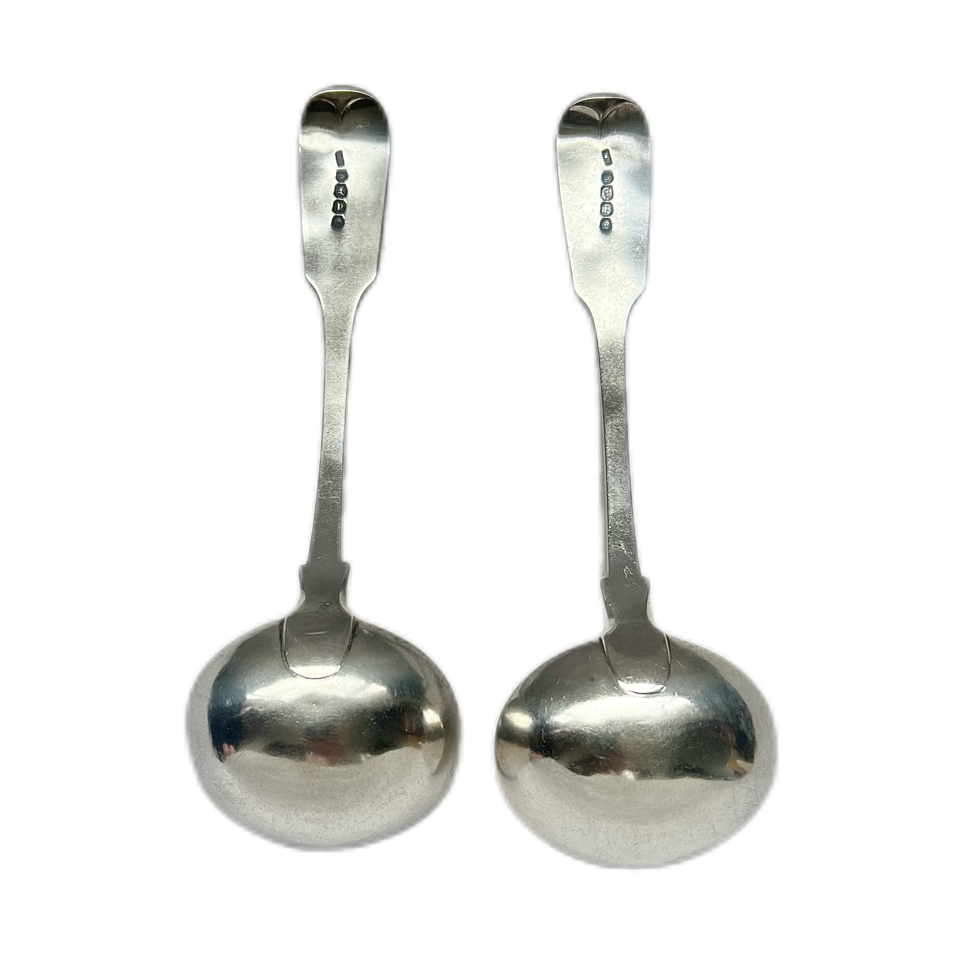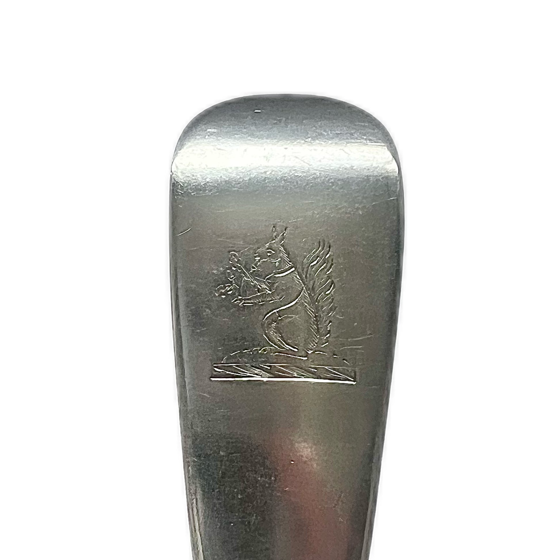 Here we have a beautiful pair of William IV antique sterling silver sauce ladles crested with a squirrel sejant, cracking a nut (leafed) which was the crest of the Norfolk branch of the Corbet Family. Both with assay marks for London, 1830, William Theobalds who was active from 1830 to 1843. The Corbet family is an aristocratic English family whose origins trace to the early Marcher lords post-Conquest, and once held the barony of Caus.