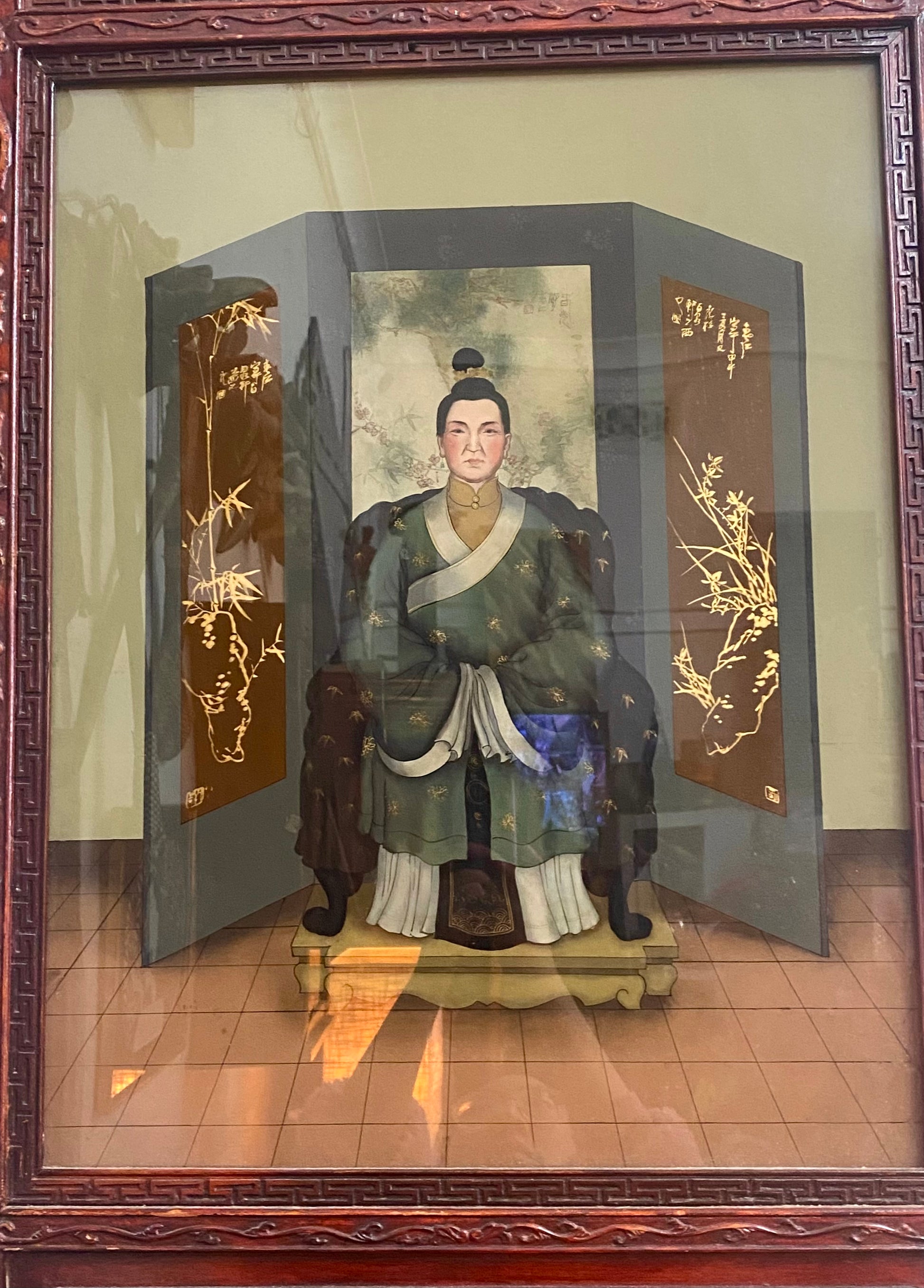 Los retratos de antepasados eran tradicionalmente muy venerados, y solo se comercializaron ejemplares tras las Guerras del Opio y la posterior intrusión occidental. Estos ejemplares con paneles de madera y pintura invertida son particularmente coleccionables, ya que, en aquel entonces, diversos factores los convirtieron en una forma de arte cada vez más exclusiva, lo que significa que existen muy pocos ejemplares del siglo XX con paneles de madera en el mercado. La inscripción poética que lo adorna lo hace especialmente distintivo; se trata de uno de los grandes poemas jue ju de Du Fu, conocido en español como " Dos oropéndolas cantan en los verdes sauces". Du Fu, conocido como el Sabio Poeta en la literatura y la cultura chinas, es reconocido por su talento, su estilo amplio, su compasión por la gente común y su patriotismo por su país.