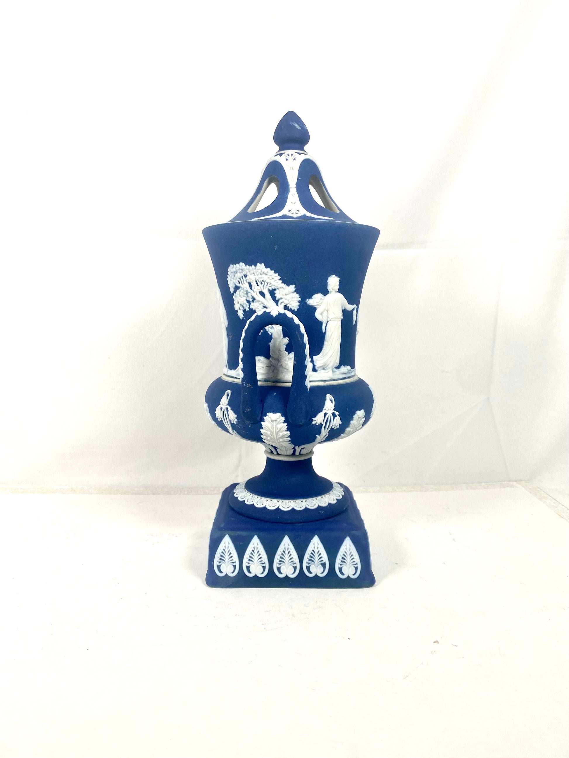 Jarrón/urna con tapa de popurrí de jaspe cobalto de Adams of Tunstall, victoriano antiguo/siglo XIX, raro